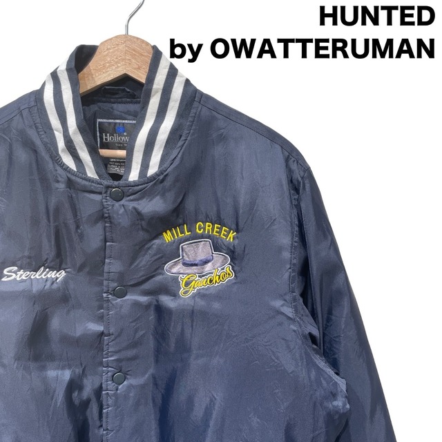 【サイズ】 サイズ表記: Mサイズ - 肩幅 50cm - 身幅 60cm - 着丈 68.5cm - 袖丈 66.5cm 【カルチャー的背景】 スタジアムジャケットは高校や地域のスポーツチーム由来のユニフォームとして長く使われてきたアイテムで、胸のチーム名刺繍やネーム刺繍がそのまま残ることで当時のチームウェア感がそのまま残るのが魅力。 この個体はHollowayのタグ表記とMade in Vietnamの生産国表示、キルティング裏地とナイロンシェルの構成から、90sのスポーツ/スクールウェア系の作りに沿った一着と推定される。リブの配色やスナップフロントなど、フィールドでの実用性を重視した仕様が特徴。 【商品概要】 ・ブランド:Holloway ・アイテム:刺繍入り ナイロンスタジアムジャケット ・カラー:ネイビー(襟・袖・裾にホワイトライン入りリブ) ・素材:シェル:ナイロン、裏地/中綿:ポリエステル(キルティング仕様) ・生産国:Made in Vietnam ・サイズ表記:M ・推定年代:90s 【スタジアムジャケットとしての特徴】 程よくゆったりしたボックスシルエットで、リブでウエストと袖口が締まる典型的なスタジアムジャケットの作り。 スナップボタン開閉、サイドの斜めポケット、胸にチーム名(MILL CREEK Gauchos)とネーム(Sterling)の刺繍入り。 光沢のある薄手ナイロンシェルにキルティング裏地を組み合わせており、軽い防風性と保温性を両立する仕様。ポケット脇にブランドの小さなタグ(Holloway)あり。 表面には使用に伴う細かなシワが見られるが、デザイン性を損なうような大きな損傷は見受けられない。 【オワッテルマンのおすすめポイント】 ・チーム刺繍で1枚で雰囲気が出る ・ネイビー基調で着回ししやすい ・キルティング裏地で春、秋の羽織りに最適 ・スナップ仕様で着脱がラク ・程よいゆるさでストリート〜ワーク寄りまで対応 【注記】 ・こちらはオンライン限定販売です。オワッテルマン実店舗では購入出来ませんのでご注意ください。 ・発送は火水金がメインです。ご購入のタイミングによっては4日ほど発送まで時間が空く場合がありますのでご了承のほどよろしくお願いします。