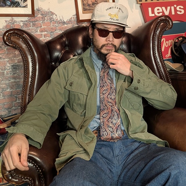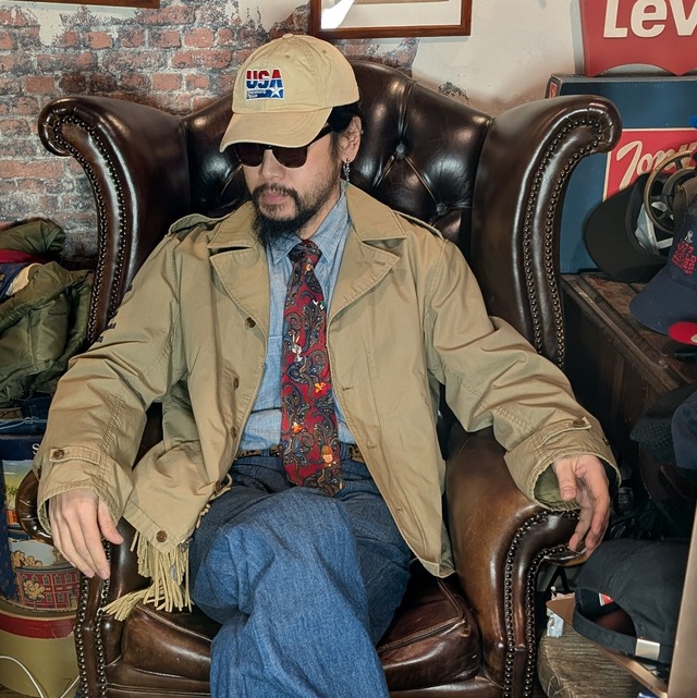 — ワークとトラッドの境界にあった“実用品の赤” — 【カルチャー的背景】 80–90's/エリア:USA/ジャンル:アメリカントラッド × ワーク × 日常着 本品は Puritan による80〜90年代のシルクネクタイ。 PuritanはブルックスやJ.PRESSのような エリート校・アイビーの象徴的ブランドではなく、 より生活者寄りのアメリカントラッドを担っていた存在。 地方都市のオフィスワーカーや、 ワークとドレスを行き来する中間層に向けた 「気を張らずに使えるネクタイ」を多く生産していたブランドです。 【商品概要】 ・ブランド:Puritan ・アイテム:ネクタイ ・年代:1990年代 ・カラー:レッド ・柄:無地調(シルク地紋) ・素材:シルク(STAIN RESISTANT表記) ・生産国:USA企画 ・状態:良好(目立つダメージなし) 【アメカジ/トラッド文脈での成立理由】 このネクタイの肝は、 色で主張し、柄で語らない点にあります。 ・無地ベースだが、織りでわずかに表情が出るシルク ・光沢は控えめで、実用品寄りの質感 ・STAIN RESISTANT=日常使用前提 そのため、 ・シャンブレーシャツ ・デニムジャケット ・ミリタリージャケット といったカジュアル寄りのアメカジに合わせても、 Vゾーンだけがドレスに振り切れない。 いわゆる 「ネクタイだけ浮く」現象が起きにくい一本です。 【スタイリング提案】 ・デニムオンデニムの色差調整 ・ミリタリージャケットの土臭さを締める役 ・プレッピーというより“生活感のあるトラッド” 赤は主張色ですが、 この個体は派手さではなく体温のある赤。 ワーク由来のスタイルに自然に溶け込みます。 【オワッテルマン的まとめ】 これは 勝負ネクタイではない。 日常を少しだけ整えるネクタイ。 だからこそ、 アメカジ×ネクタイという 一段上のスタイリングが成立する