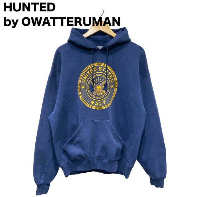 【サイズ】 - Lサイズ相当 - 肩幅 64cm - 身幅 59cm - 着丈 63cm - 袖丈 53cm 【カルチャー的背景】 軍のシールや大判のレタリングを用いたパーカーは、ミリタリーのトレーニングウェアや土産物として広く作られ、カジュアルウェアに落とし込まれてきた流れがある。 この個体はフロントに円形のシール風デザイン、バックに大きな「NAVY」レタリングを配した両面プリント仕様で、ミリタリーテイストをそのままストリートに取り入れやすい作りになっている。 【商品概要】 ・ブランド:不明 ・アイテム:両面プリント プルオーバーパーカー ・カラー:ネイビー×イエロー ・素材:コットン混紡(裏起毛風) ・生産国:不明 ・サイズ表記:不明 ・推定年代:90s 【パーカーとしての特徴】 身幅が広く肩落ちのゆったりシルエットで、ざっくりとした着用感になる一着です。 厚手の裏起毛風ボディで保温性があり、フロントにカンガルーポケットを備えた定番的な作りです。 フロントは円形のシール風プリント、バックは大きなブロック体ロゴの両面プリントで存在感のあるビジュアルです。 ポケット付近やボディに小さな点状の色抜け・薄い汚れが見られる状態です。 【オワッテルマンのおすすめポイント】 ・大判プリントで1枚で主役になるビジュアル ・ネイビーをベースにイエローが効いていてコーデに取り入れやすい ・肩落ちのゆったりシルエットでレイヤードがしやすい ・厚手の裏起毛で秋冬のカジュアルスタイルに最適 【注記】 ・こちらはオンライン限定販売です。オワッテルマン実店舗では購入出来ませんのでご注意ください。 ・発送は火水金がメインです。ご購入のタイミングによっては4日ほど発送まで時間が空く場合がありますのでご了承のほどよろしくお願いします。