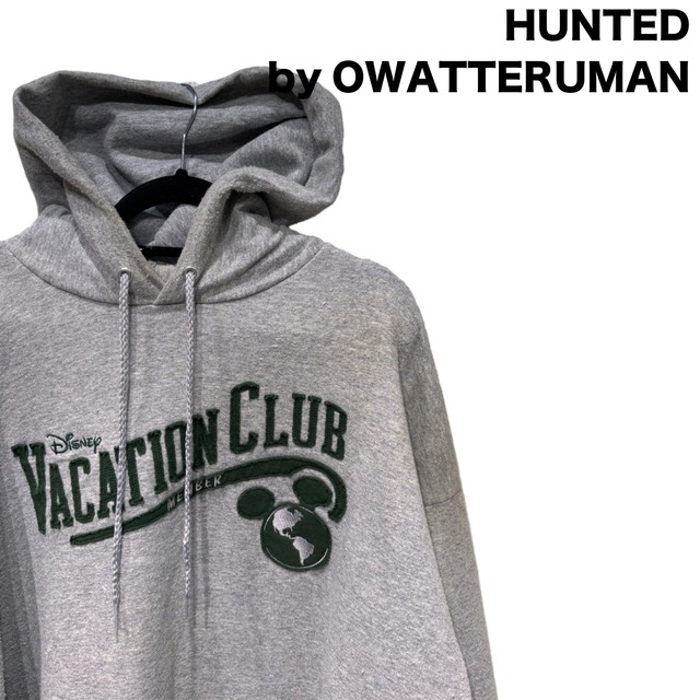 【サイズ】 - サイズ表記 ADULT XL - 肩幅 72cm - 身幅 73cm - 着丈 74cm - 袖丈 64cm 【カルチャー的背景】 ディズニーパークのロゴや「VACATION CLUB」のチェンイル(パイル刺繍)とミッキー耳型の地球ワッペンを組み合わせた、パーク土産的なデザインのプルオーバーパーカー。首内側のタグにある "Disney Parks AUTHENTIC · ORIGINAL" 表記、素材タグの "50% PRESHUNK COTTON / 50% POLYESTER" と "MADE IN HONDURAS" の併記から、いわゆる2000年代以降にパークで流通していた量産タイプの一着と推定(タグ仕様・素材表記・生産国を根拠に推定)。アメリカのテーマパーク商品らしいロゴ使いと、チェンイル刺繍で立体感を出した作りが特徴。 【商品概要】 ・ブランド:Disney Parks ・アイテム:プルオーバーパーカー(チェンイル刺繍+ワッペン/カンガルーポケット) ・カラー:ライトグレー(ボディ)×ダークグリーン(ロゴ・ワッペン) ・素材:50% preshrunk cotton / 50% polyester(タグ表記) ・生産国:Honduras(タグ表記) ・サイズ表記:ADULT XL(タグ表記) ・推定年代:00s〜(タグ仕様・素材表記・生産国からの推定) 【パーカーとしての特徴】 裏起毛の中厚手スウェット生地にチェンイルと刺繍ワッペンを組合わせた王道のプルオーバーパーカー。ドロップショルダーで身幅・着丈ともに大きめのオーバーサイズシルエット(実寸で肩幅72/身幅73cm)なので、レイヤードに適したゆったり感。フードは二枚仕立てでドローコードは編み紐、ハトメ付き。フロントはジップなしの被り仕様でカンガルーポケットあり。内側は起毛で保温性がある一方、肩〜胸周りやフード内側に毛羽立ち・毛玉、前身頃に薄い茶色の点状の汚れ(シミ)が確認できるため、ユーズドとしての風合いが強い個体です。 【オワッテルマンのおすすめポイント】 ・王道のディズニーパーク土産デザインで普段使いに馴染む ・チェンイル+ワッペンで立体感のあるフロントデザイン ・ゆったりしたXLサイズでビッグシルエット好きにジャスト ・裏起毛でこれからの季節のアウター代わりにも使える ・古着感(毛玉・薄シミ)を味として受け入れられる人向け 【注記】 ・こちらはオンライン限定販売です。オワッテルマン実店舗では購入出来ませんのでご注意ください。 ・発送は火水金がメインです。ご購入のタイミングによっては4日ほど発送まで時間が空く場合がありますのでご了承のほどよろしくお願いします。