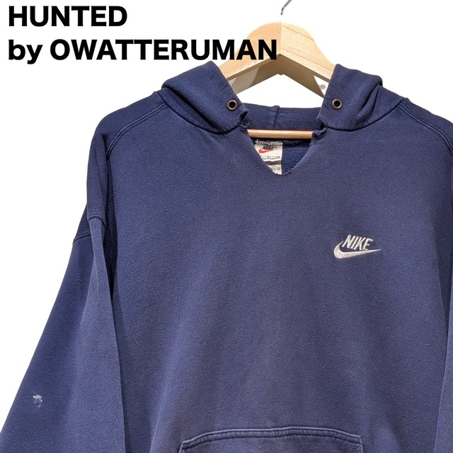 【サイズ】 - 肩幅 60cm - 身幅 61cm - 着丈 68cm - 袖丈 59.5cm 【カルチャー的背景】 フード付きスウェットはスポーツウェアからストリート、ワークと横断的に使われてきた定番アイテムだ。 この個体はシンプルなワンポイント刺繍とプルオーバー仕様で、普段使いの羽織りとして馴染みやすい作りになっている。 【商品概要】 ・ブランド:NIKE ・アイテム:スウェットパーカー(プルオーバー) ・カラー:ネイビー ・素材:95% COTTON / 5% POLYESTER ・生産国:Made in U.S.A. ・サイズ表記:L ・推定年代:90s 【スウェットパーカーとしての特徴】 やや肩が落ちるドロップショルダーのオーバーサイズシルエットで、ゆったりとした着心地が得られる作りです。 首元はV字のノッチ仕様で古着らしい表情が出るディテールになっているのが特徴です。 フードにはハトメ付きでドローコードは欠損しており、カンガルーポケットとリブ仕様の袖口・裾で基本構成が整っています。 胸には小さめのスウッシュ刺繍入りで主張控えめな見た目です。 右袖や前身頃に点状のペンキ飛びや擦れ、フード周りのステッチほつれなど使用感が見られるコンディションです。 【オワッテルマンのおすすめポイント】 ・USA製タグの雰囲気がしっかり出てる一枚 ・小さめの胸刺繍でコーデしやすい ・ゆったりシルエットでレイヤード向き ・Vノッチの古着感がアクセントになる ・カンガルーポケットで実用性も確保 【注記】 ・こちらはオンライン限定販売です。オワッテルマン実店舗では購入出来ませんのでご注意ください。 ・発送は火水金がメインです。ご購入のタイミングによっては4日ほど発送まで時間が空く場合がありますのでご了承のほどよろしくお願いします。