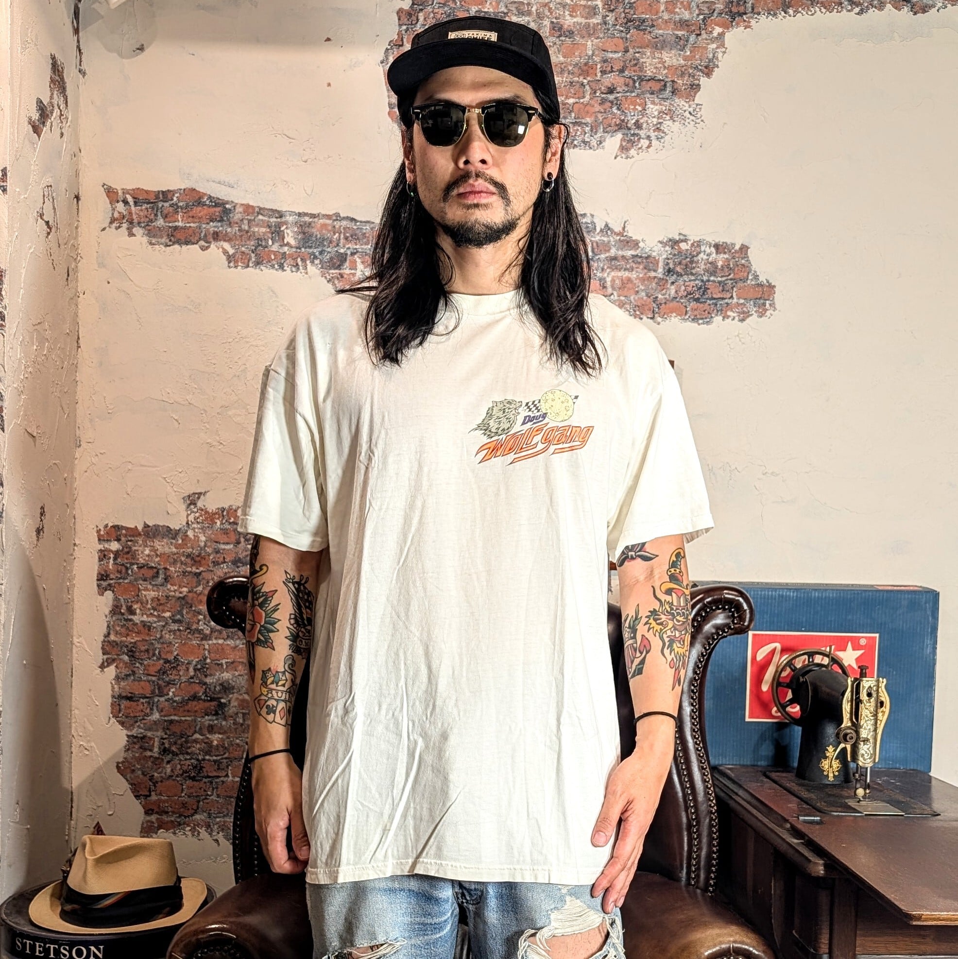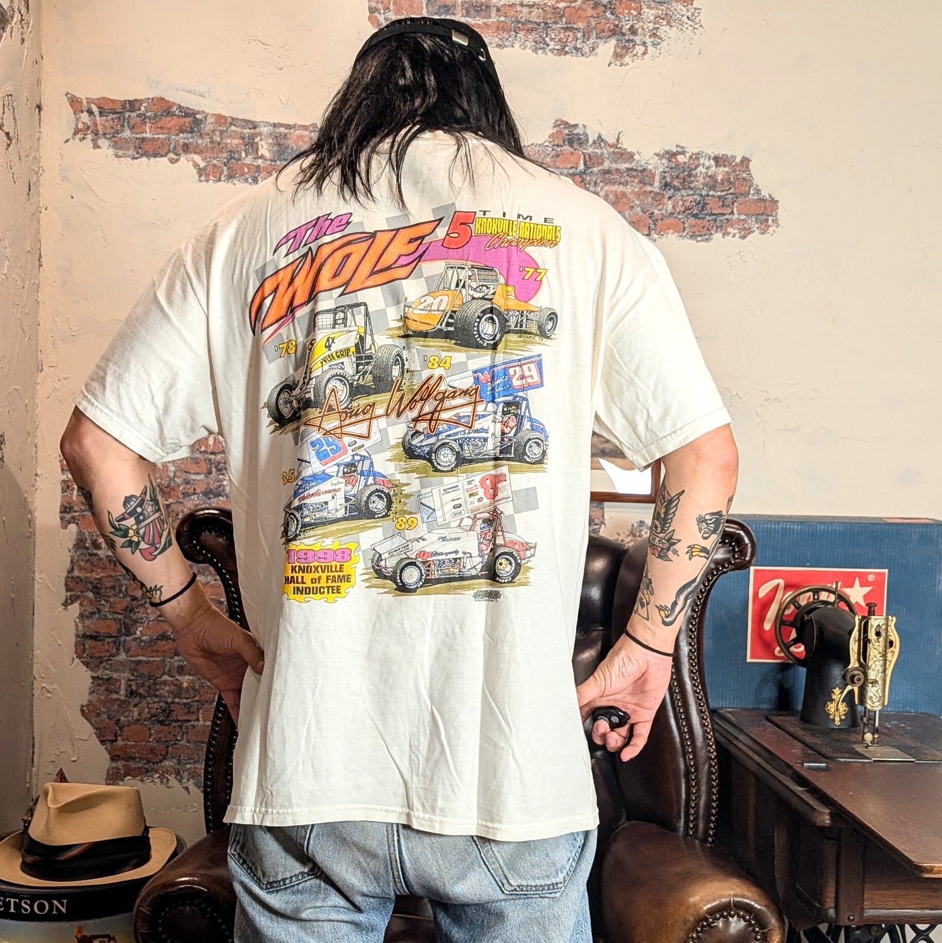スプリントカー・レースの聖地とも言えるKnoxville Raceway(アイオワ州)で、5度のナショナル優勝を成し遂げた伝説のドライバー、Doug WolfgangのメモリアルTシャツ。1998年にKnoxville Hall of Fame入りを果たしたタイミングでの記念デザイン。複数の時代別マシンが並ぶバックプリントは圧巻で、ファン垂涎の一枚。