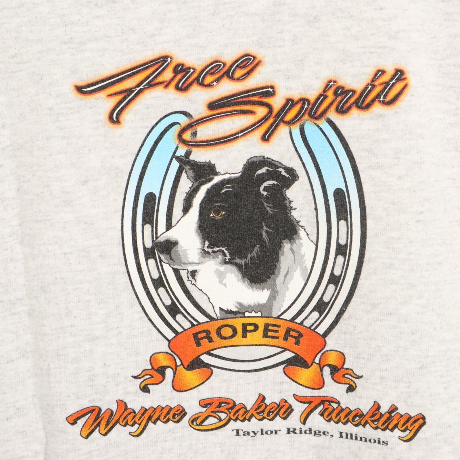 イリノイ州のTaylor Ridgeを拠点とする運送会社「Wayne Baker Trucking」のプロモーションTシャツ。「Free Spirit」というスローガンのもと、馬と犬をモチーフにした独自のビジュアル展開が特徴的で、地域密着型の企業文化とアニマルアイコンの融合が光る一枚です。