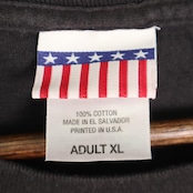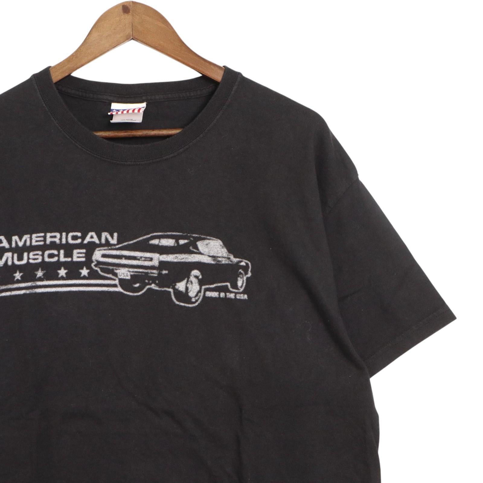 “AMERICAN MUSCLE”の文字とマッスルカーのシルエット、そして「MADE IN THE USA」の文言があしらわれた一枚。特定ブランドのプロモーションではなく、カーカルチャーそのものを讃える汎用的なTシャツと見られます。タグデザインは星条旗モチーフで、ローカル製作感の強いアイテムです。