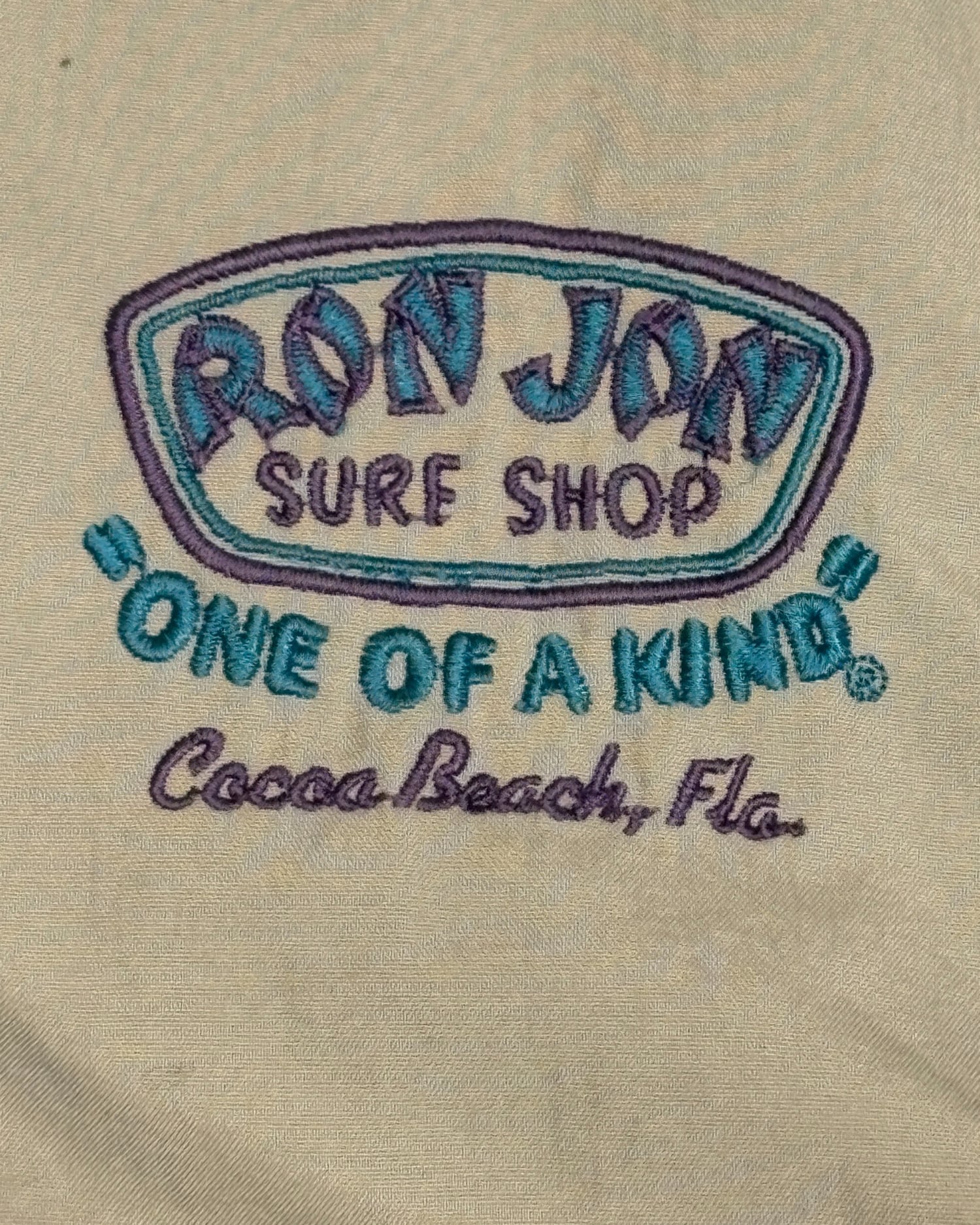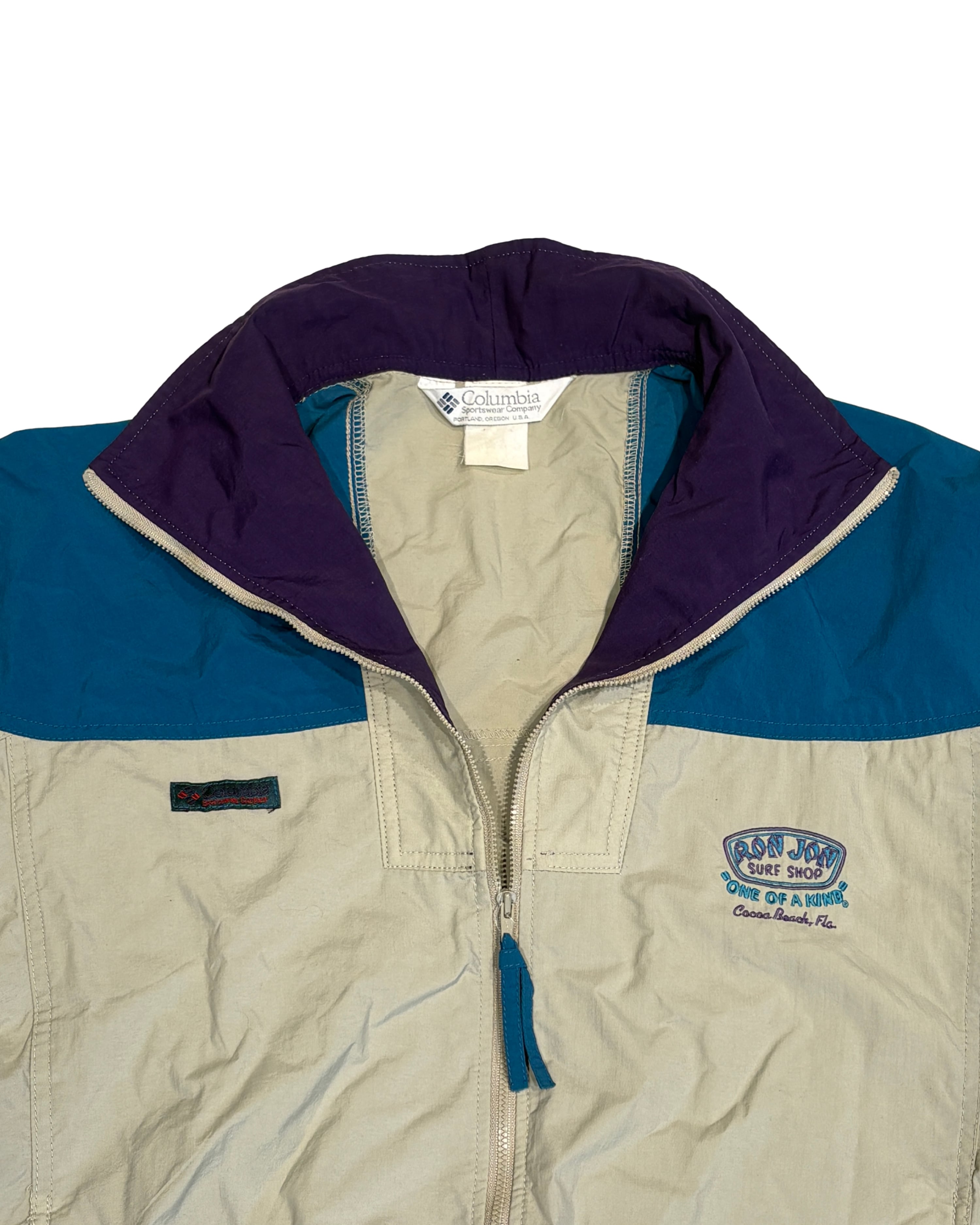 → RON JON SURF SHOPはフロリダ・ココアビーチを拠点とする老舗サーフショップ。本個体はColumbia Sportswearとのダブルネーム仕様で、1990年代のアウトドア×サーフカルチャーが交差した文脈のライトアウター。