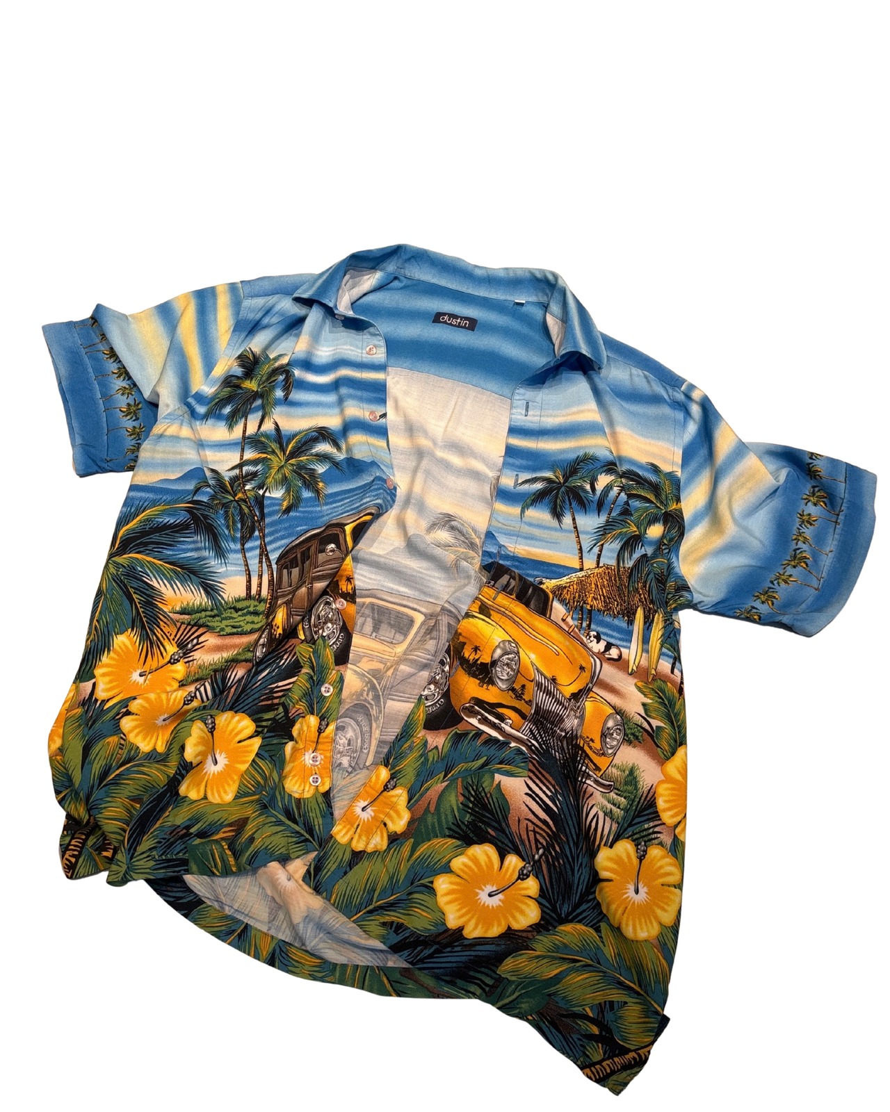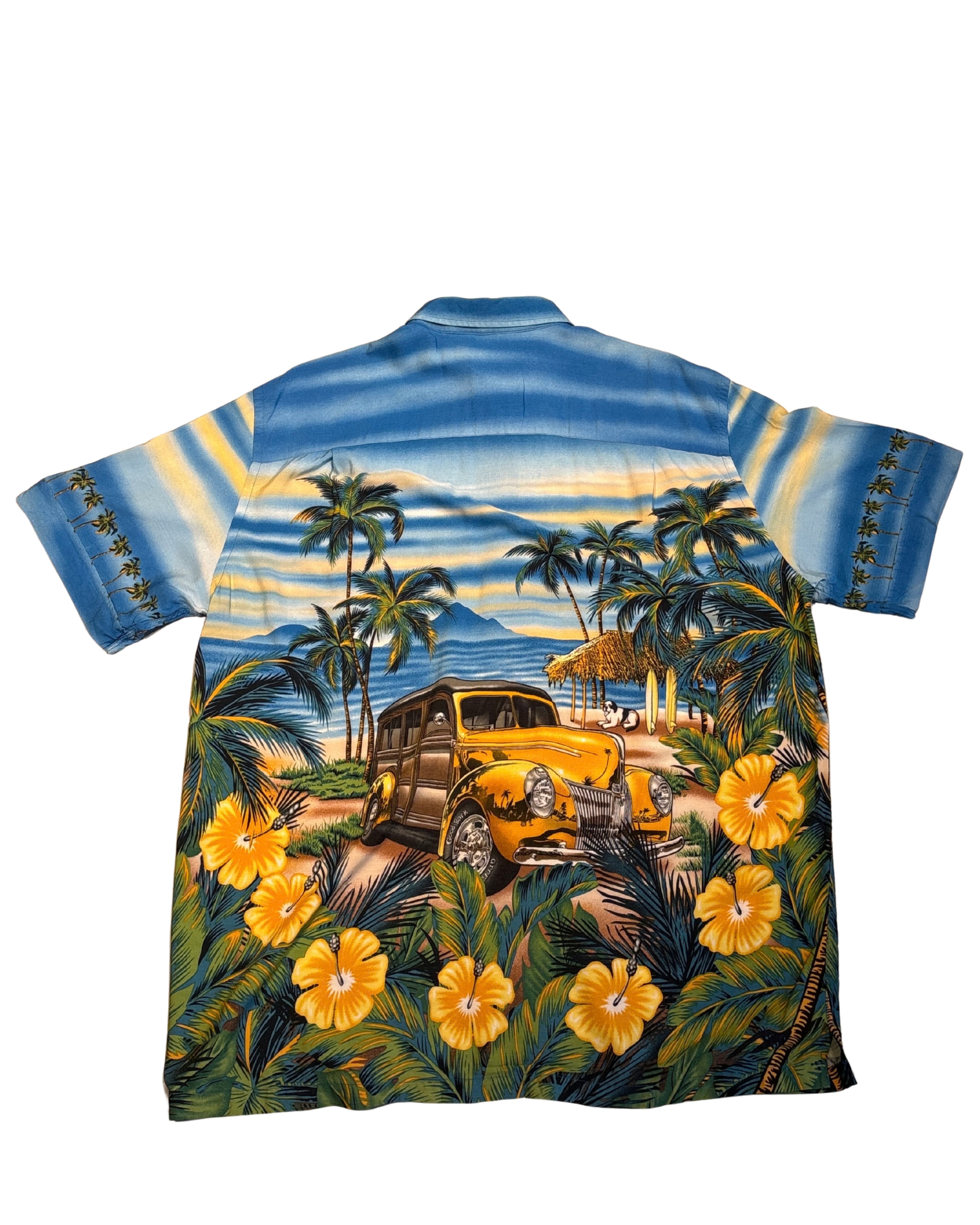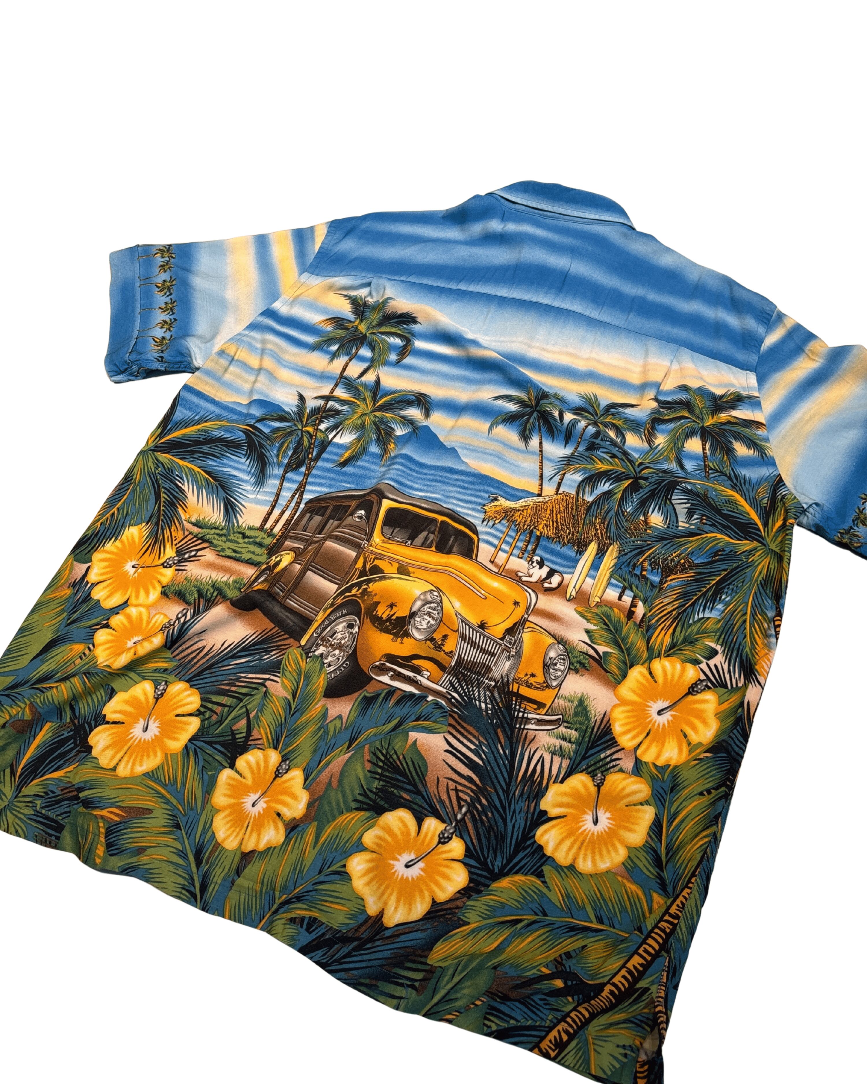→ ヤシの木、ビーチ、クラシックカーをモチーフにした全面プリントのハワイアンシャツ。観光地向け・リゾートウェア文脈で流通していたアイテムで、実用性よりもビジュアルを重視したデザイン。