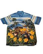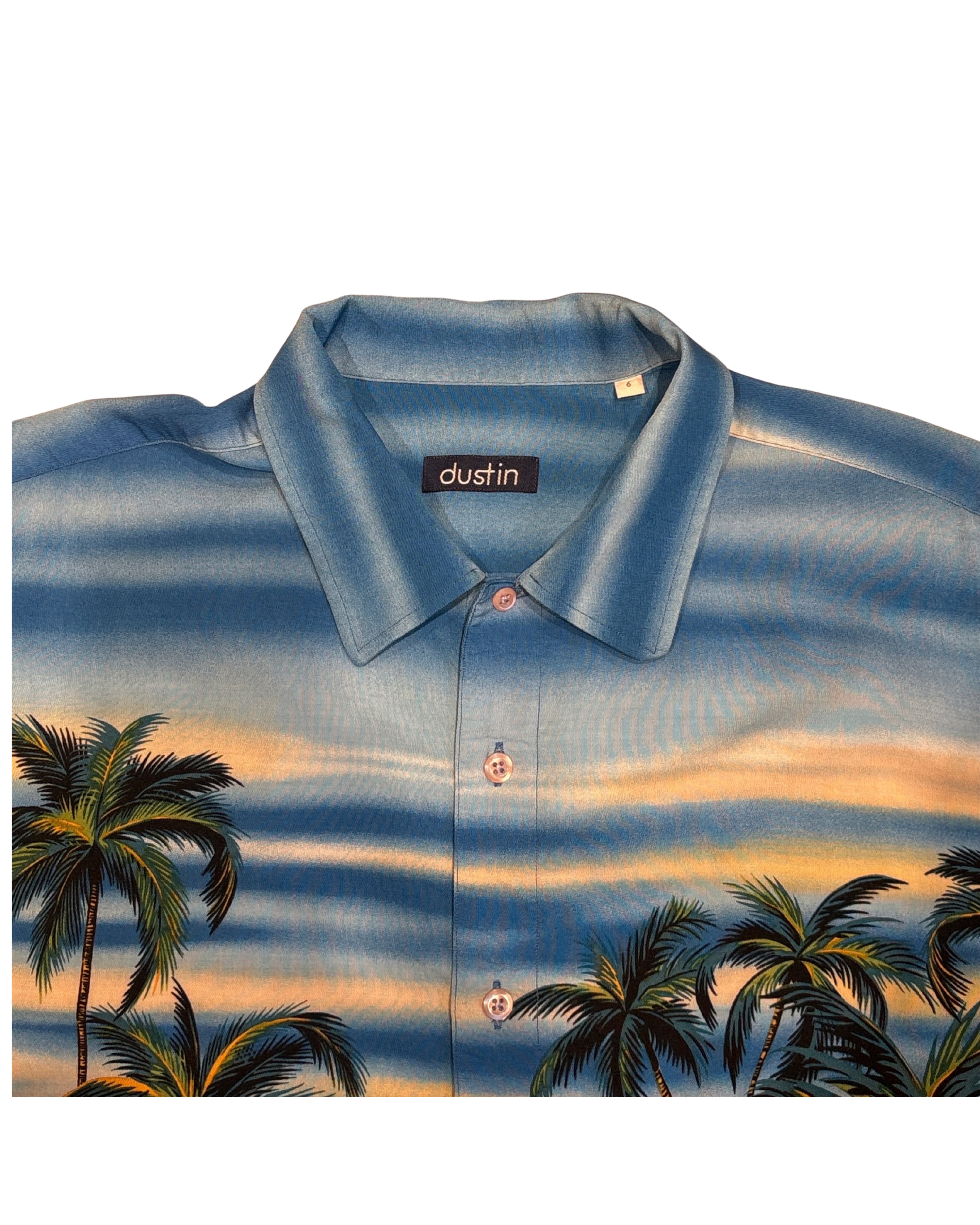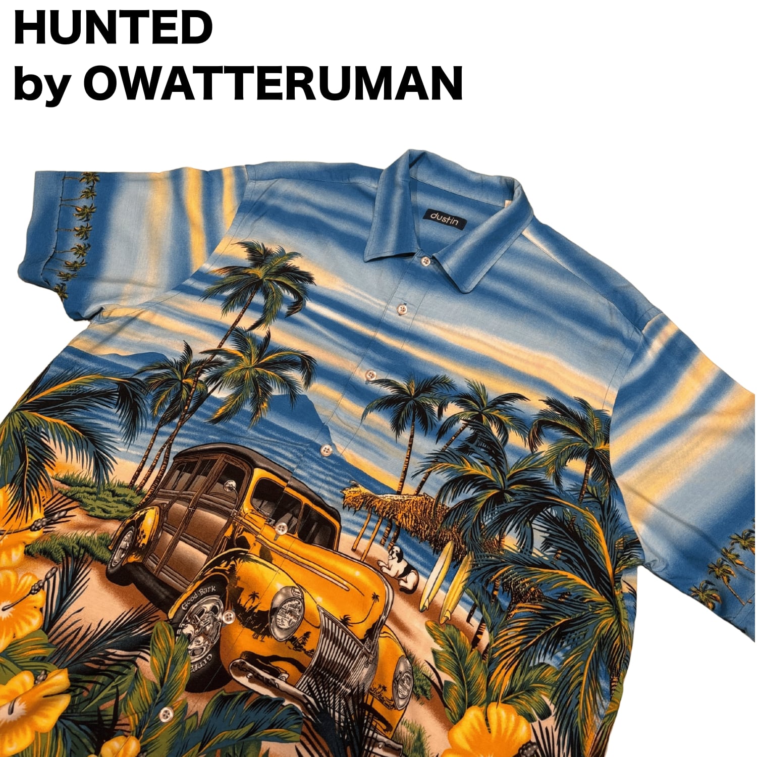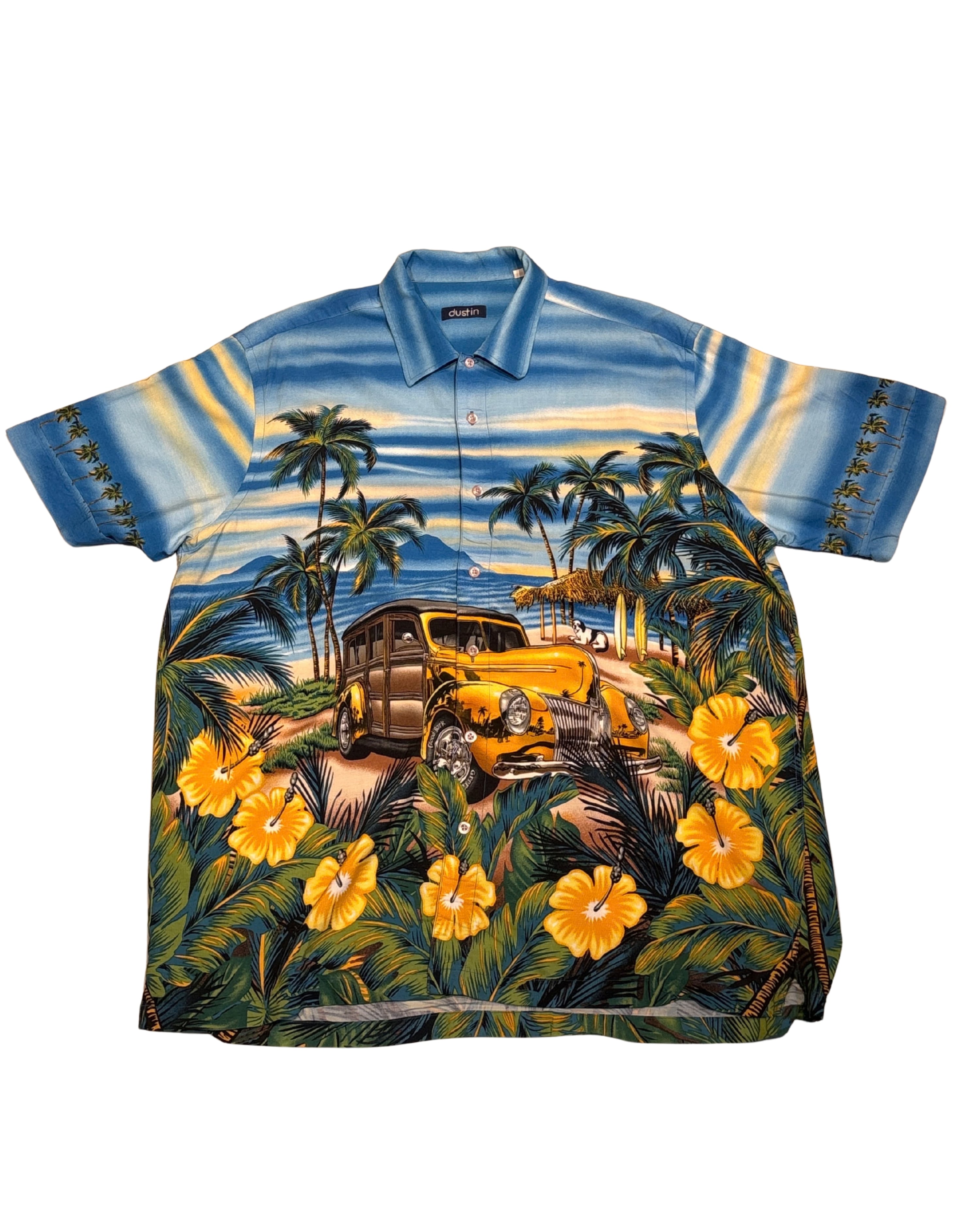 → ヤシの木、ビーチ、クラシックカーをモチーフにした全面プリントのハワイアンシャツ。観光地向け・リゾートウェア文脈で流通していたアイテムで、実用性よりもビジュアルを重視したデザイン。