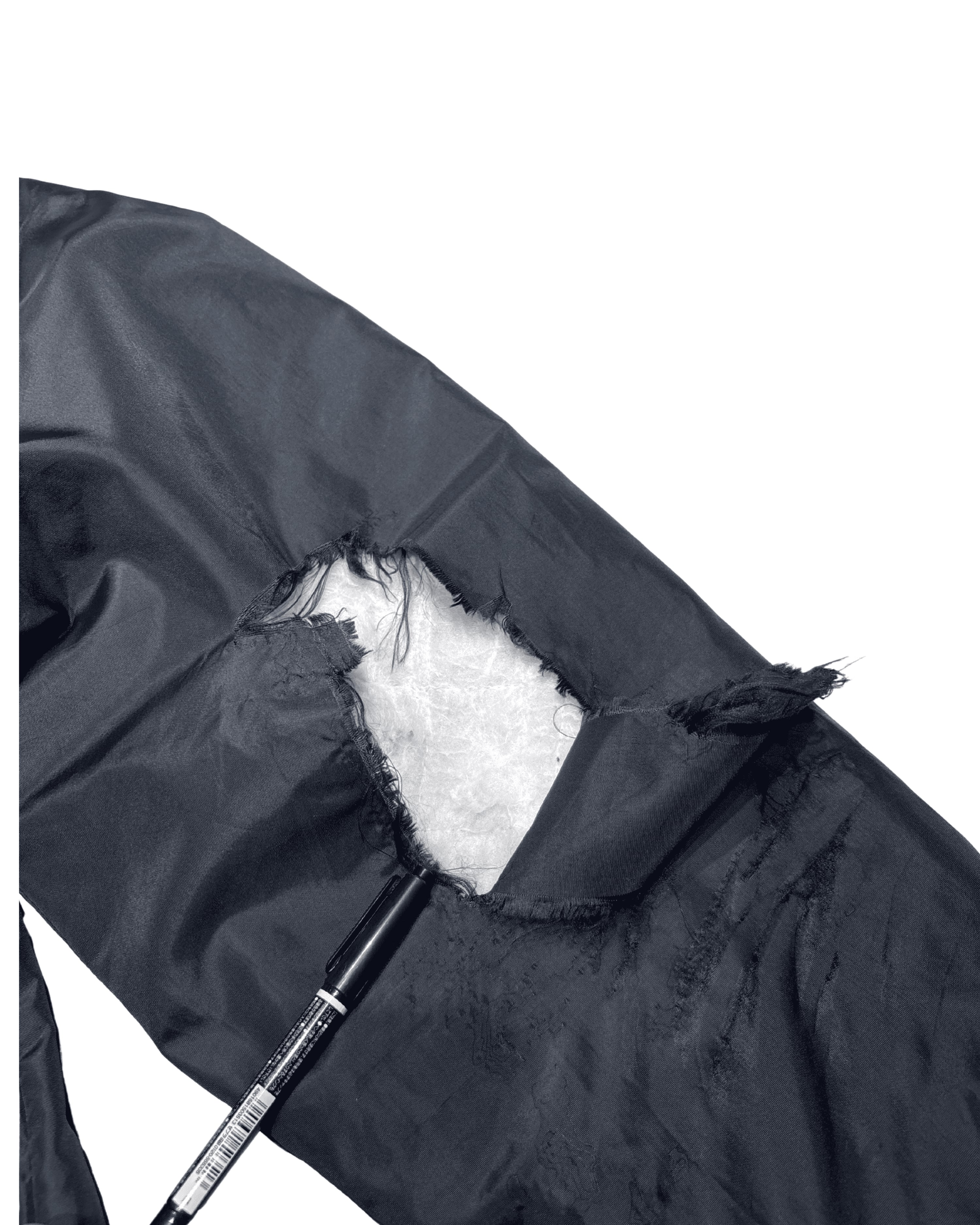 ・状態:使用感あり。右袖に大きな破れがあり、中綿の露出あり。その他、全体にシワあり。