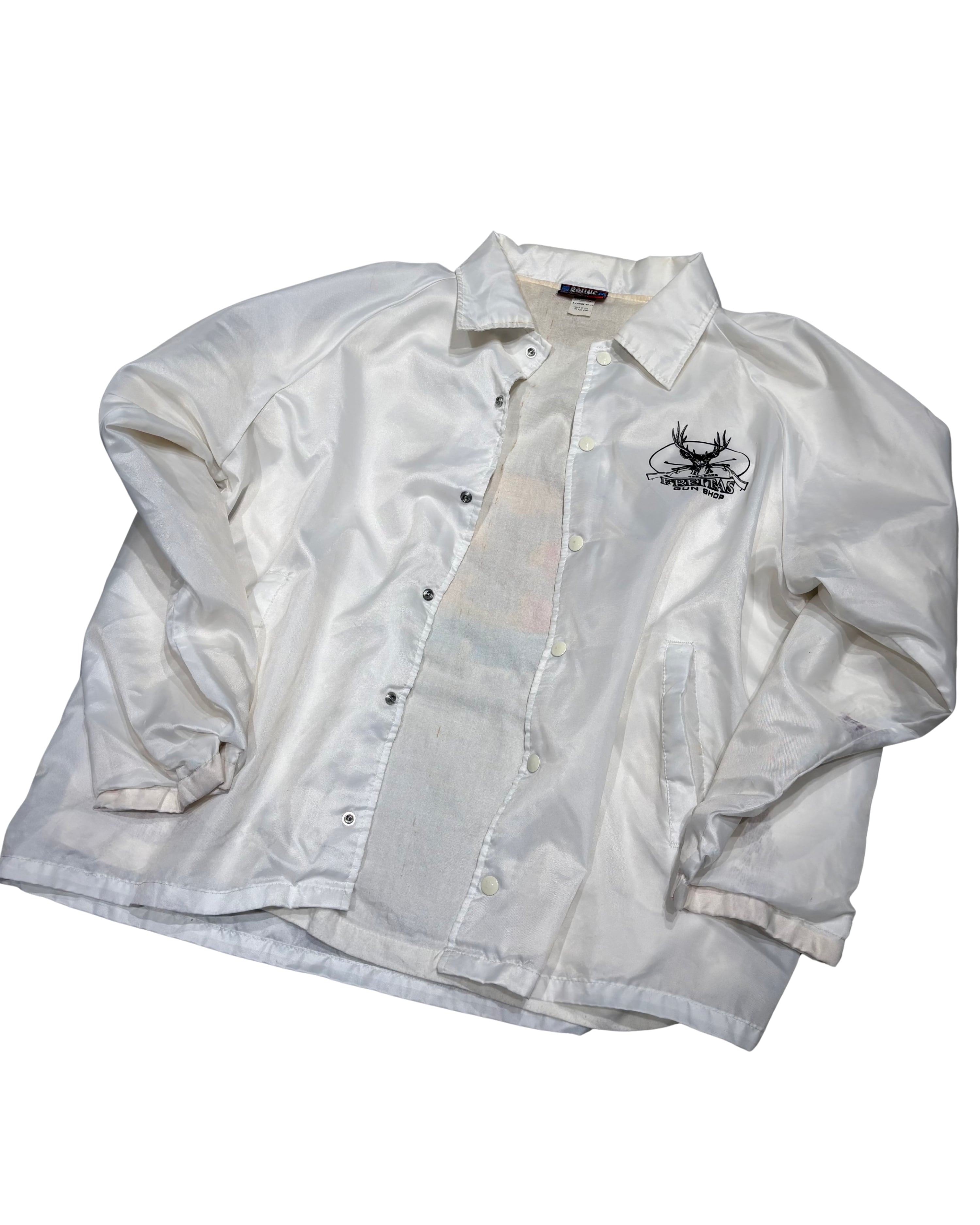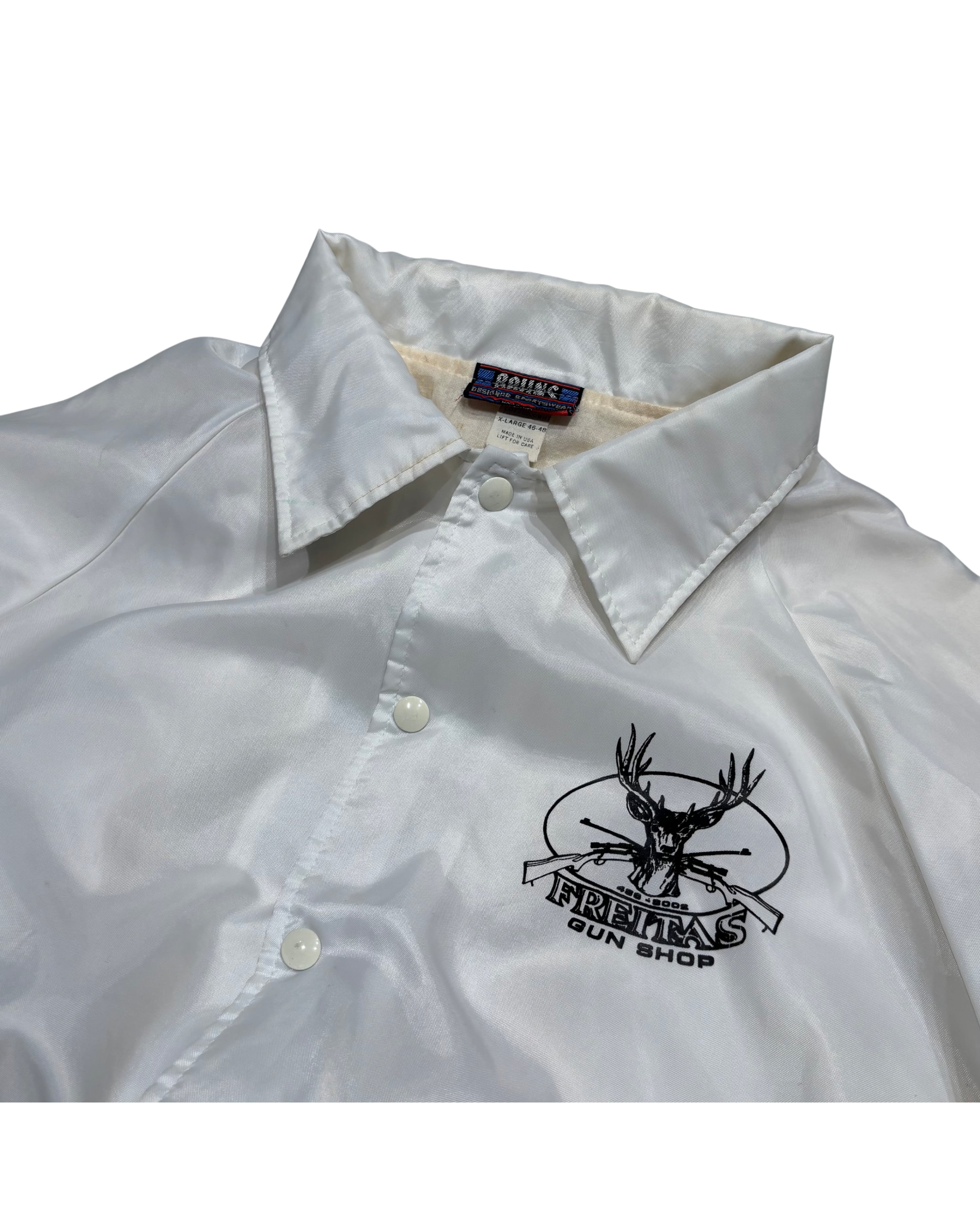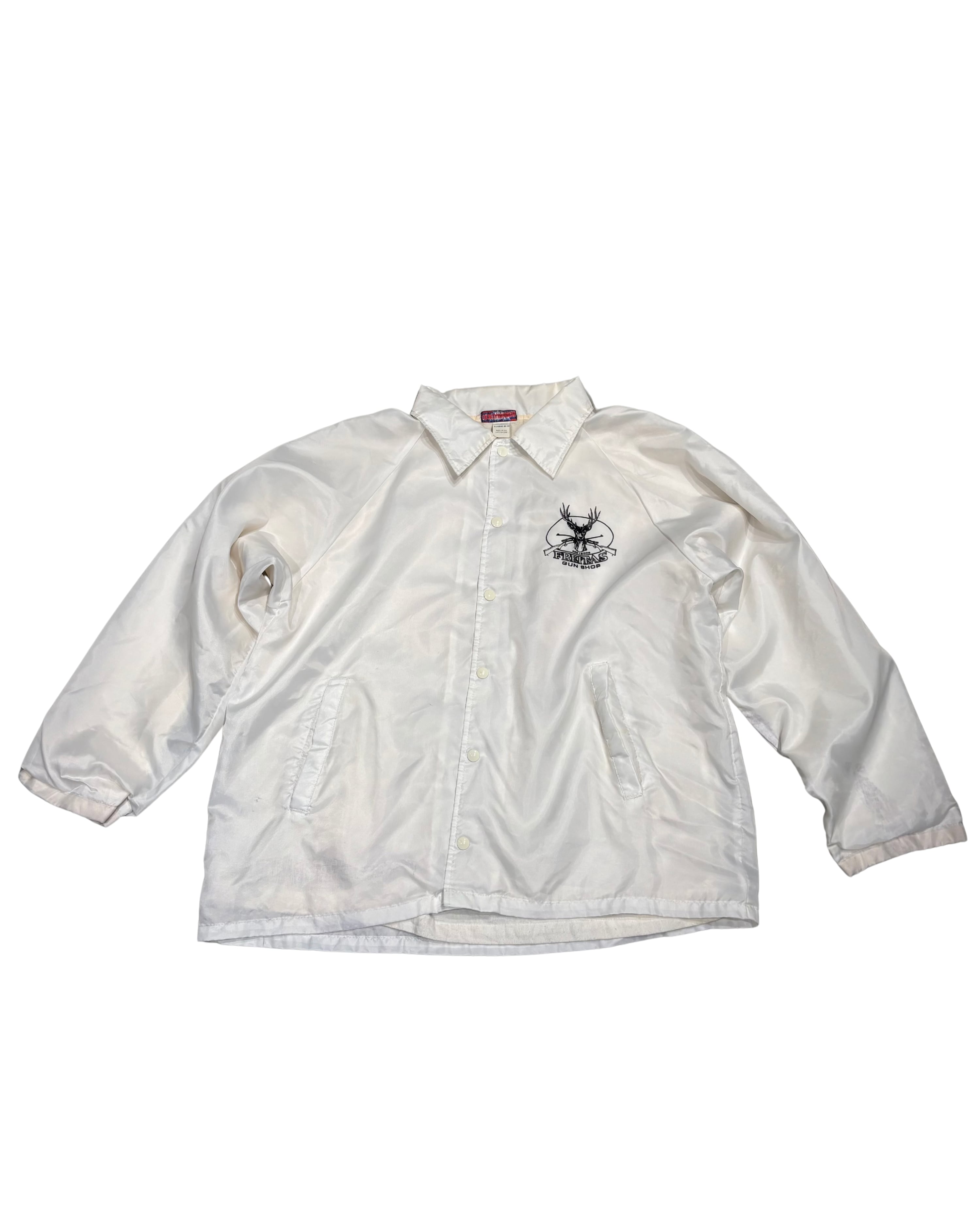 → アメリカのローカルガンショップ「FREITAS GUN SHOP」のプリントが入ったコーチジャケット。ショップ物・販促用ウェアの文脈に属する一着で、量販品とは異なるローカル色の強い個体。