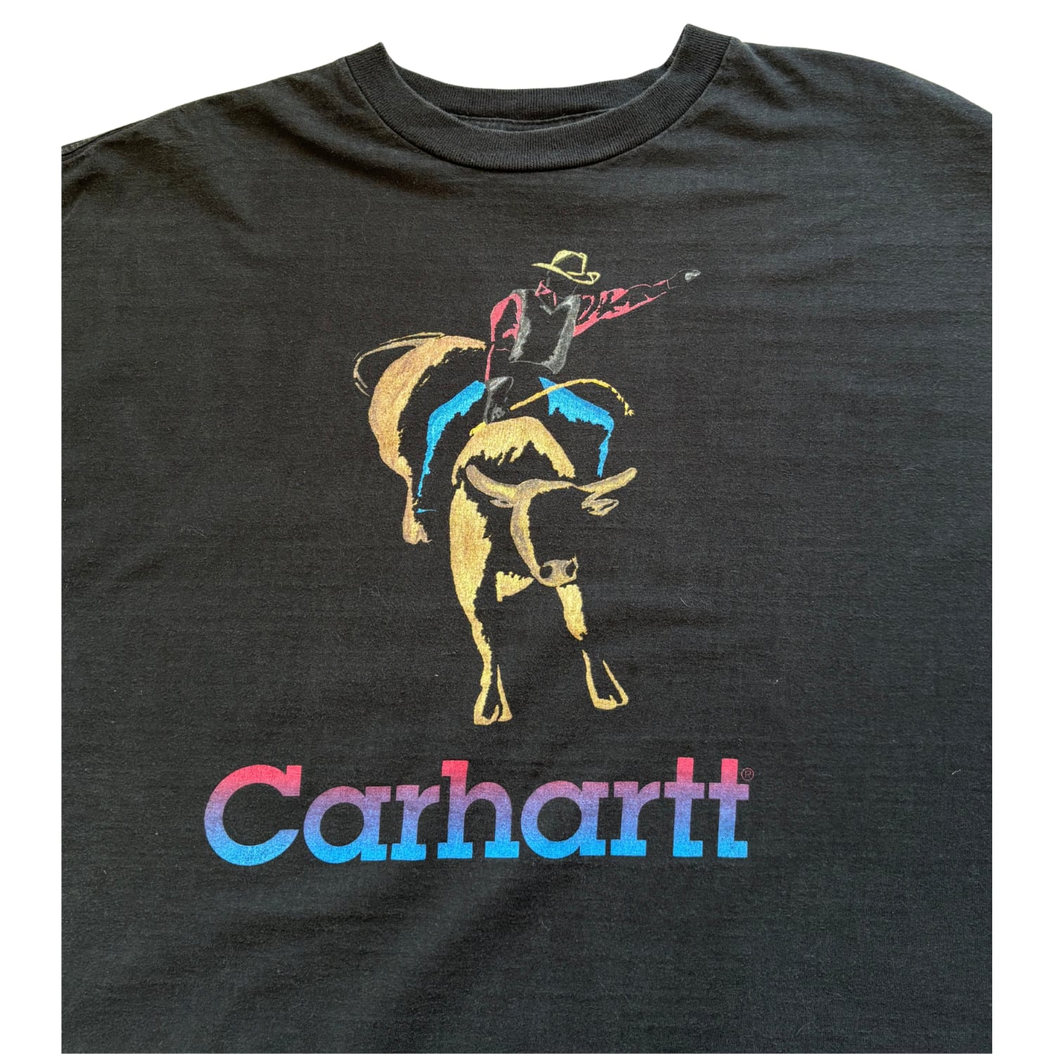 荒々しいブルライディングの瞬間を描いたグラフィックに、ブランドロゴを組み合わせた構成で、ワークウェア文脈とは少し違う“アメリカ的遊び”が強く出た一枚です。