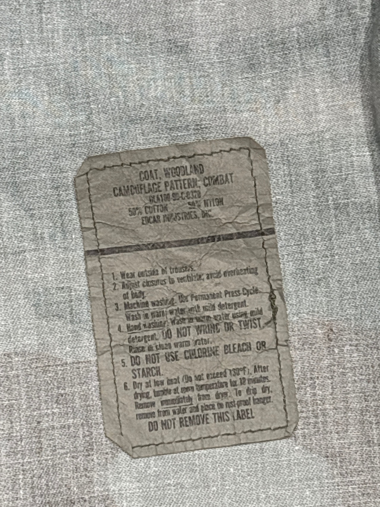 内側ラベルには「COAT, WOODLAND CAMOUFLAGE PATTERN, COMBAT」表記が確認でき、素材はコットン×ナイロン混紡。