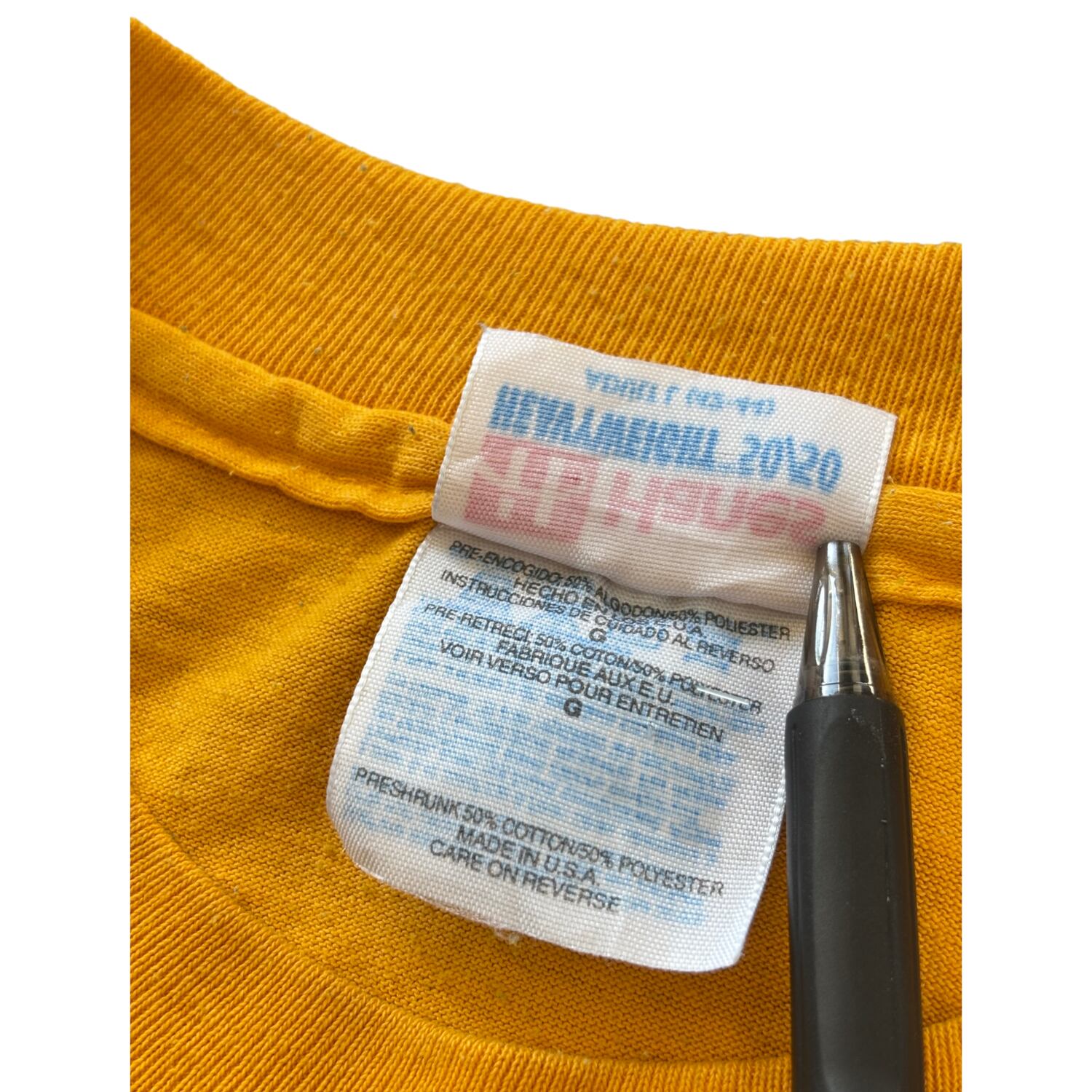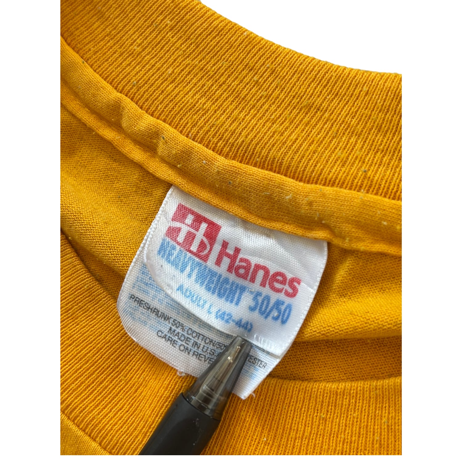 ボディはHanesのHEAVYWEIGHT 50/50。タグ仕様・表記内容から、1990年代後半頃の個体と推定されます。