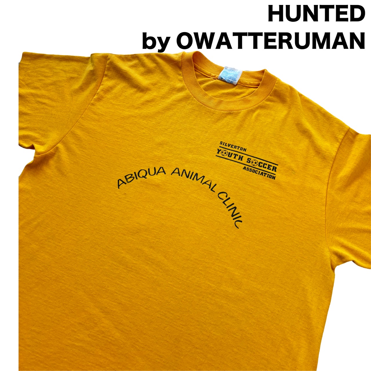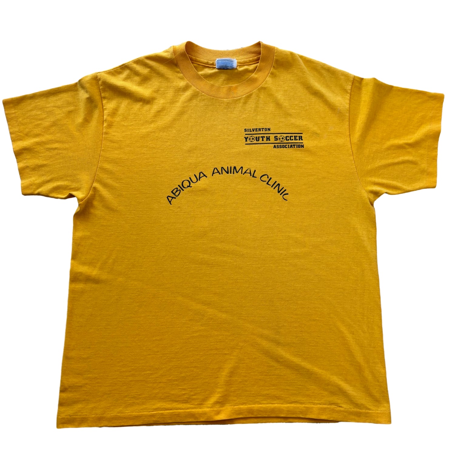 「ABIQUA ANIMAL CLINIC」のアーチ状ロゴに、「SILVERTON YOUTH SOCCER ASSOCIATION」の表記が入る構成から、地域コミュニティや支援団体向けに作られた一枚と読み取れます。