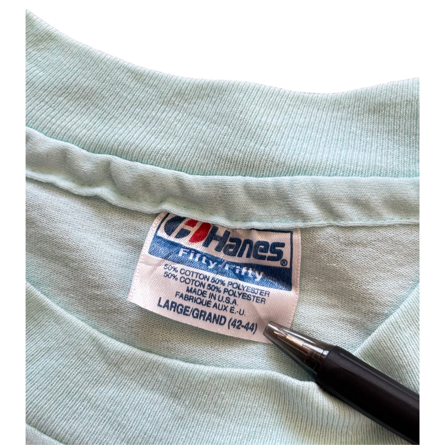 ボディはHanes Fifty-Fifty。USA製表記が残るタグ仕様から、1990年代前半の個体と推定されます。
