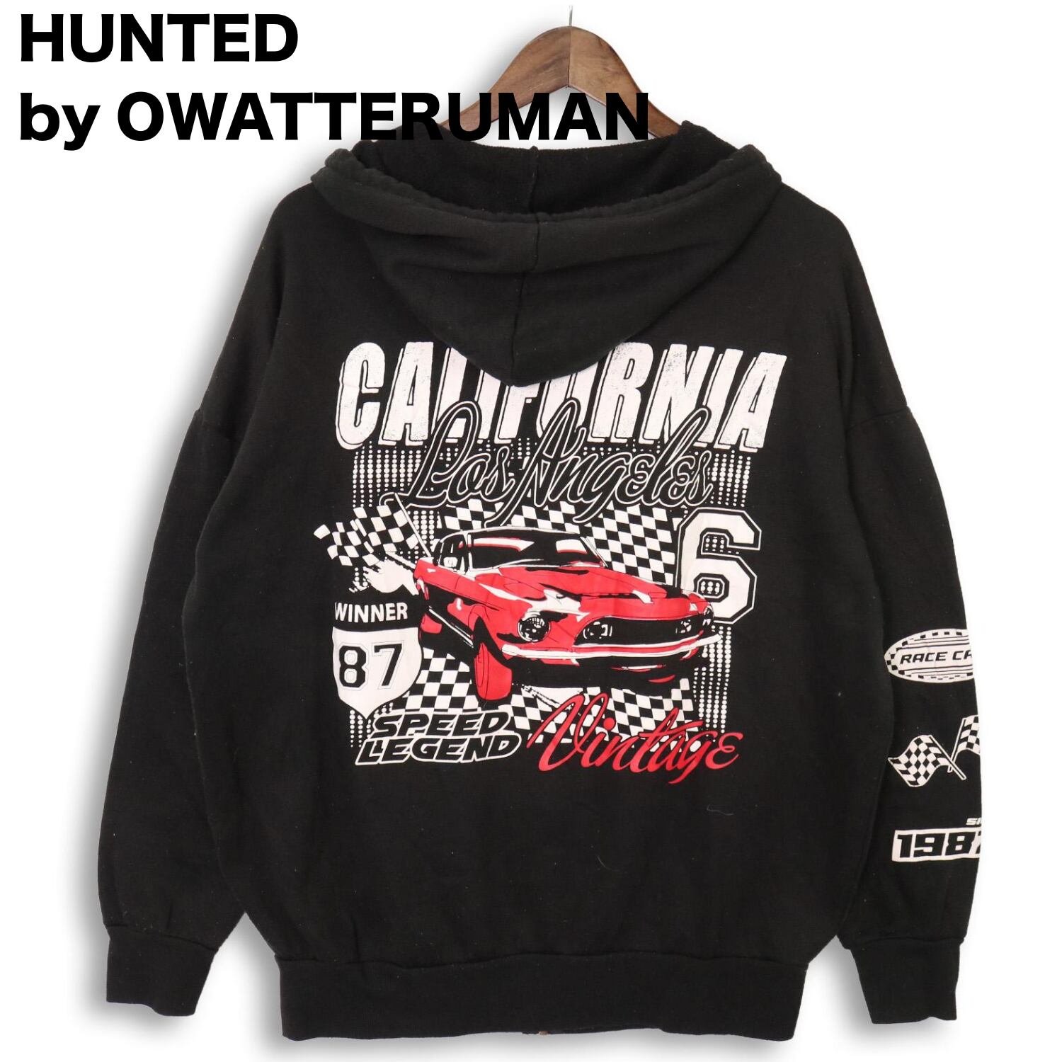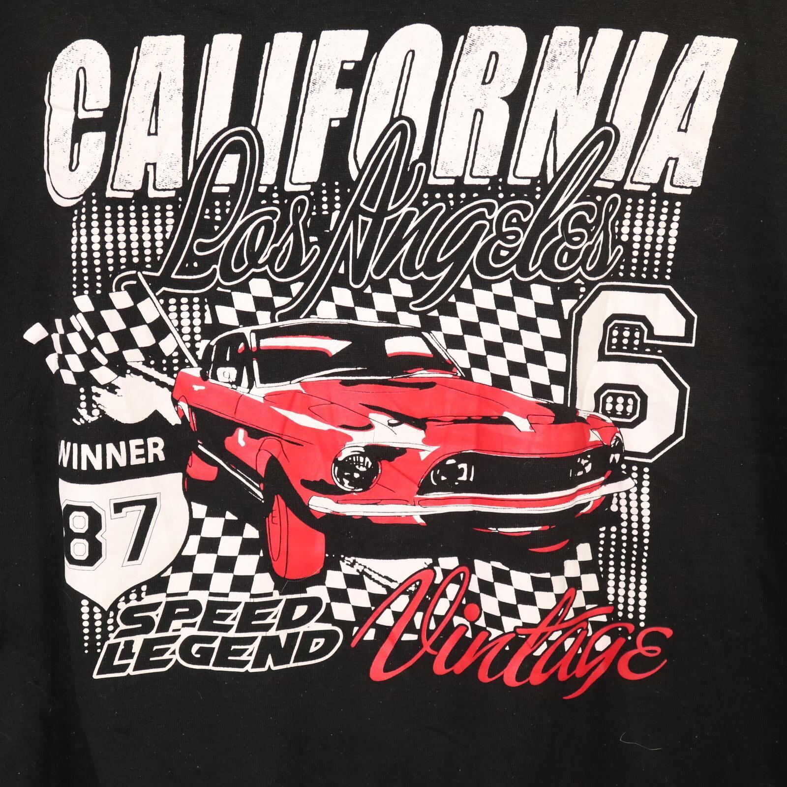 星条旗モチーフ、チェッカーフラッグ、クラシックカーの組み合わせは、90〜2000年代以降のアメリカンカジュアルらしい空気感。