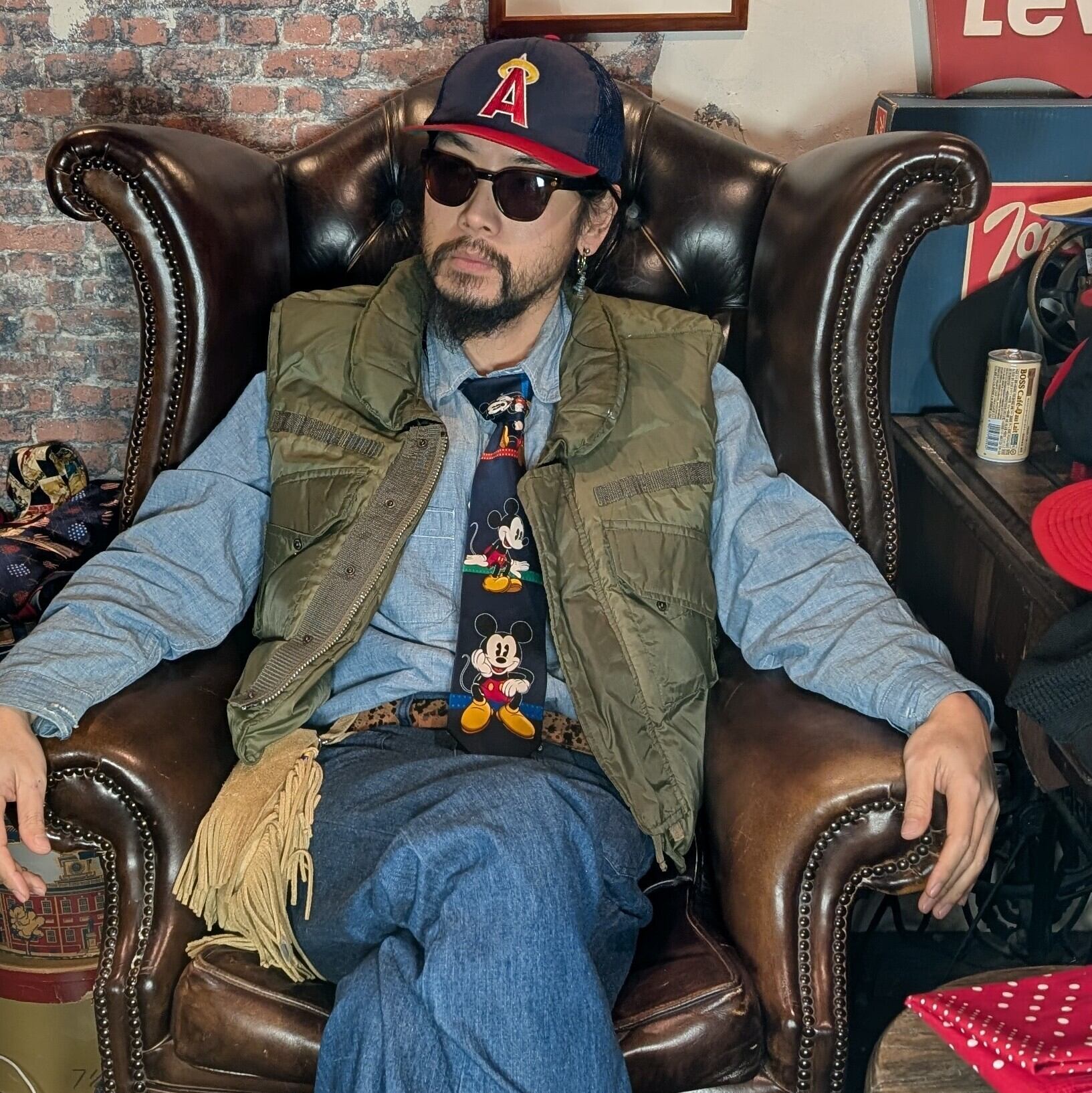 BDシャツやシャンブレーシャツ、デニムジャケットなど、本来は“真面目”なアメリカントラッドの文脈に対し、あえてキャラクターで崩す使い方が前提。