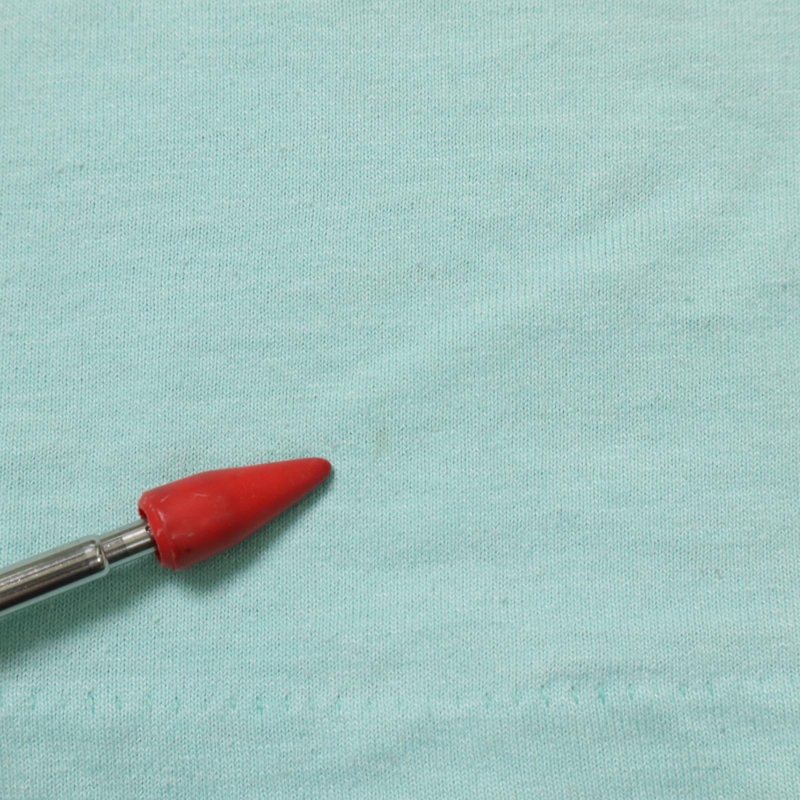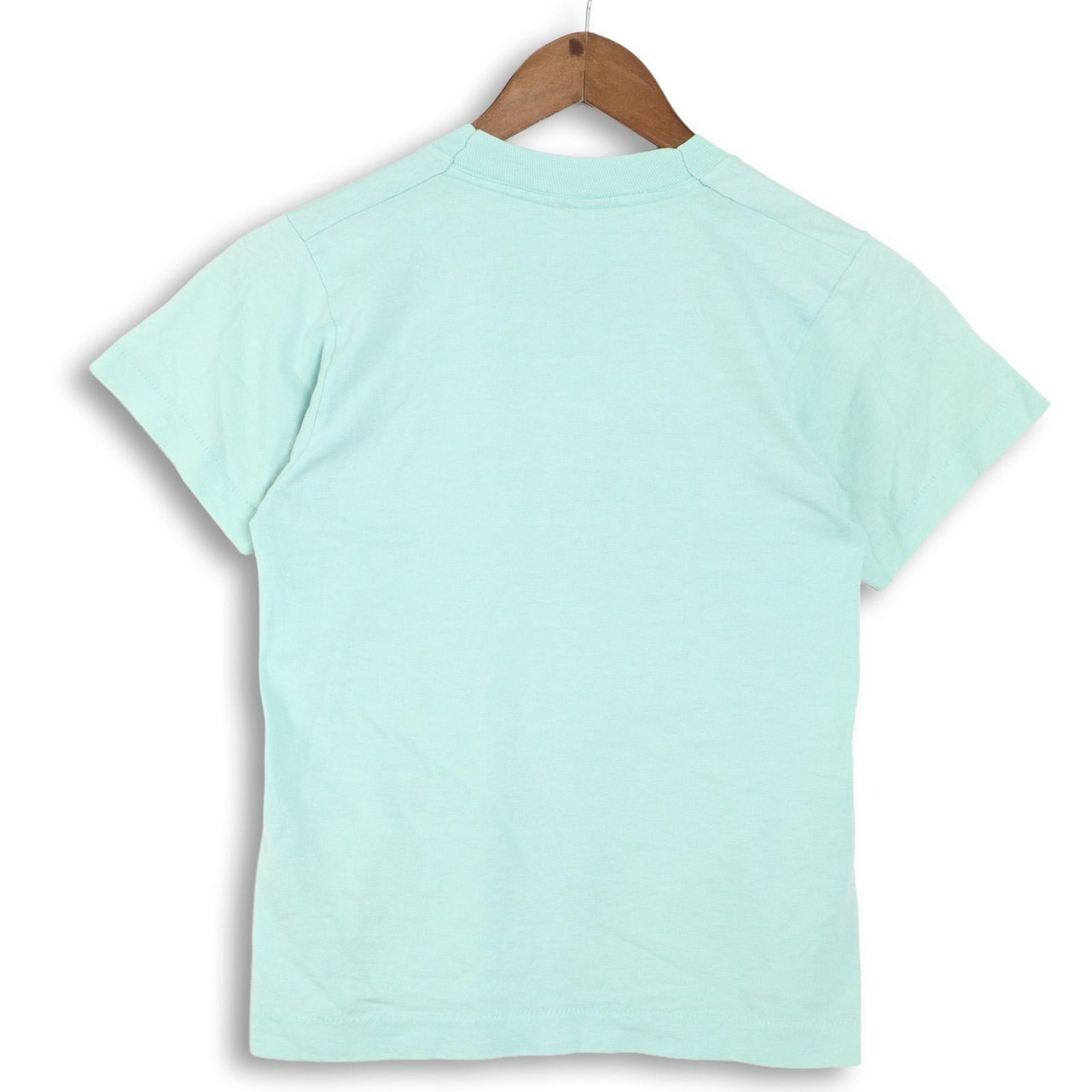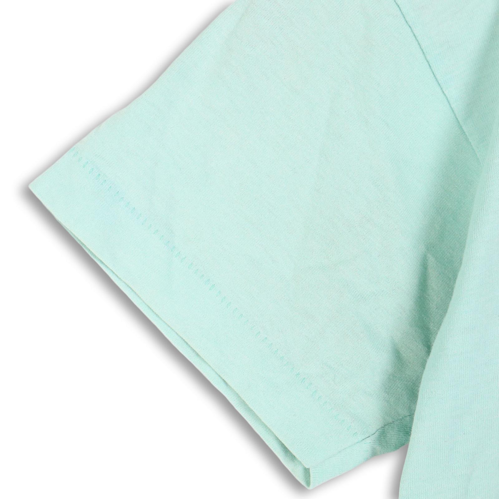 柔らかく軽いポリコットン混紡ボディ。程よく詰まったネックリブ、丸胴仕様。発色の良いラバープリントで、ミントボディとのコントラストが◎。