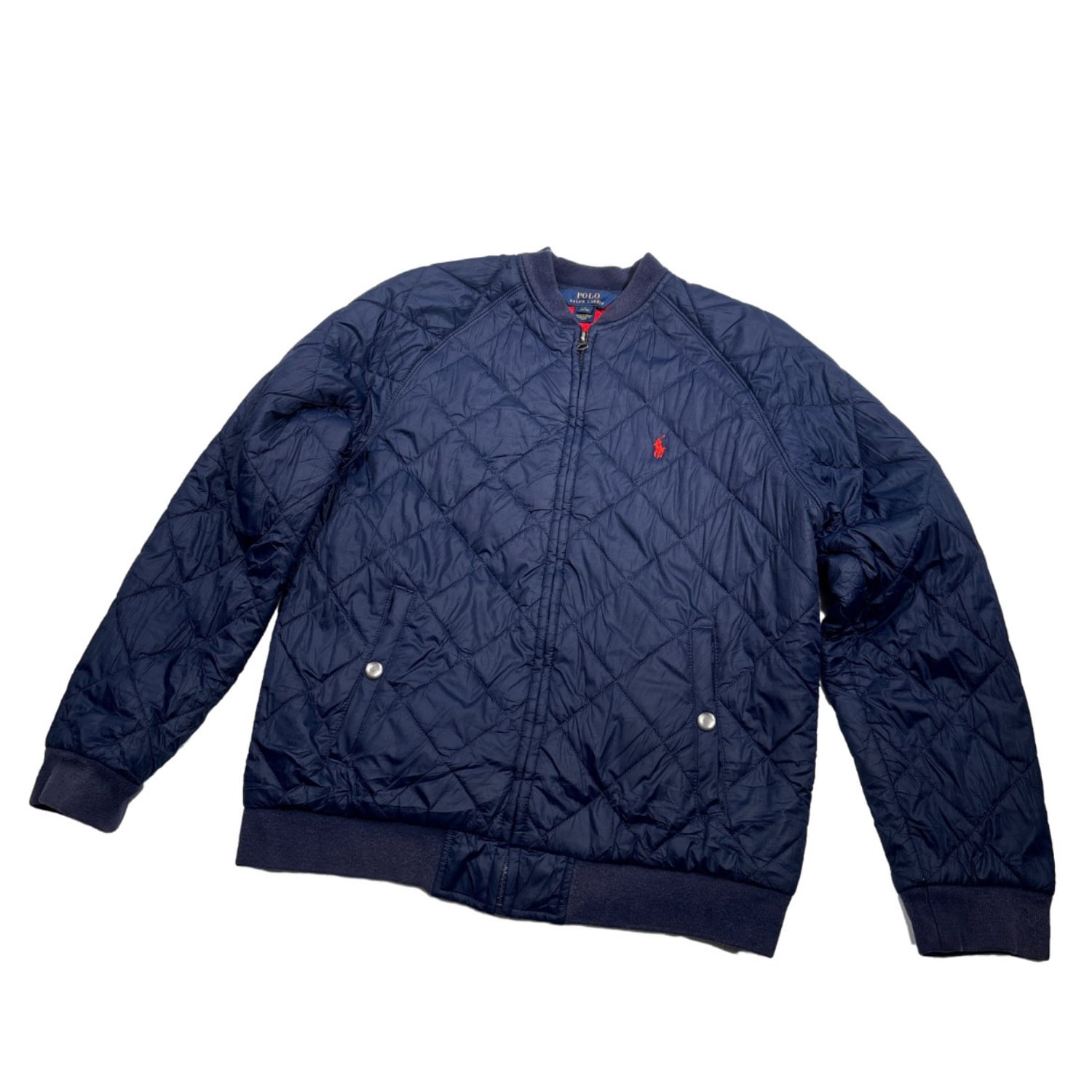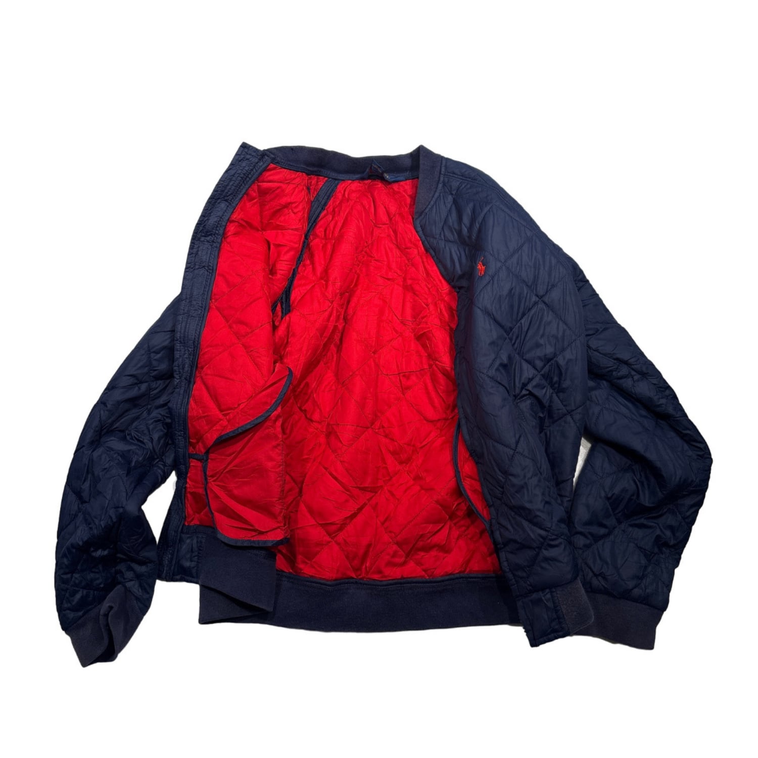 ダイヤ型キルティング仕様。フロントジップ(TALONジッパー使用)、リブ仕様の襟・袖・裾で防風性を高めたデザイン。ラグランスリーブで肩まわりの可動域が広く、軽量ながら保温性も確保。胸元にはシグネチャーのポニーロゴ刺繍入り。
