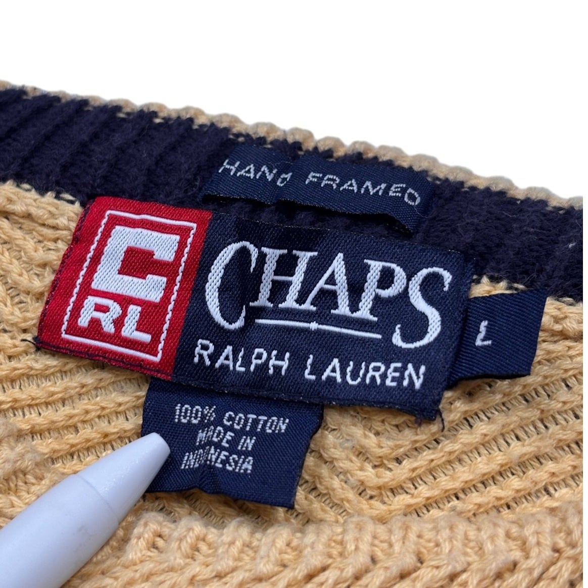 CHAPSのラルフローレンラインから出るコットンニットで、ネイビー地に赤いRLボックスロゴの織タグと上段に"HAND FRAMED"の表記、さらに"100% COTTON / MADE IN INDONESIA"の素材・生産国タグが確認できます。