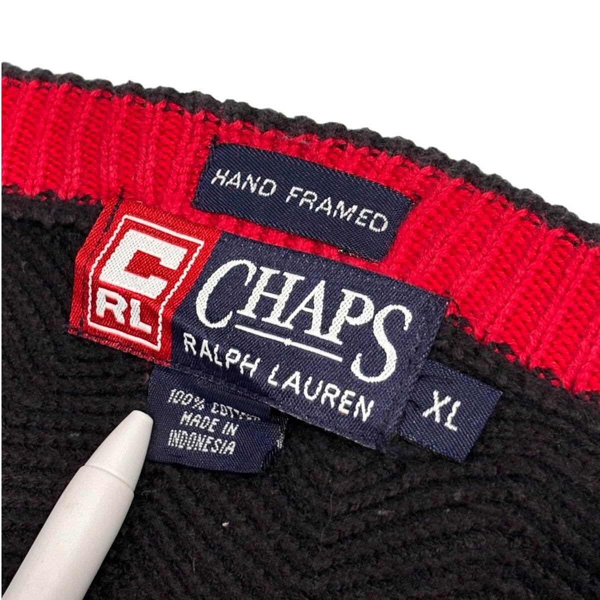 CHAPS by RALPH LAURENのラインはプレッピー/トラッドの文脈で大量流通したサブブランドで、本作は首元の"HAND FRAMED"タグとCHAPSボックスロゴ、内側の製造国表記(Made in Indonesia)が確認できます。