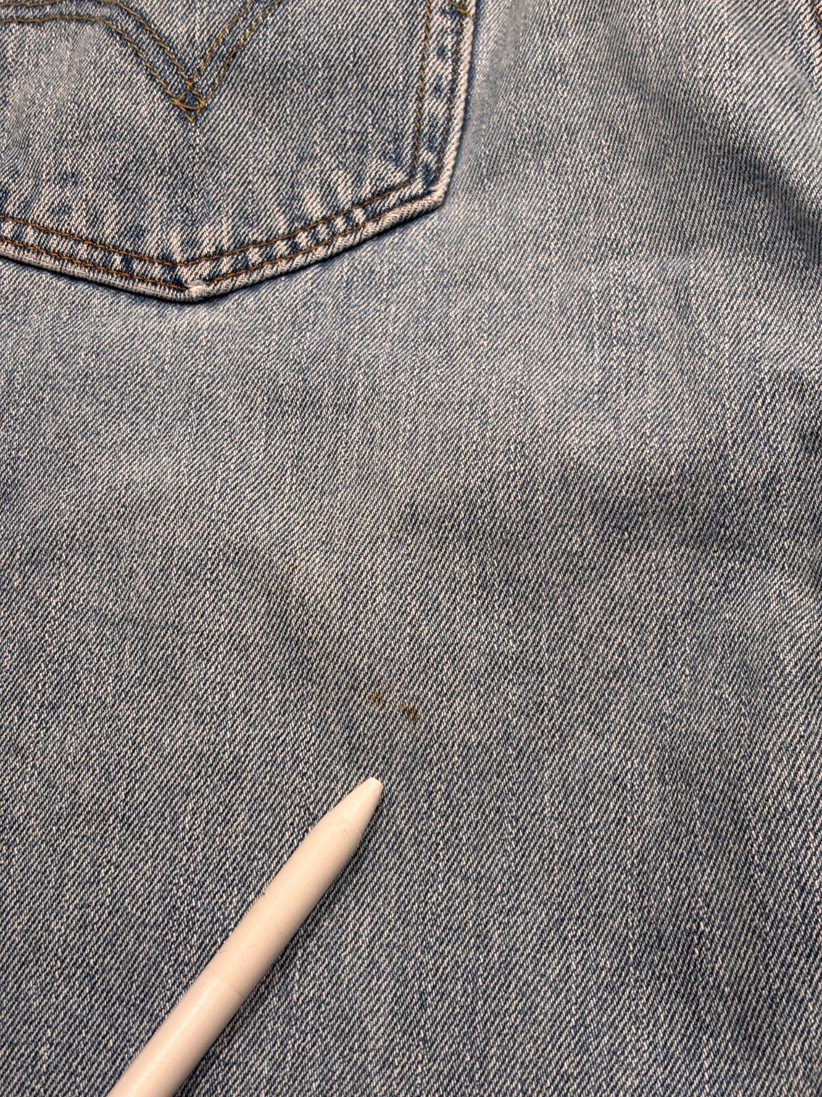 全体に使用感・色落ちあり。バックポケット下に小さな茶系のシミ、コインポケット付近に軽い擦れ・ほつれ、裾に使用感が見られます(破れや大きな穴は無し)。レザーパッチやタグ類は経年による擦れあり。ジップ・ボタン等の可動部は問題なく動作します。