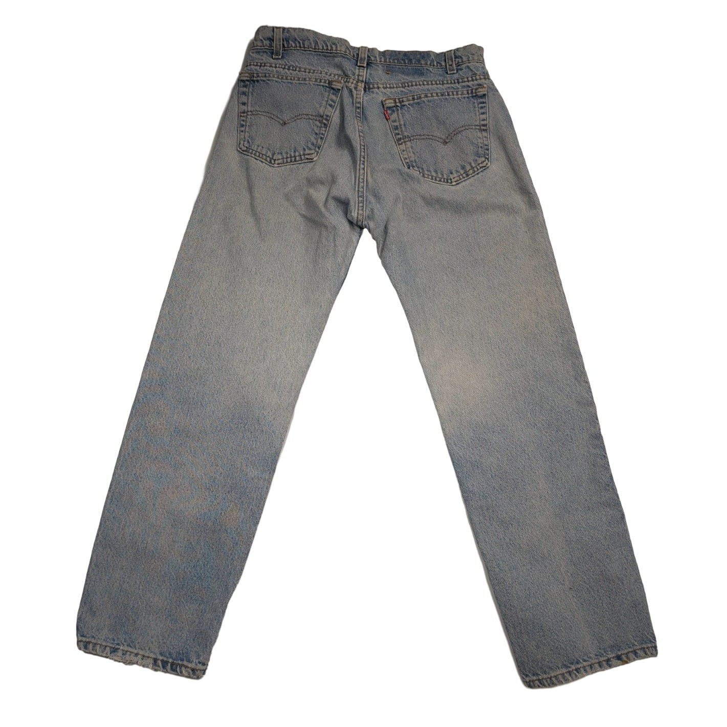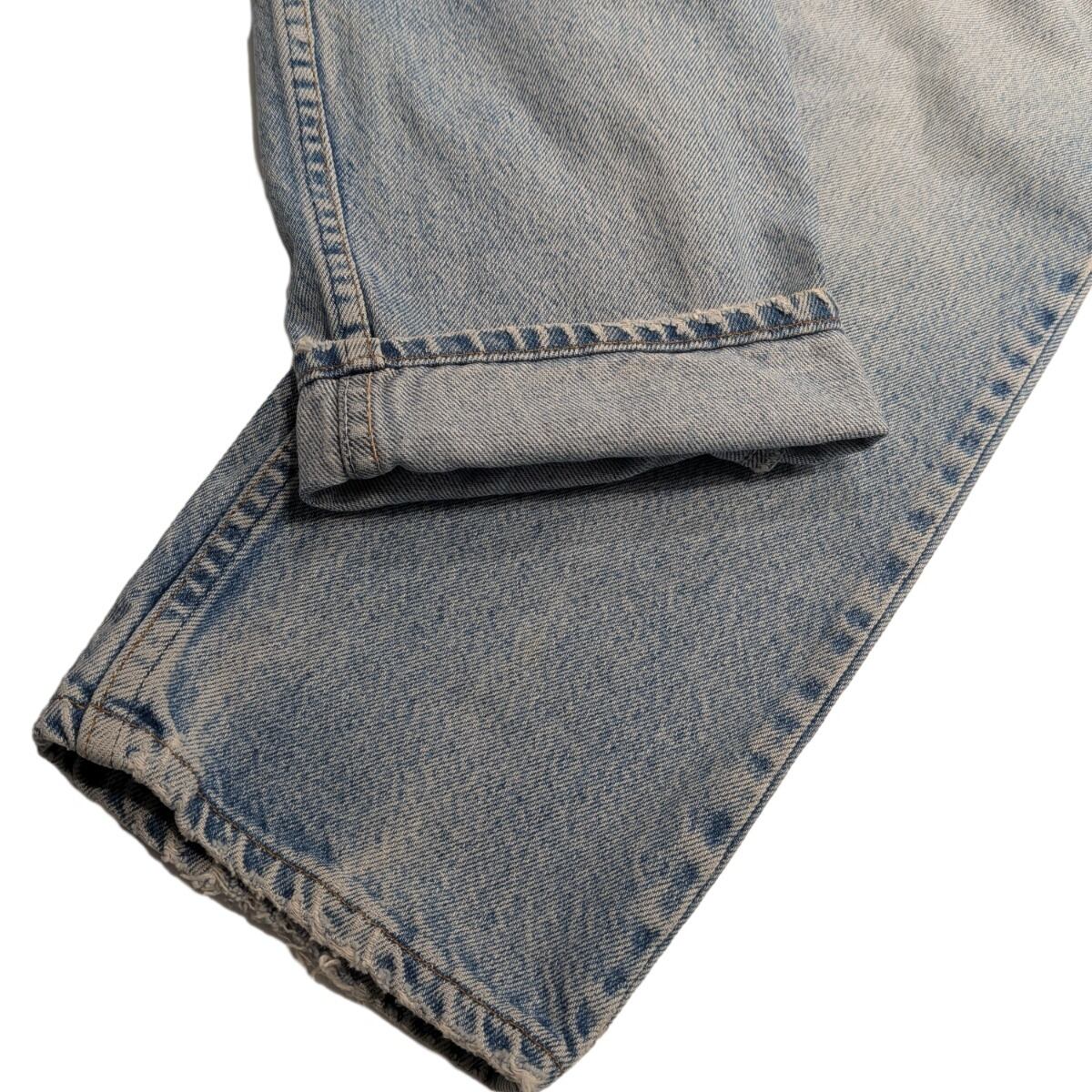 股上30cmと比較的深めのハイライズに近い設定で、腿周りにややゆとりを残すレギュラーストレートシルエット。ライトな色落ちで全体に均一なフェード感があり、膝下は真っ直ぐに落ちるラインなのでロールアップでもそのままでも合わせやすいです。フロントはジップフライ(YKK刻印)、バックはアーキュエイト刺繍と赤タブを装備。裾は経年で毛羽立ち・軽いダメージが見られ、穿き込まれた雰囲気が出ています。