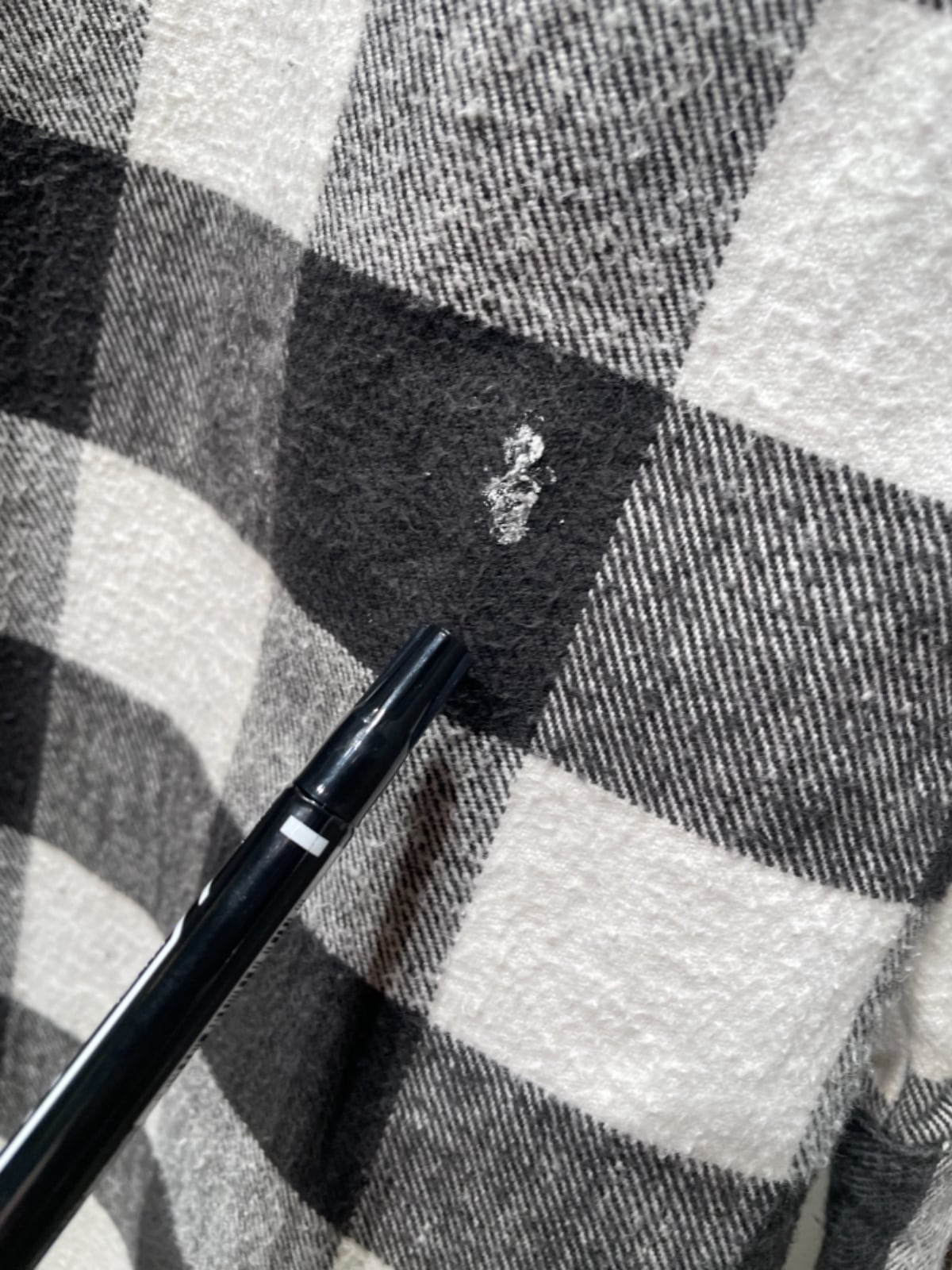 肩まわりはゆったり、身幅に余裕のあるボックスシルエットで、着丈は長め(裾がラウンド)。厚手の起毛コットンは中肉〜ややヘビーで、アウター代わりに羽織れる安心感がある生地感。フラップ付きの胸ポケットが左右にあり、ボタンはこげ茶のプラスチック(木目っぽい表情)。カフは2つボタンで調整可能。丸みのある裾と長めの着丈で、パンツにインせずそのままラフに着るスタイルがハマる作り。状態としては背面右腰付近に小さな擦れ/生地抜け、全体的にピリングや使用感あり(写真参照)。目立つ大きな汚れは見受けられませんが、ダメージを気にする方はご注意ください。