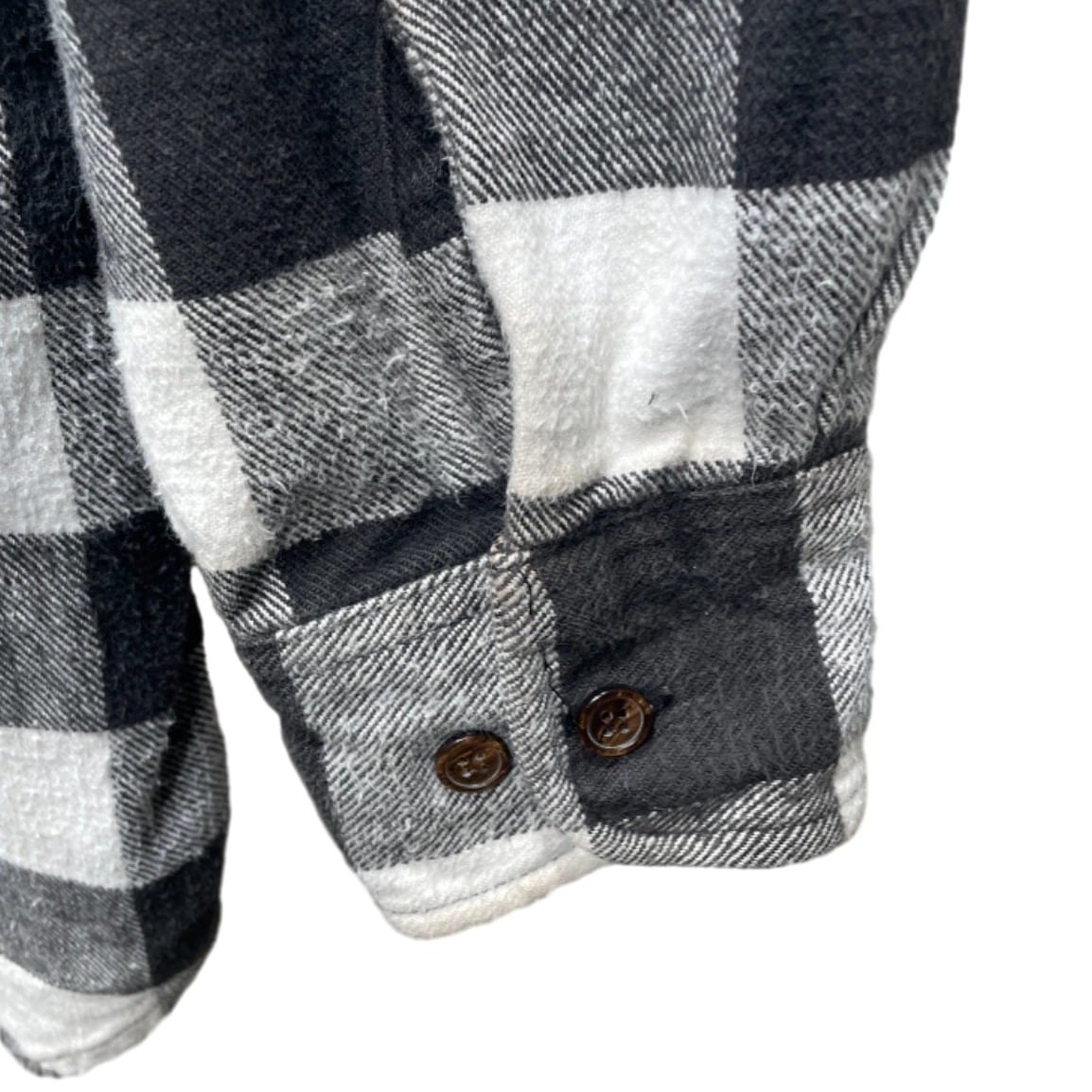 大柄のバッファローチェックを使ったフランネルシャツは、ワークウェア由来ながらグランジやストリートで羽織りとして使われることが多い定番アイテム。この個体は織りネームと下にぶら下がる小タグに「100% COTTON RN 70682 MADE IN HONG KONG」とあり、香港生産表記とネームの作りから90s頃の量産品と推定する(確証はなし)。厚手に起毛したコットン地で、シャツジャケット感覚で着られる仕様になっています。背面に一部生地抜けや擦れがあり、着用感がある点は確認済み。