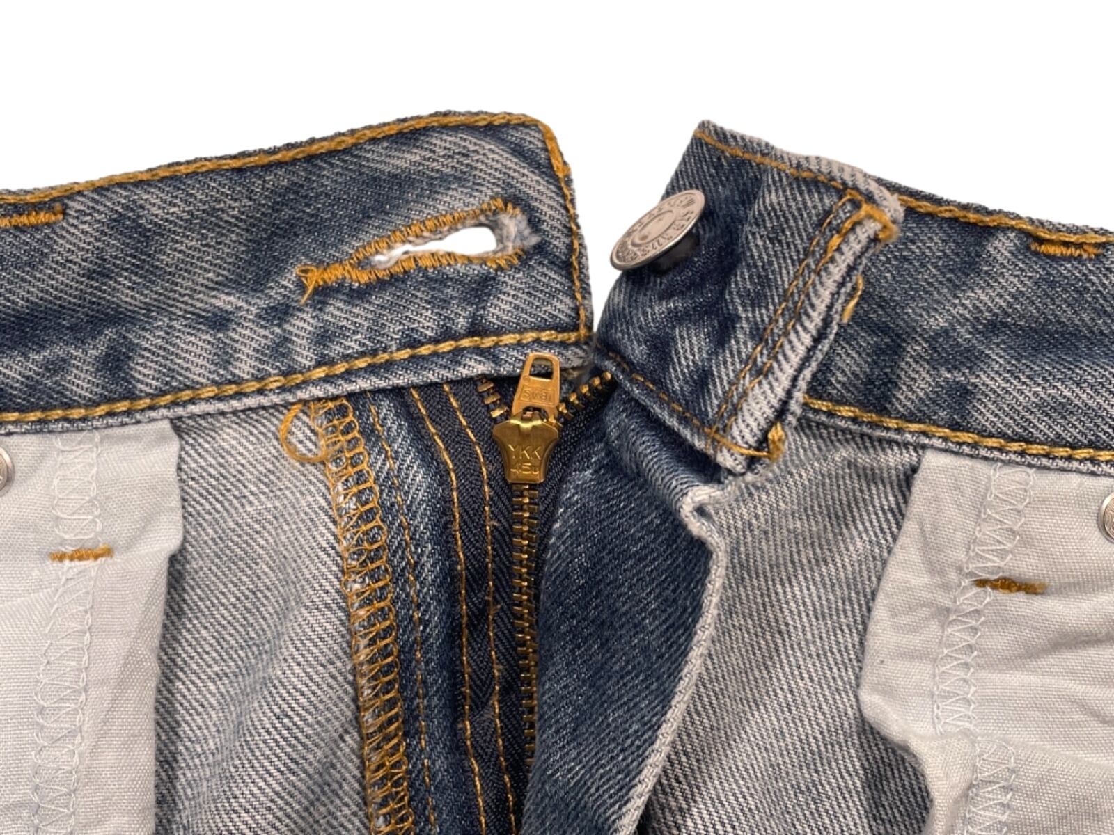 生地は100%コットンの無骨なデニムで、全体に自然な色落ちと膝周りの使用感が見られるのが特徴。フライはジッパー仕様(YKK刻印が見える)で着脱しやすく、裾は左右に擦れやほつれが出ているが大きな補修跡は無し。