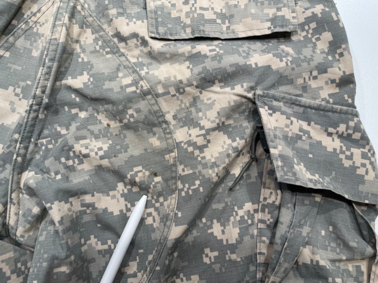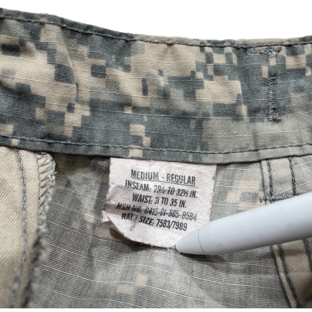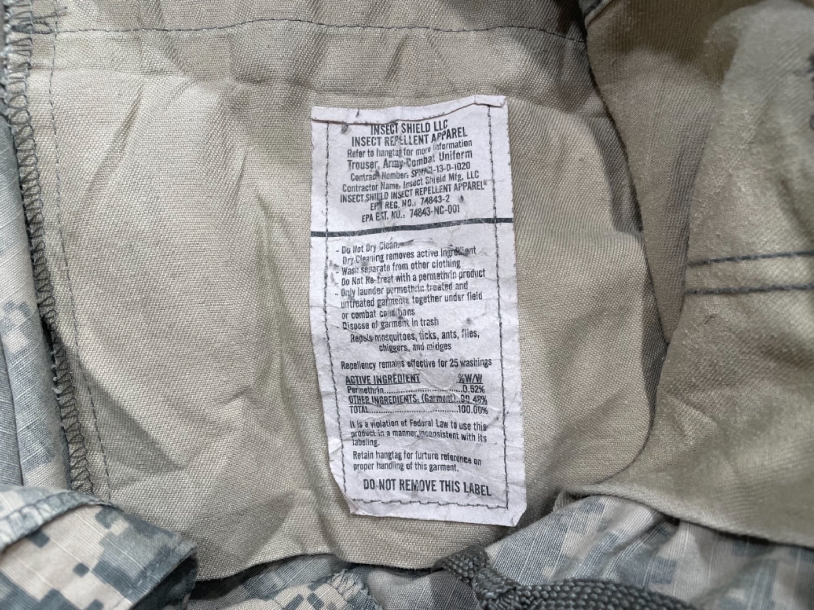 UCPと呼ばれるピクセル状のデジタルカモ、繊維表記の50%C/50%NYLON、さらに「INSECT SHIELD」「Contract Number: SPM1C1-13-D-1020」といったラベルの存在から、2013年に製造された実物仕様の個体と判断できる。フィールドユース前提の機能重視な作り(多ポケット、裾のドローコード、股下補強など)がそのままファッション的にも使える一本。