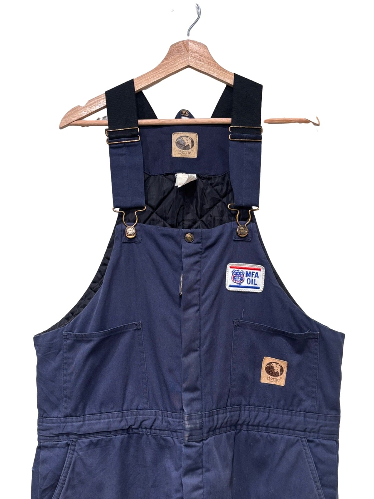 胸元のMFA OILワッペンとBerneの革パッチ、内側のキルティング裏地や真鍮色のIDEAL刻印ジッパー、裾のサイドジップなどのディテールから、実用性重視のワークウェアとして作られた一着です。