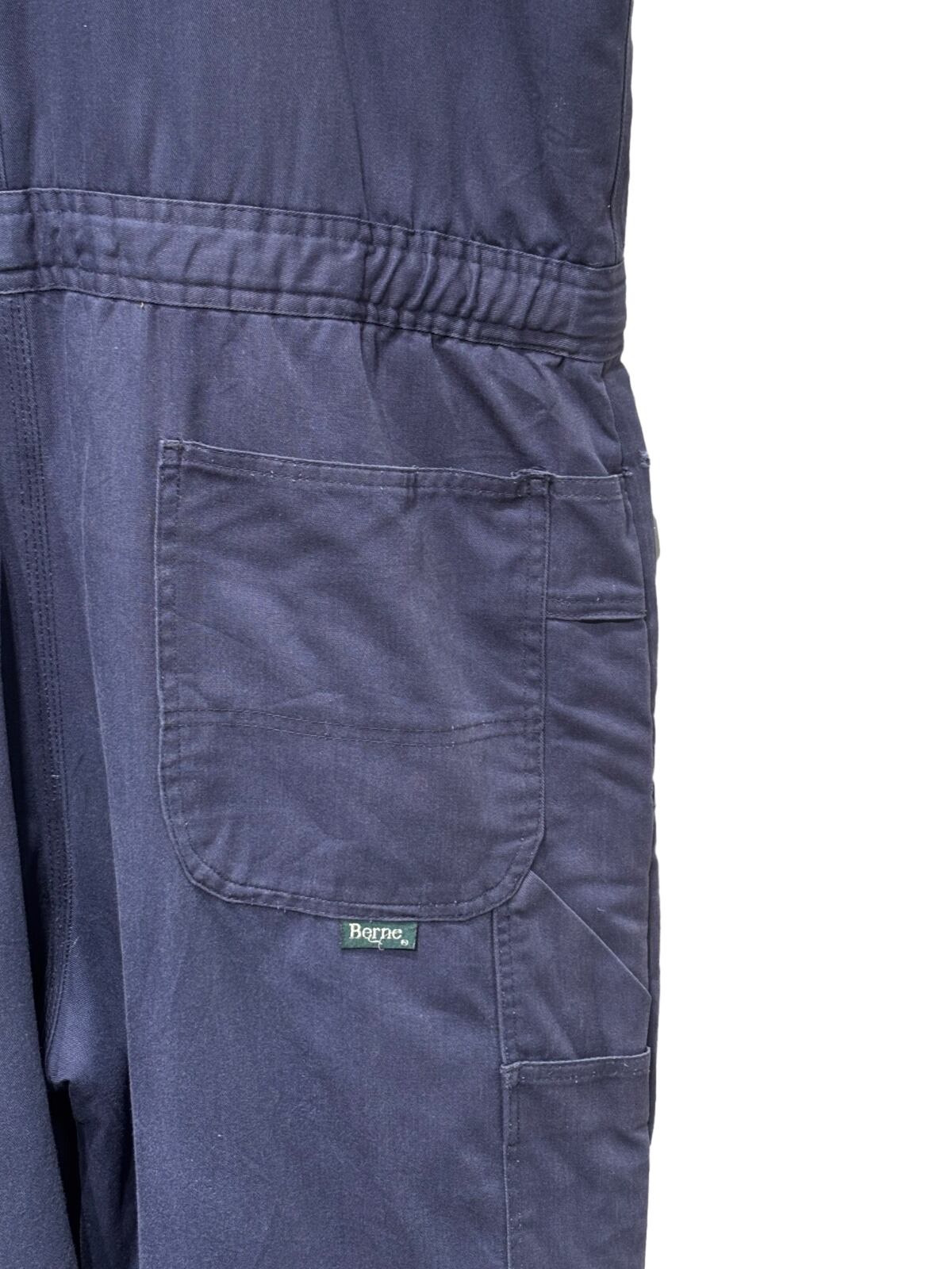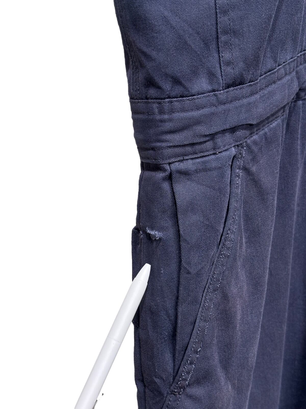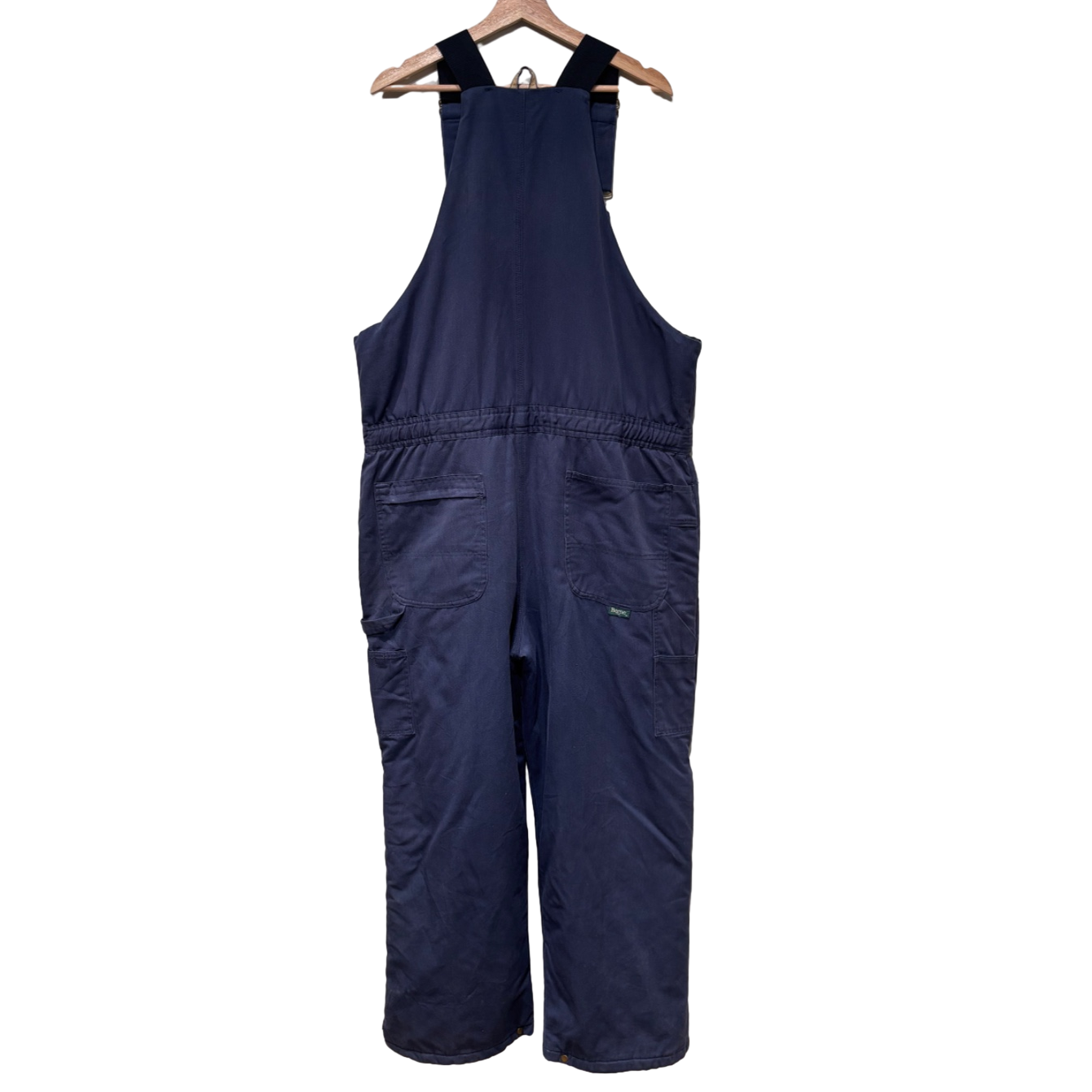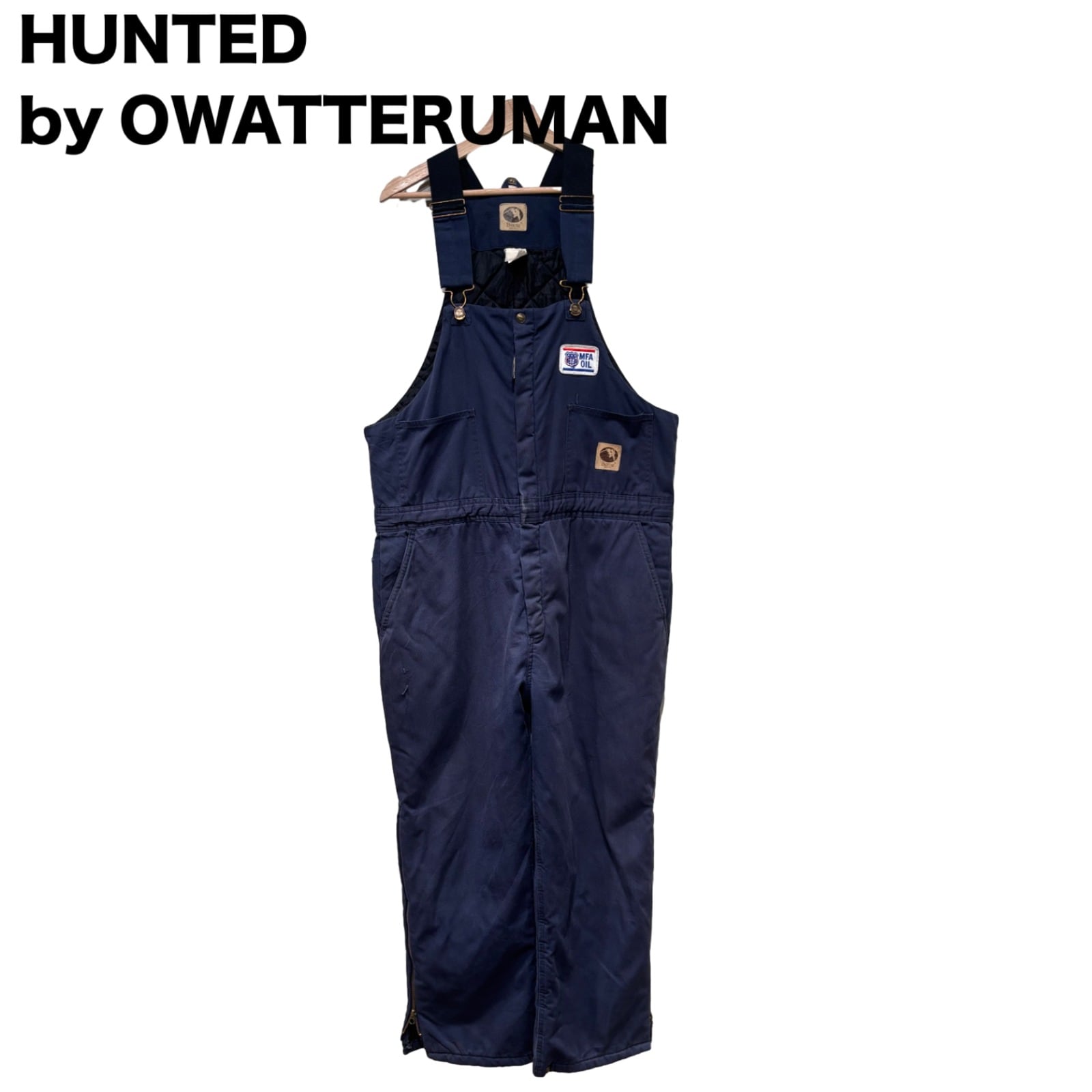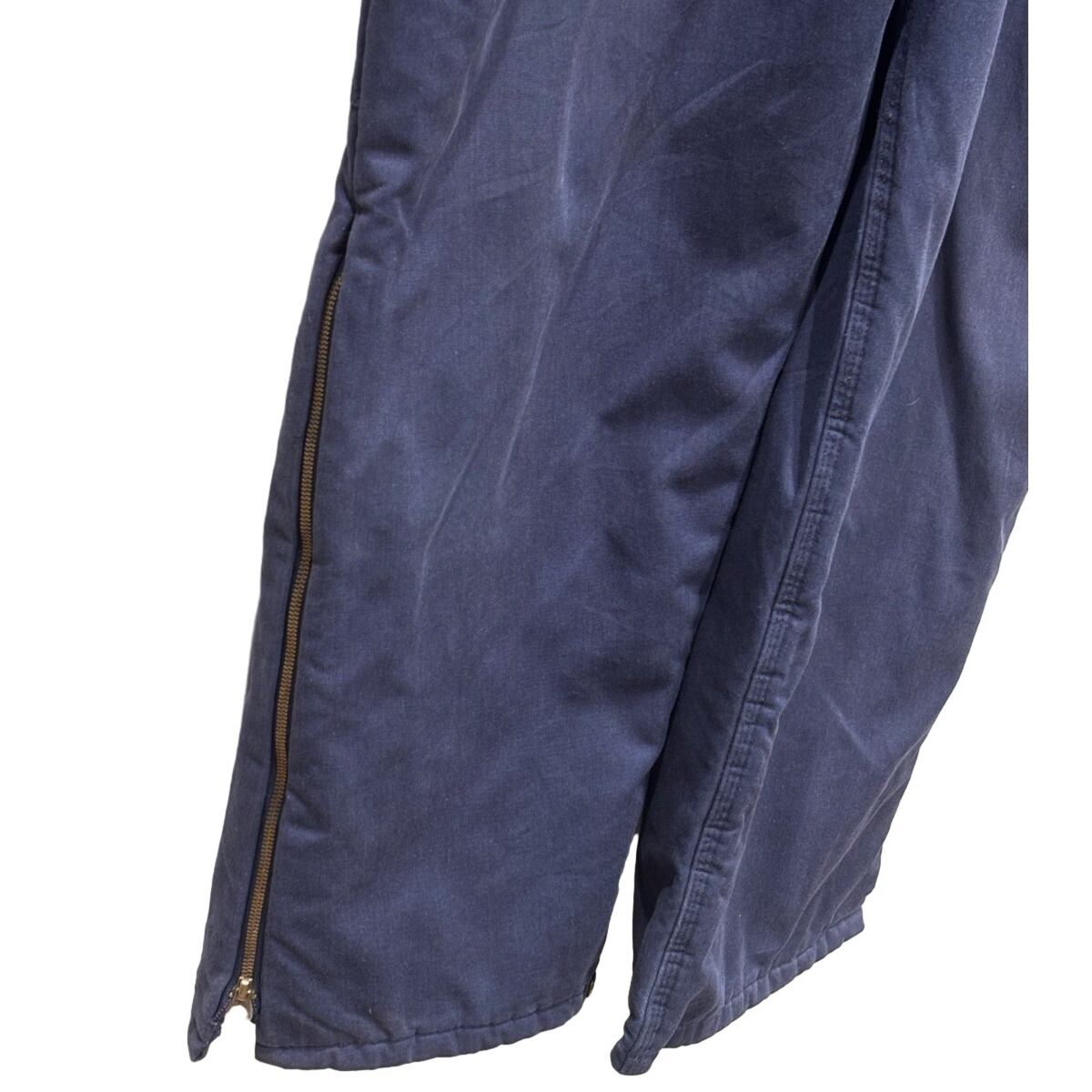 胸当て付きのビブ型で、肩ベルトは金具で長さ調整可能。フロントはIDEAL刻印の真鍮系ジッパー+トップのスナップ留め、内側は全面キルティングで保温性を確保しています。ウエストは後ろがシャーリング(ゴム)仕様でフィット感の調整が効き、サイドの大ぶりなポケットやカーペンターポケット、裾のサイドジップはブーツを履いたままの着脱を想定した作り。シルエットは太めのストレート寄りで、レイヤードしやすくワークテイストのスタイリングに馴染みます。コンディションとして、右腿〜脇腹付近に引っかきや小ダメージ(写真参照)、ウエスト付近に擦れ・色落ちが見られます。ジッパー・金具は動作しますが使用感あり。