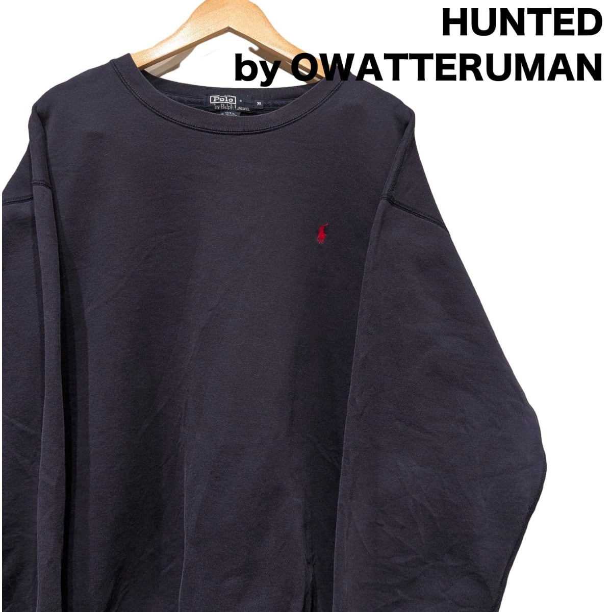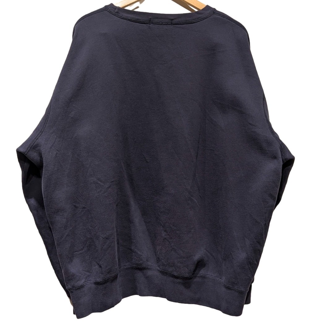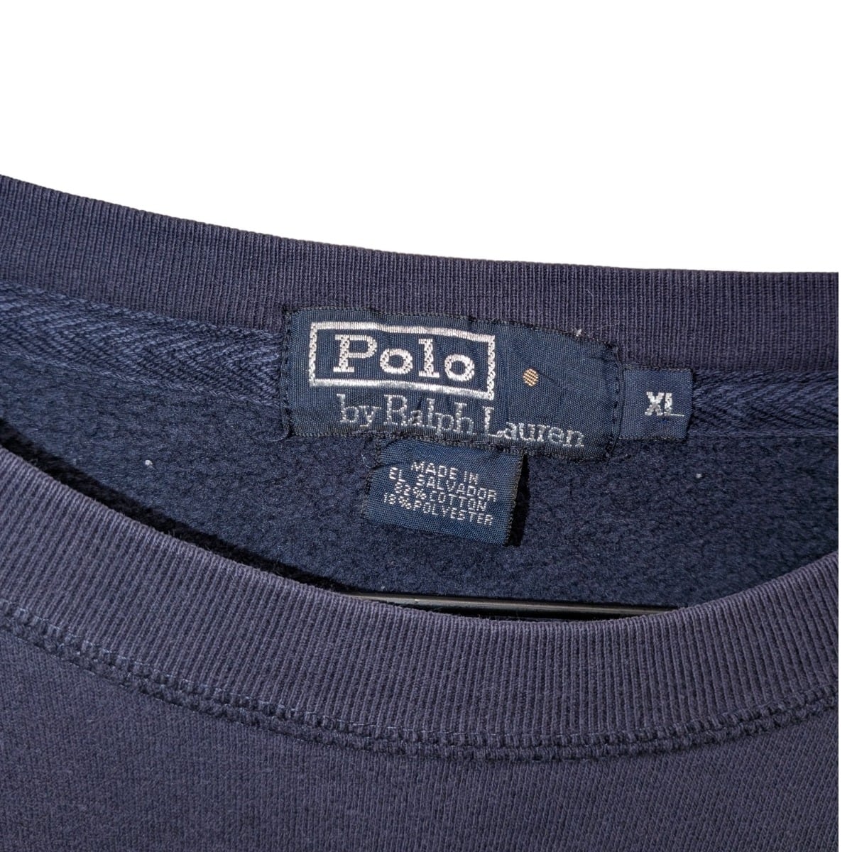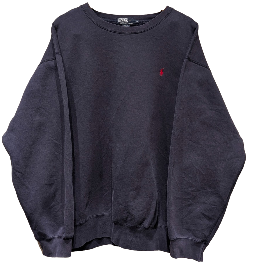 ワンポイントのポニーロゴが映えるクルーネックスウェットは、アメカジ〜プレッピー寄りの定番アイテム。今回の個体はネイビーのボディに赤い刺繍ポニーという王道の組み合わせで、カジュアルに持ち出しやすい一枚。タグは紺地に白枠の「Polo by Ralph Lauren」織ネームと別貼りのサイズタブ、ケアタグにて "Made in El Salvador"・50% Cotton / 50% Polyester 表記が確認でき、これらから1990s〜2000s期の量産ラインの流れを汲む作りと推定される(推定の根拠: 織ネーム仕様、素材比率、生産国の組合せ)。裏地はループバック(パイル状)で保温性より着心地重視の仕様。過度にヴィンテージ寄せはしておらず、あくまで普段使いの良品感が残る個体。
