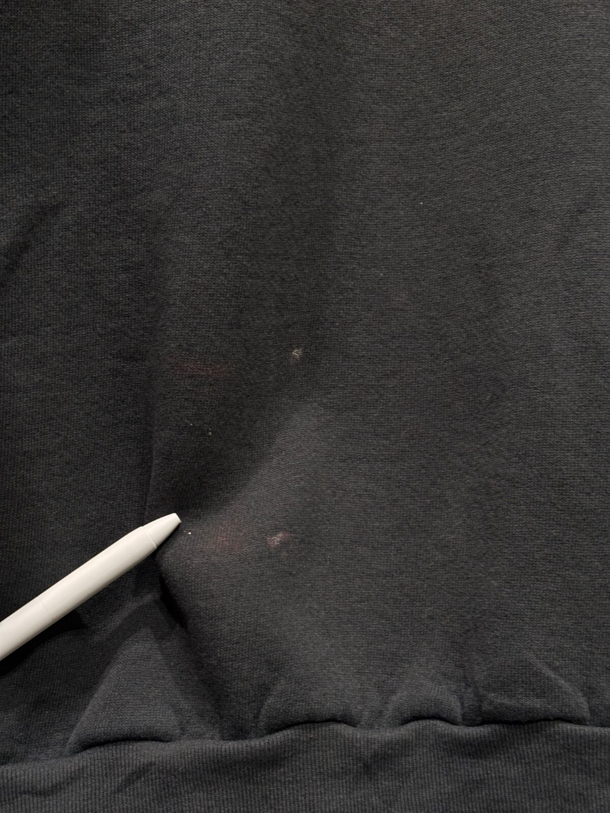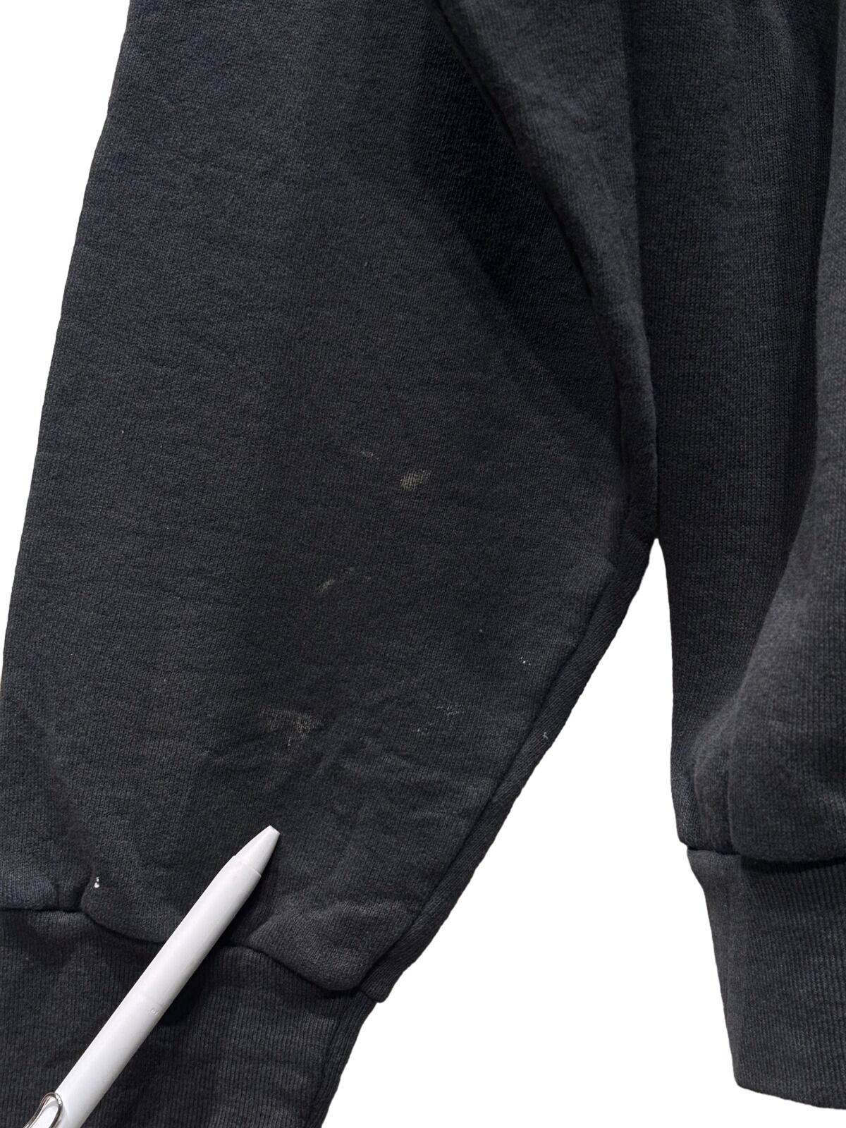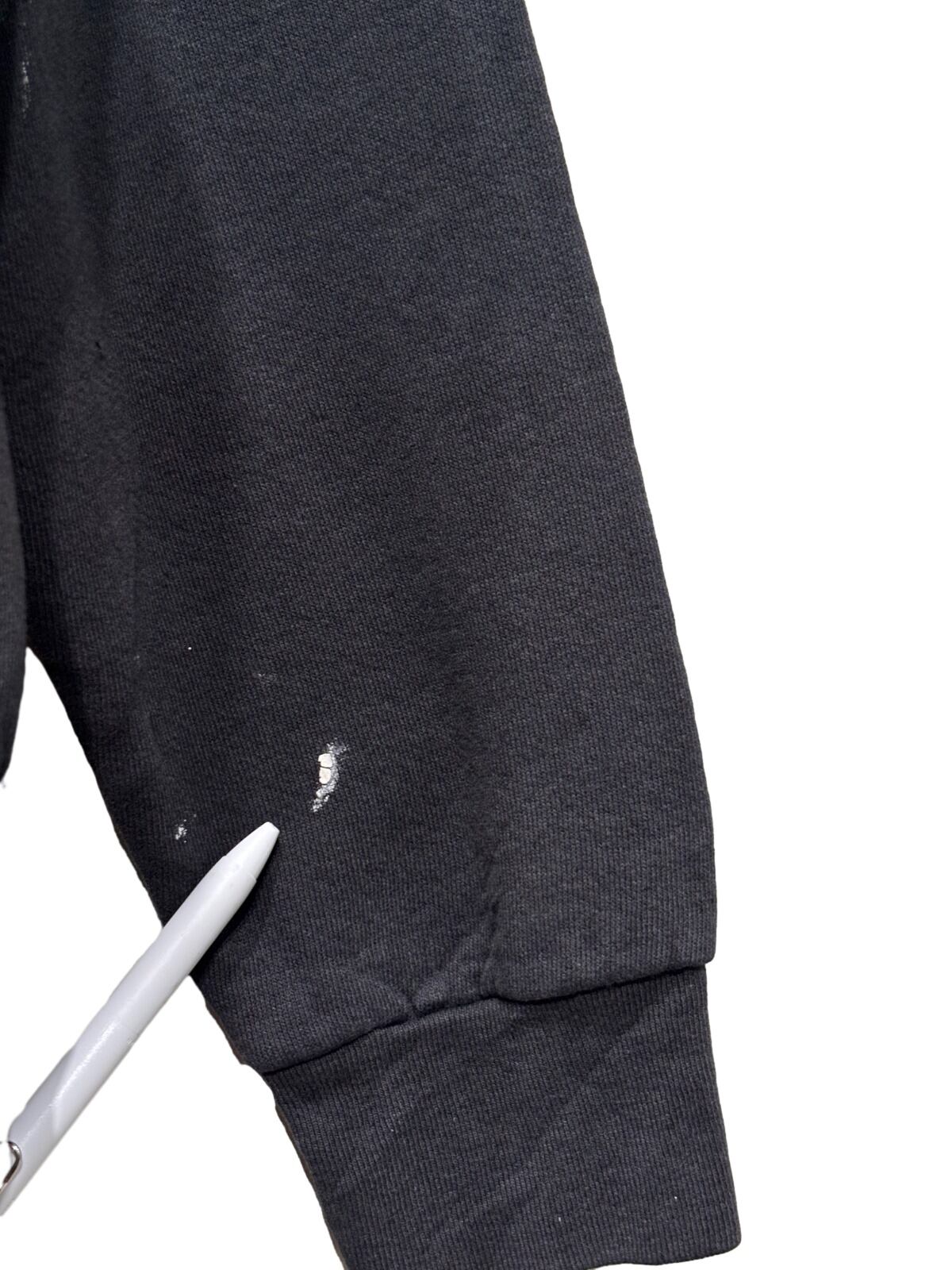 ややドロップショルダー気味のリラックスシルエットで、裏は起毛がありミドルウェイトの着心地。襟は詰まったクルーネックのリブ仕様で、フロントは小さめのロゴ、バックに大きな業者プリントというバランスが特徴。袖口〜袖にかけて複数の白いペンキ飛び、身頃には小さな色抜けや小穴、全体に使用に伴うフェード感が見られ、着込んだワーク感がそのままスタイルになる個体です。