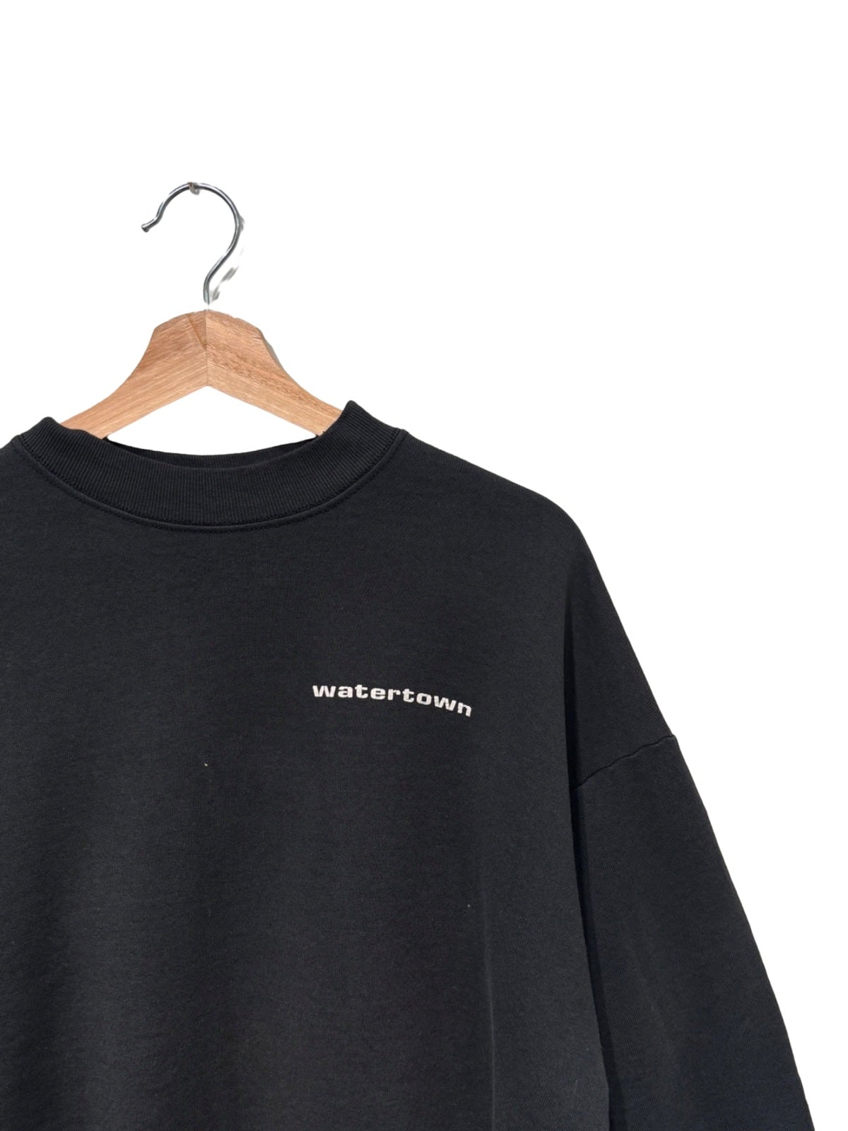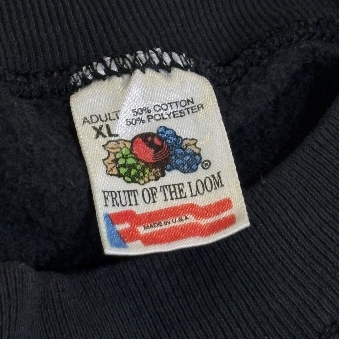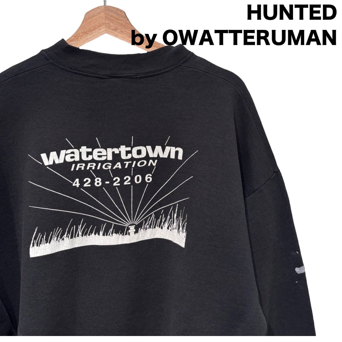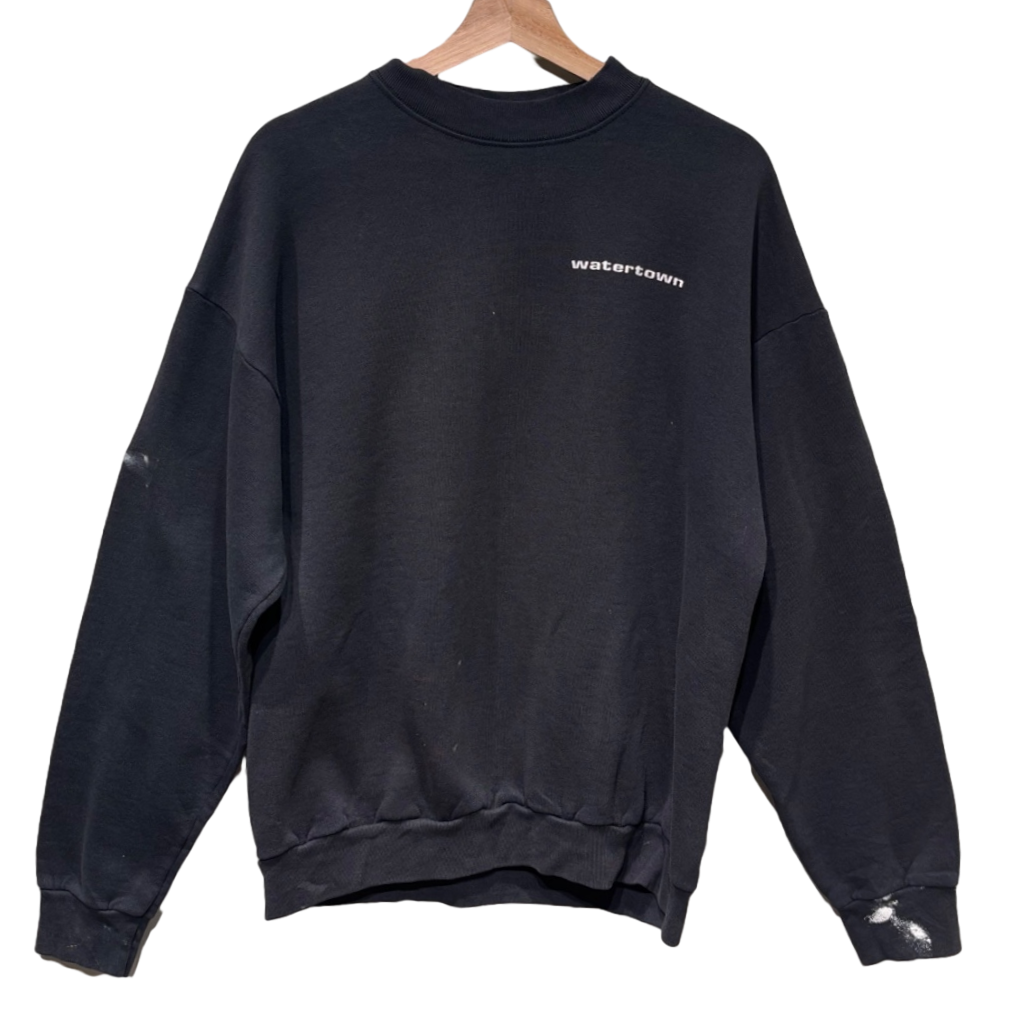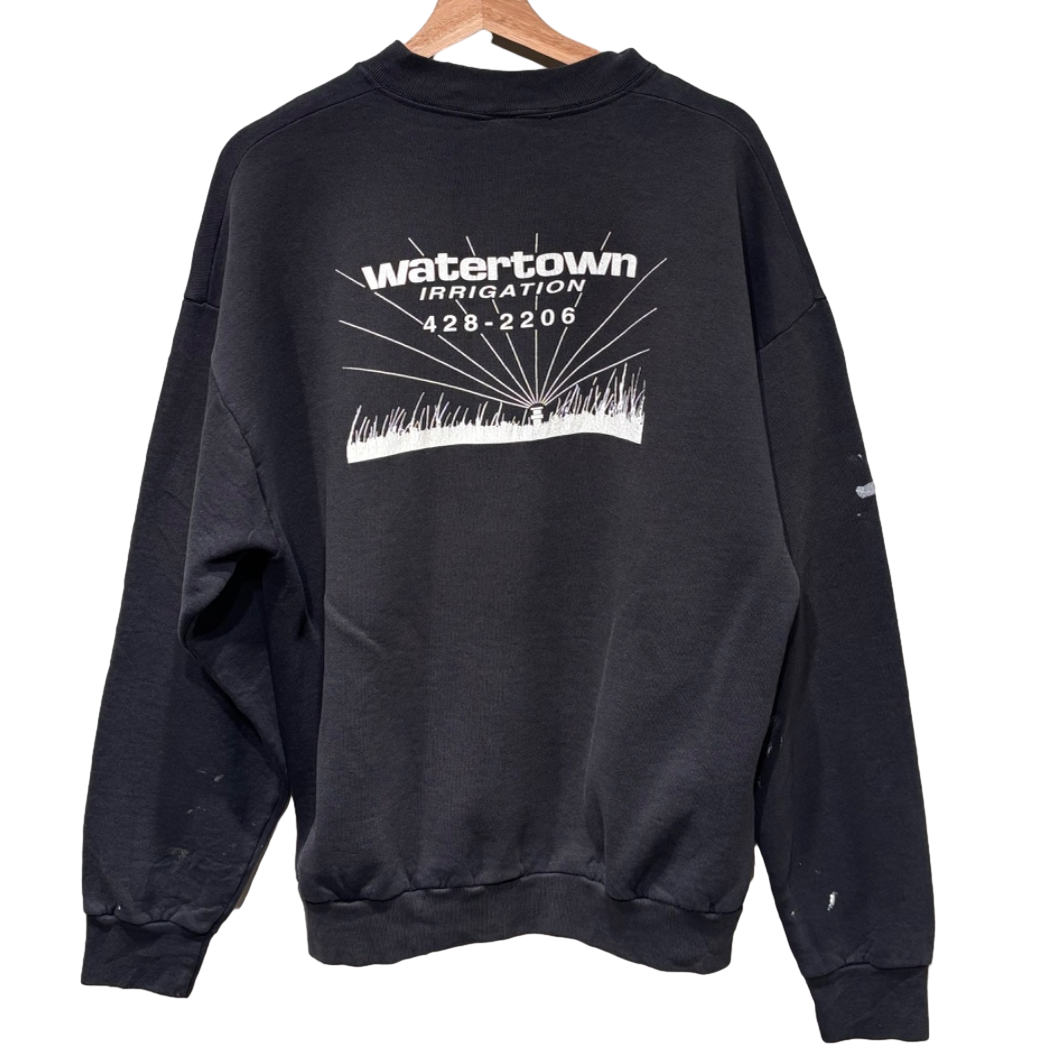 胸の小さなロゴと背中の大きな業者系プリント("watertown IRRIGATION 428-2206")は、地元の設備業者やショップの配布物として作られるプロモーショナルスウェットの典型的な仕様です。ボディのタグはFruit of the Loomで、50%コットン/50%ポリエステル、Made in U.S.A.表記があるため、量産されたブランクボディに業者プリントを入れた90s頃の作りと推定します(確定情報ではなく推定です)。着込まれた雰囲気と袖・袖口の白いペンキ飛びがワークウェアとしての実使用感を感じさせます。