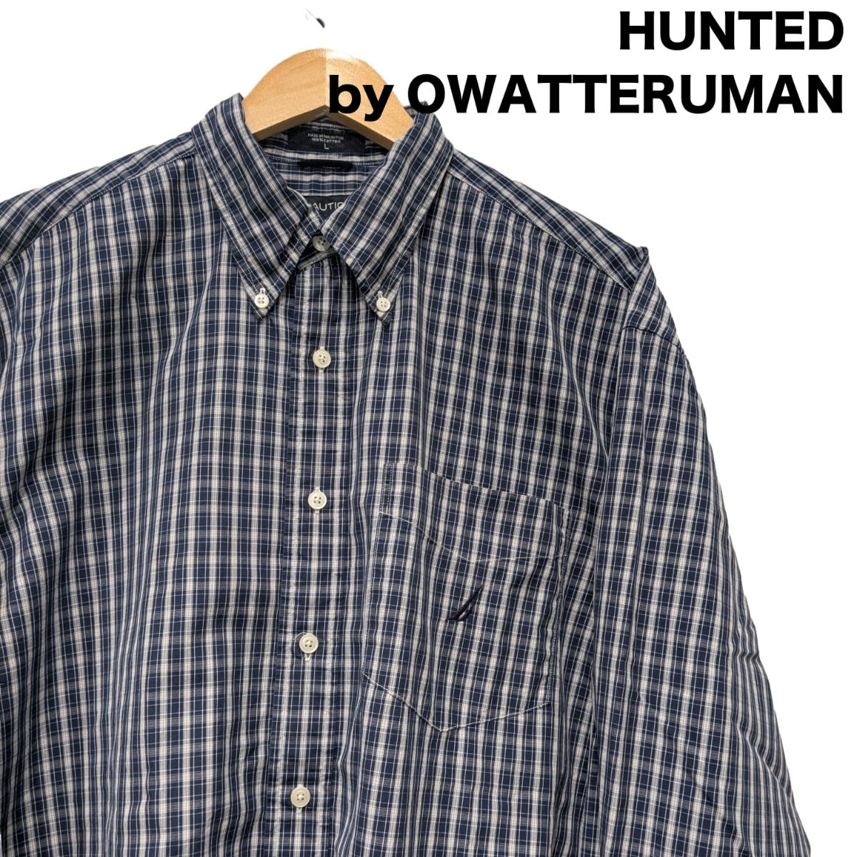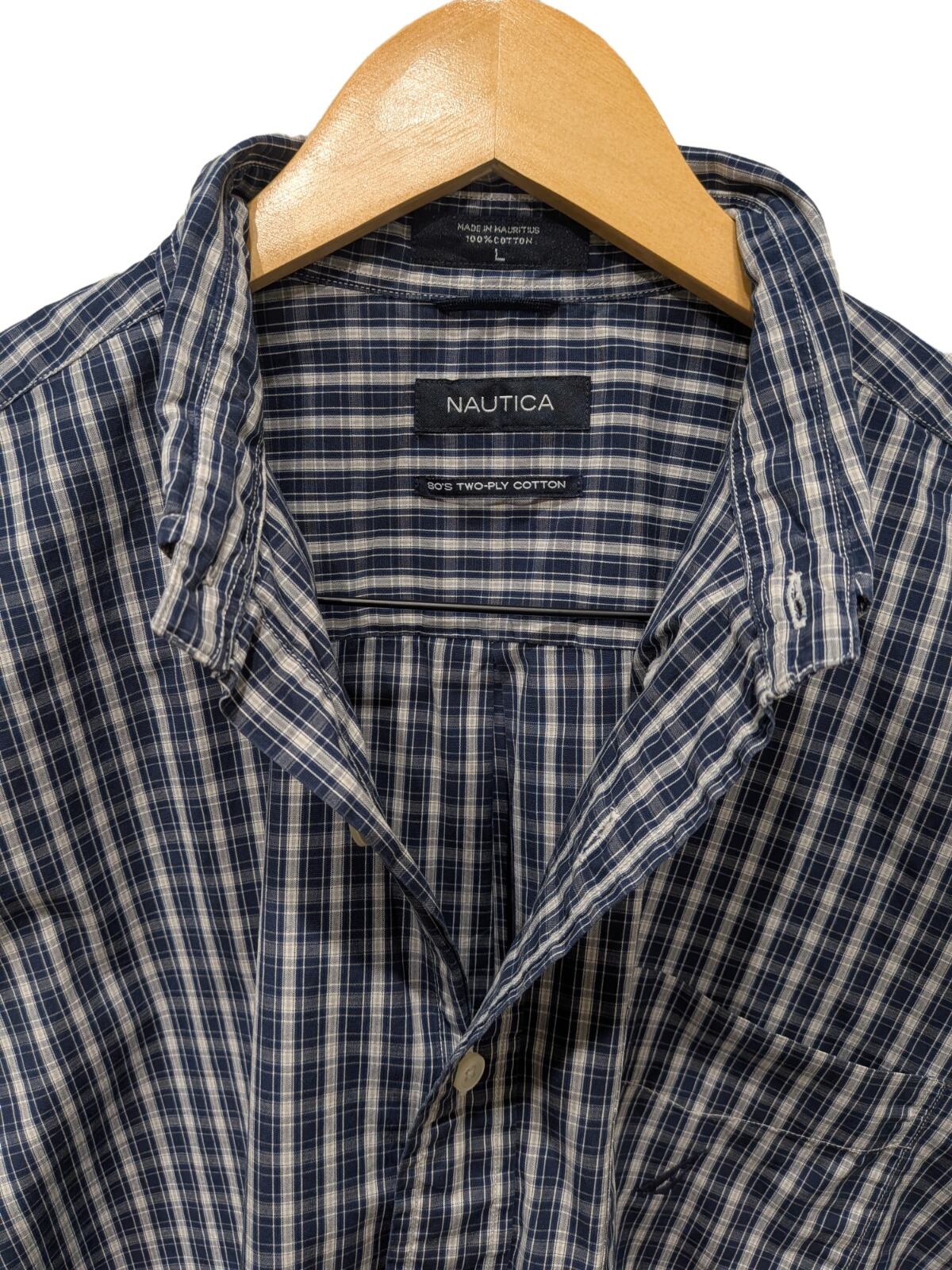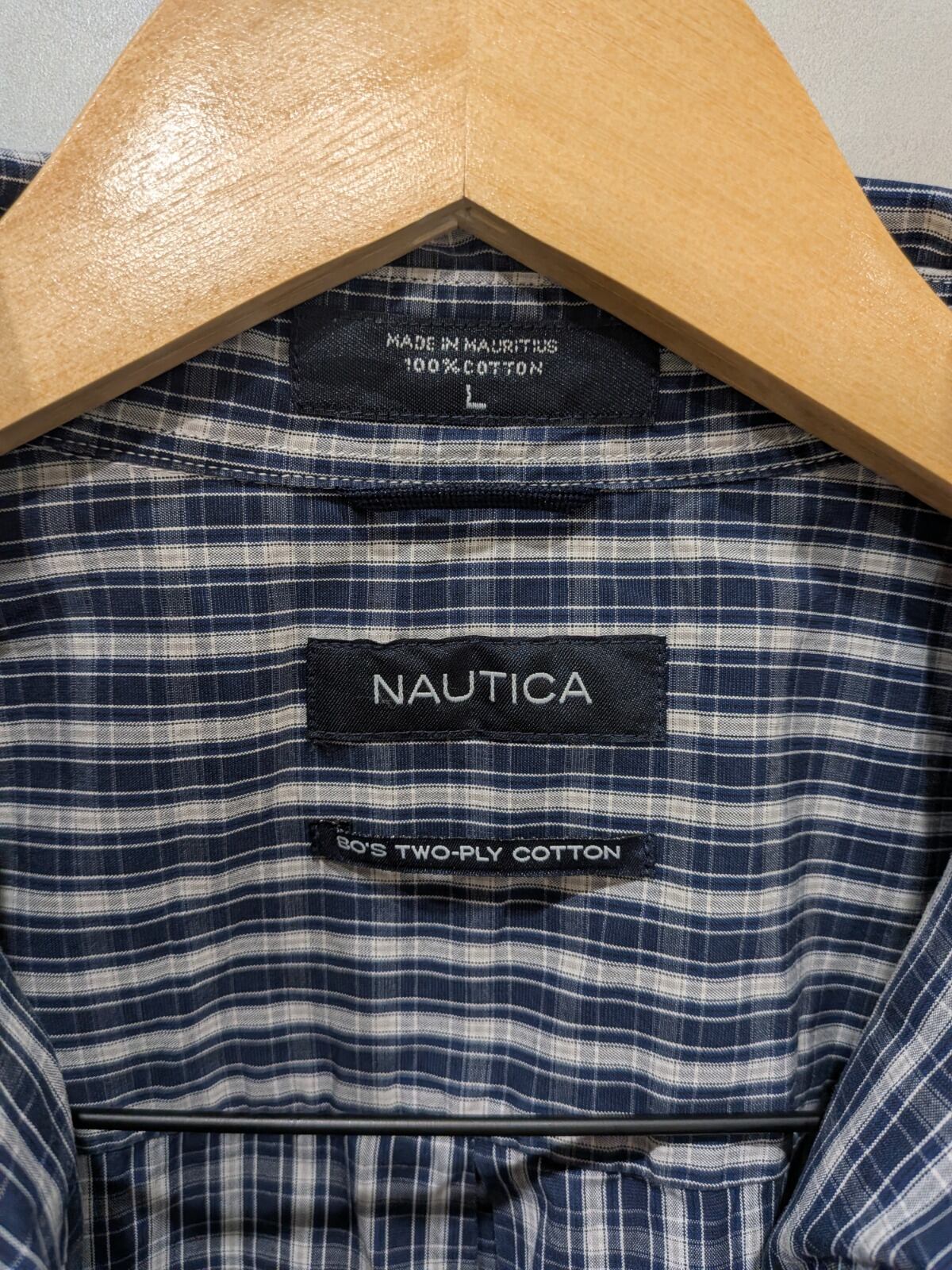 フロントはボタンダウン仕様で襟の形が崩れにくく、胸ポケットのさりげないブランド刺繍と内側のNAUTICAタグがアクセントになっている。