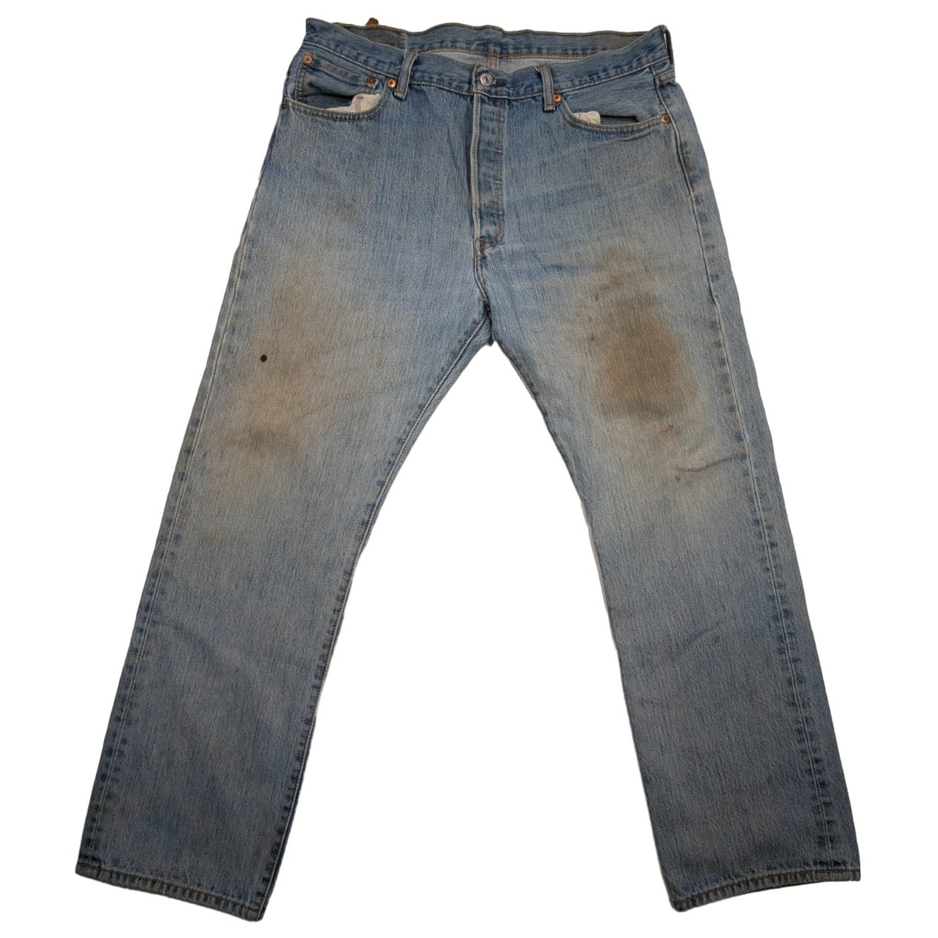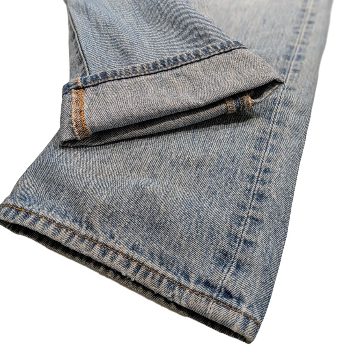 股上はやや深めでヒップ〜太ももにゆとりがあり、裾に向かってまっすぐ落ちる王道のストレートシルエット。生地は厚手のコットンでしっかりした質感、ボタンフライと革パッチ、赤タブといった伝統的なディテールを保持しているため、履き込むほど雰囲気が出る作りです。フロント太もも〜膝あたりに複数の汚れ(茶色のシミ、黒い点状の汚れ)が見られ、使用感が強めに出ています。裾幅は約21cmでスニーカーから革靴まで合わせやすいバランスです。
