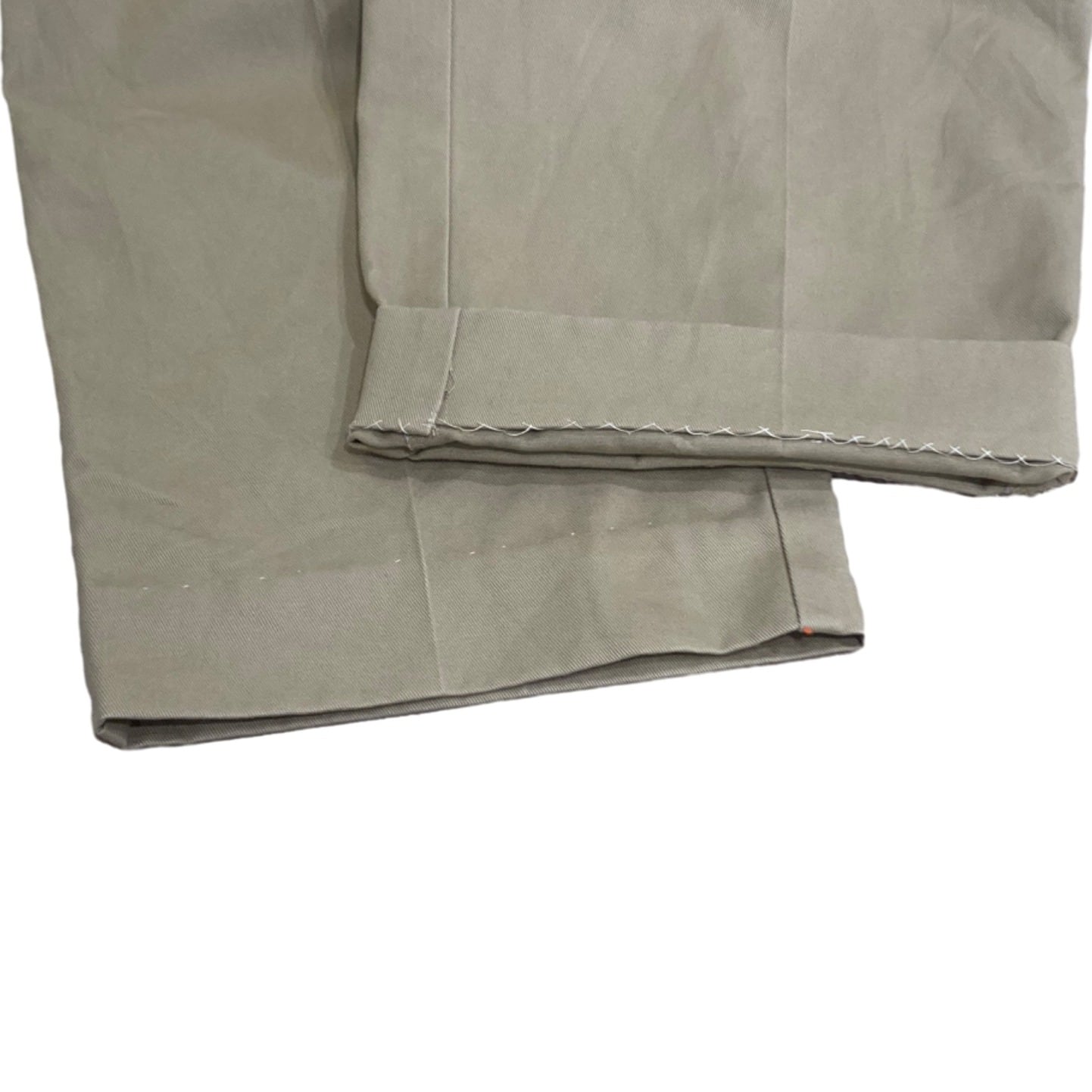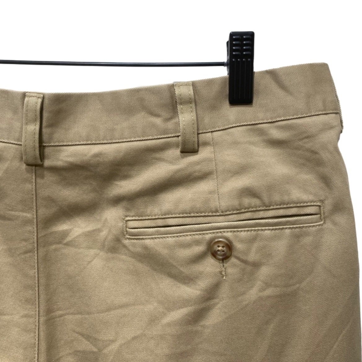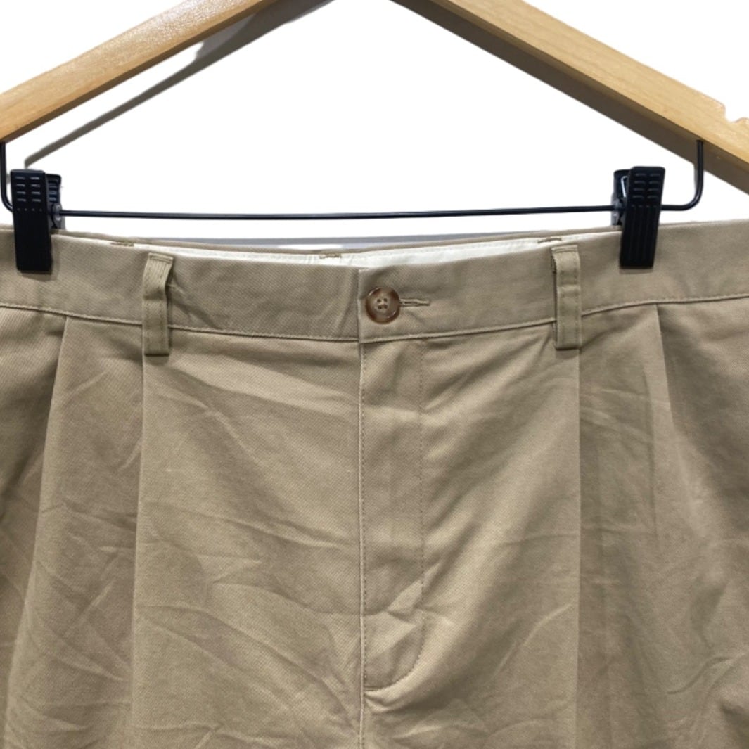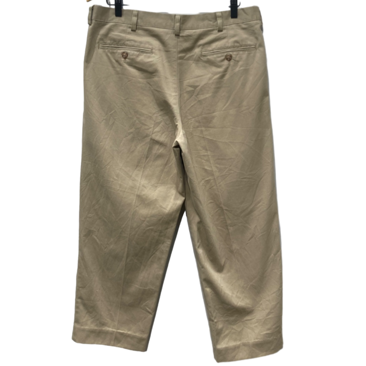 ツータック入りのチノは、ワーク由来の機能性を残しつつドレス寄りにも振れるバランスで長く使われてきた定番アイテム。写真の個体はフロントに深めのプリーツ(ツータック)、バックは片玉縁ポケット×2とボタン留めというクラシックな作りで、オフィスカジュアル〜カジュアルの中間で使いやすい仕様になっている。タグや内側の製造表記が確認できないため厳密な年代は不明だが、プラスチックボタンや機械縫製の仕様から2000年代以降の量産品と推定できる(推定のため確定は不可)。裾には手縫いのしつけ糸や補正跡が見られ、裾直しが入っている可能性あり。