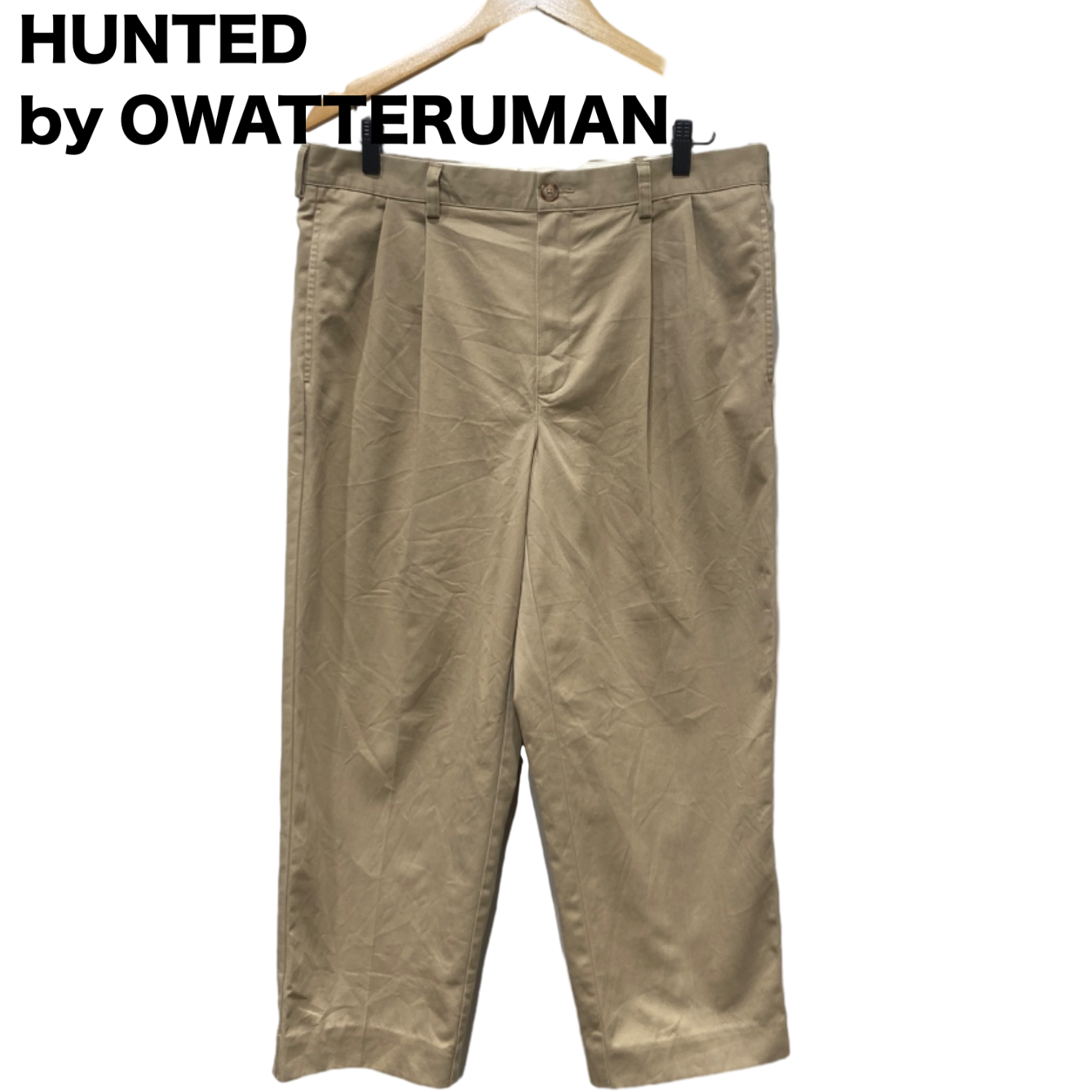 腰まわりに余裕を持たせるツータックと、裾にかけてやや絞られるシルエットで、ゆったりめの腰〜腿感から自然にテーパードするタイプ。素材は程よくコシのある綿ツイルで、着込むほど馴染む作り。バックの片玉縁ポケットとボタンはきちんとした印象を残すので、スニーカーで崩すだけでなくローファーやドレスシューズとも合わせやすい。裾にはしつけや補正跡があり、本来の丈感より短めに調整されている可能性があるため、裾直し前提やロールアップ前提のスタイリングと相性が良い。