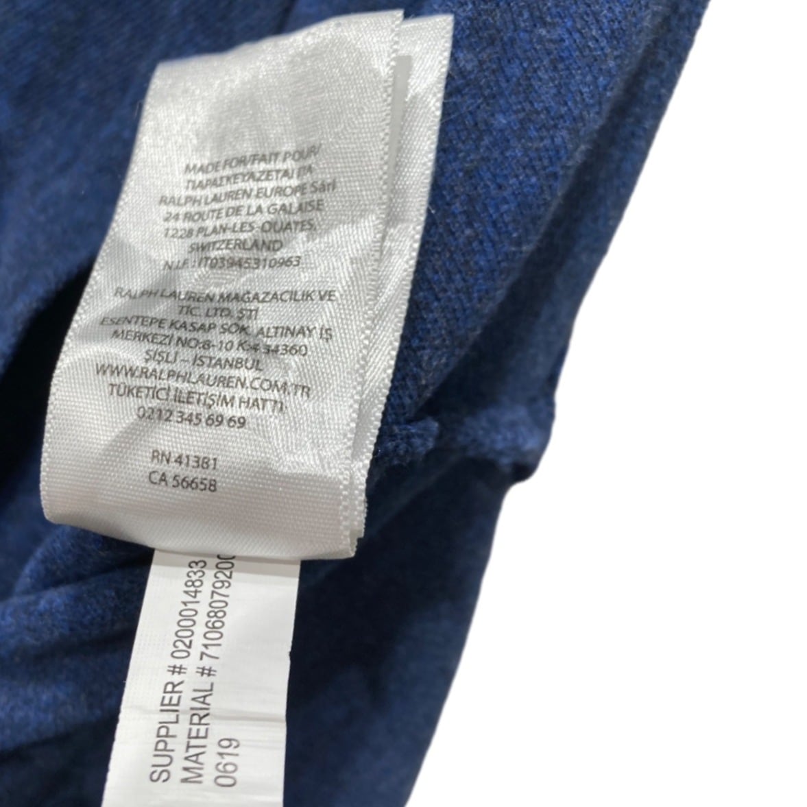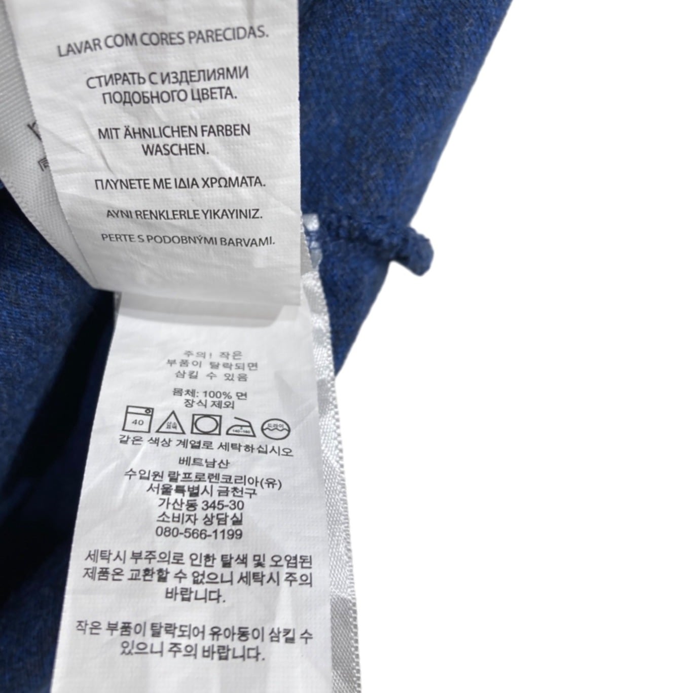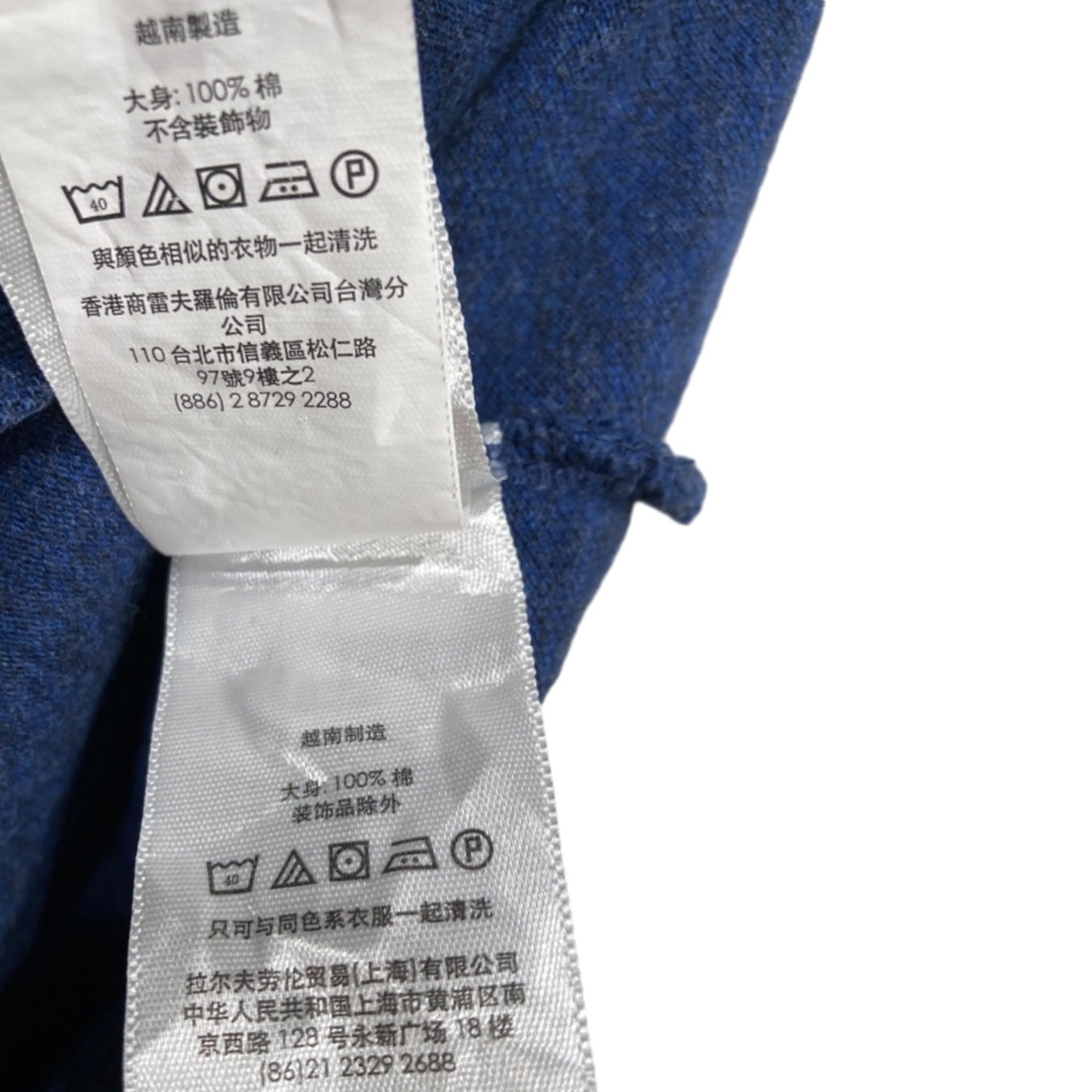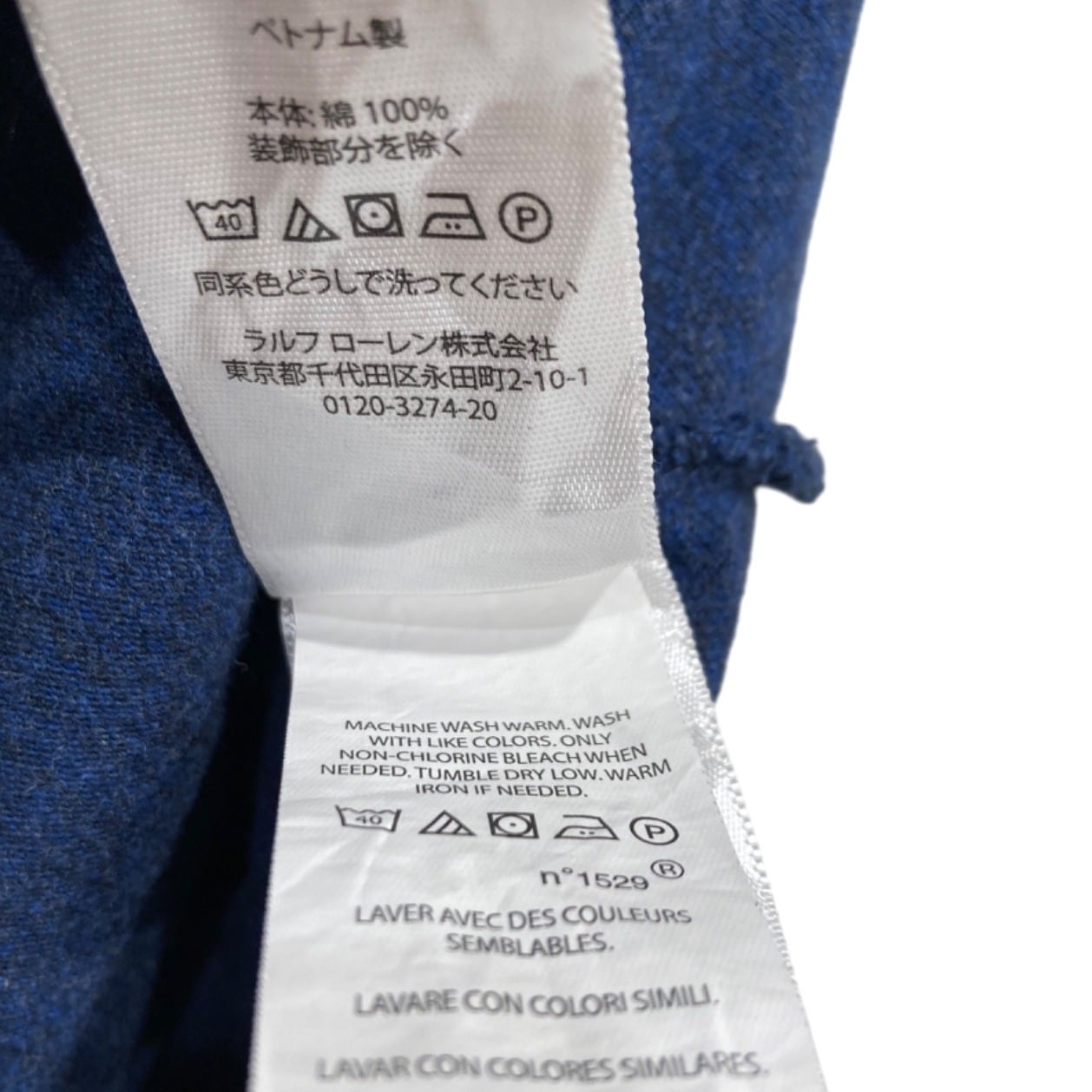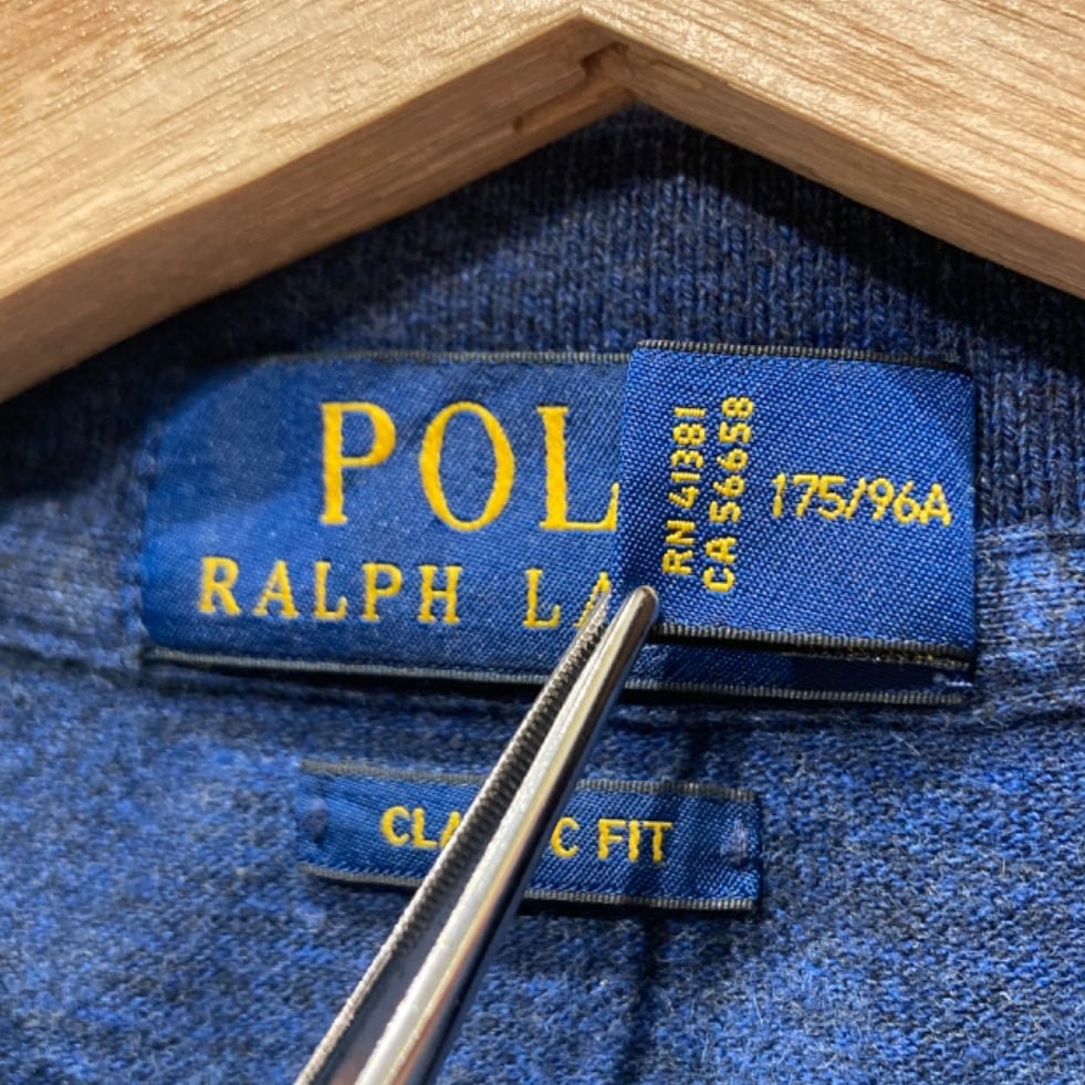 ラルフローレンの長袖ポロはプレッピー〜アメカジの定番で、季節の変わり目のレイヤードにも使われるアイテム。この個体はネイビーヘザーのコットンニットで、内側のケアラベルに「100% COTTON」「MADE IN VIETNAM」、首元タグに「CLASSIC FIT」とあることから、2000年代頃の生産の可能性が高いと推定されます(推定の根拠:生地表記・生産国表示・クラシックフィット表記)。胸の赤いポニーロゴ刺繍はブランドのアイコンで、カジュアルな着こなしのアクセントになります。