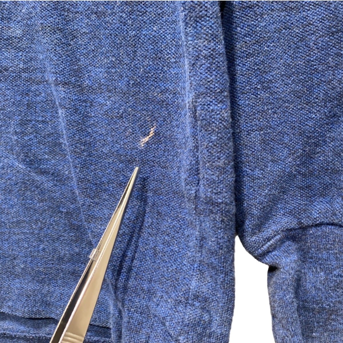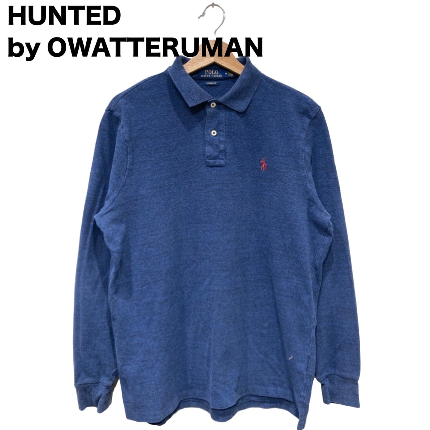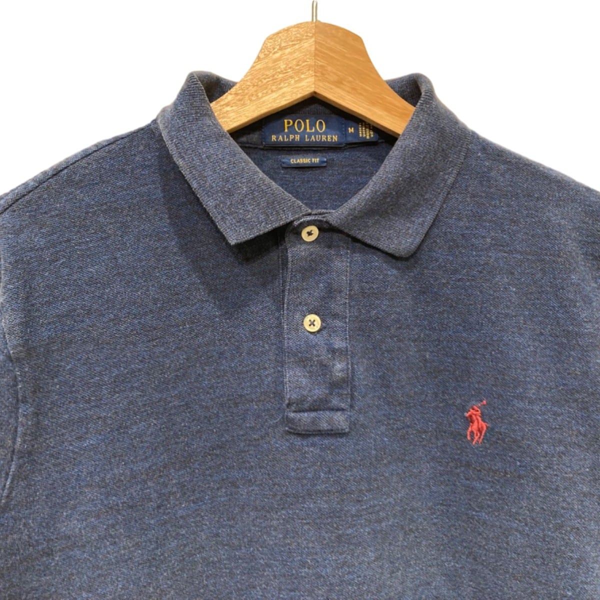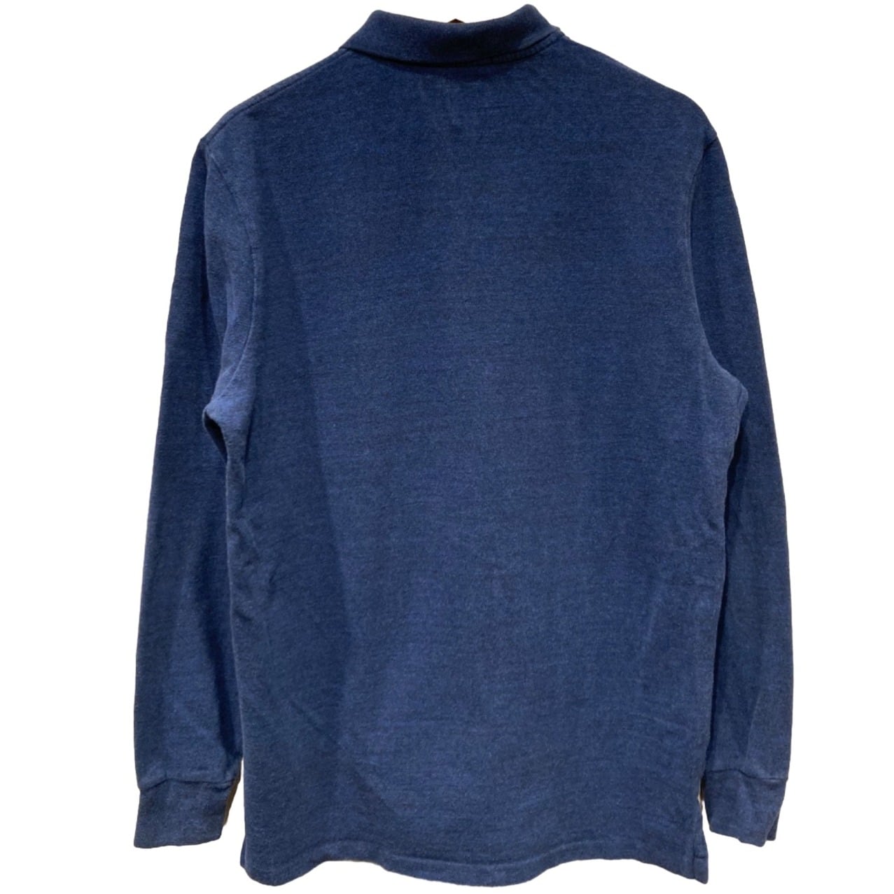 ややゆとりのあるクラシックフィットの長袖ポロ。厚手すぎないコットンニットで、表面はヘザー調の杢見え、柔らかい手触りが特徴です。フロントは2つボタンのプラケット、左胸に赤いポニーロゴ刺繍。裾はサイドにスリット入りで重ね着の際にも収まりが良い作りです。状態としては全体に軽い毛羽立ち・使用感があり、右腹あたりに写真で確認できる小さな引っかけ(白い糸の飛び)が見られます。大きな破れや汚れは無いものの、コンディションはユーズドである点を理解いただきたいです。