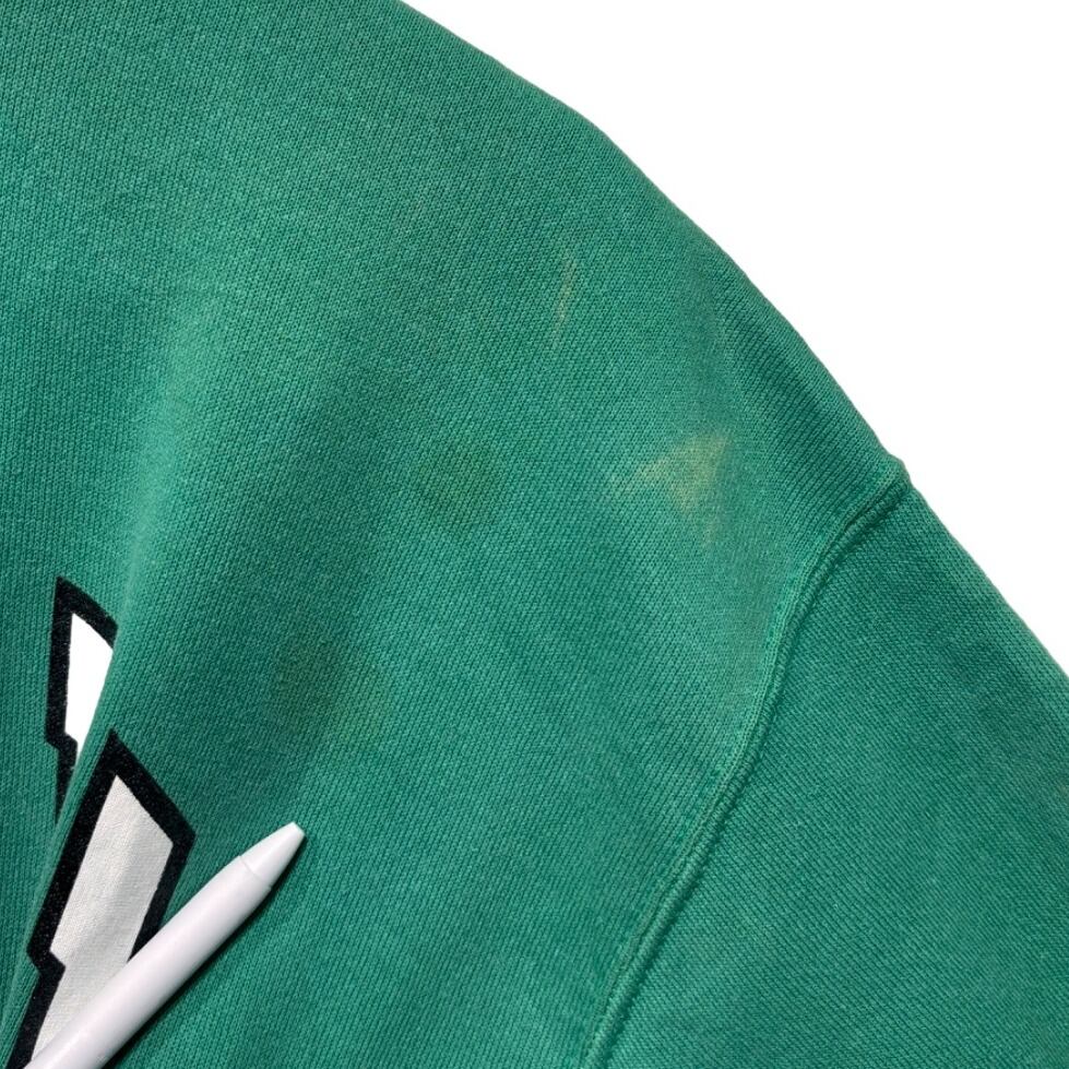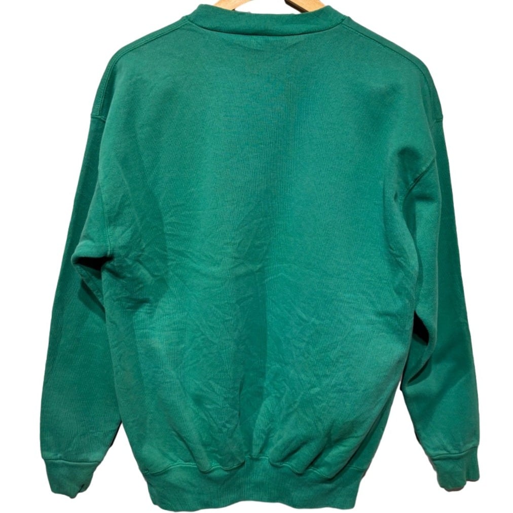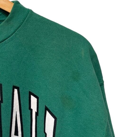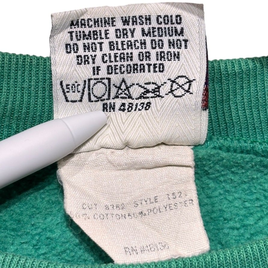 大学名を大きくアーチで配したカレッジスウェットは、90年代のアメリカ学生カルチャーの定番。今回の個体は首元タグに「NUTMEG ATHLETIC DEPT」「MADE IN U.S.A.」記載、ケアラベルにRNナンバー(RN 48138)とコットン/ポリエステル表記、裏起毛の生地感が確認でき、製造国表記と作りから90sあたりの生産と推定できる。大判のシールド風プリントはカレッジ系の王道ディテールで、スポーツチームやスクール物の雰囲気をそのまま残している点が特徴。