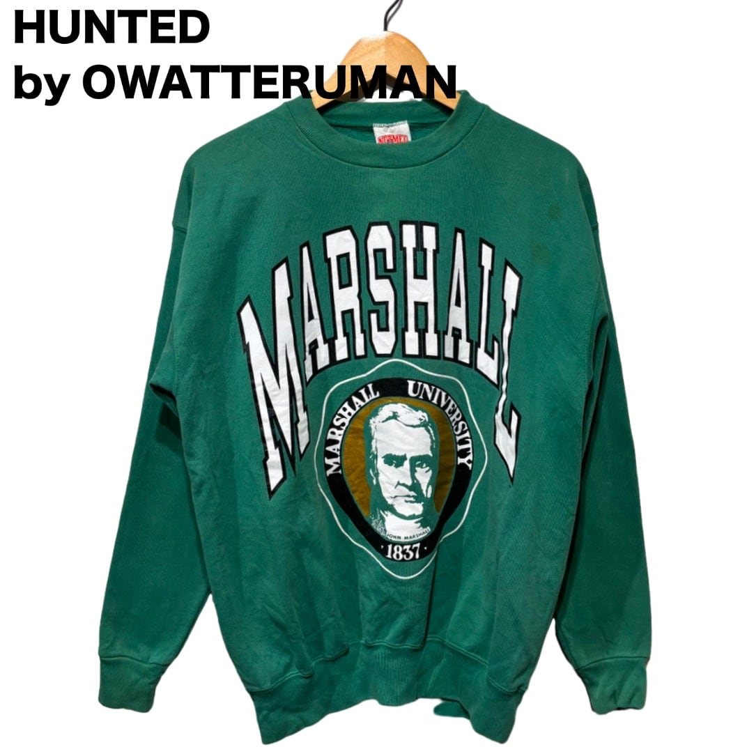 肩が落ちるドロップショルダー寄りのゆったりしたシルエットで、身幅に余裕があるボックス気味の作り。裏起毛の厚手生地で保温性があり、着込んでいくと程よくアタリが出るタイプ。フロントの大判MARSHALLプリントは目を引くアクセントになり、一枚でストリート寄りの存在感を作りやすい。状態としては前面肩〜袖に複数の薄い黄ばみ・汚れが確認できるため、古着としての使用感あり(画像参照)。リブに大きな伸びや破れはなく、全体的にまだまだ着用可能なコンディション。
