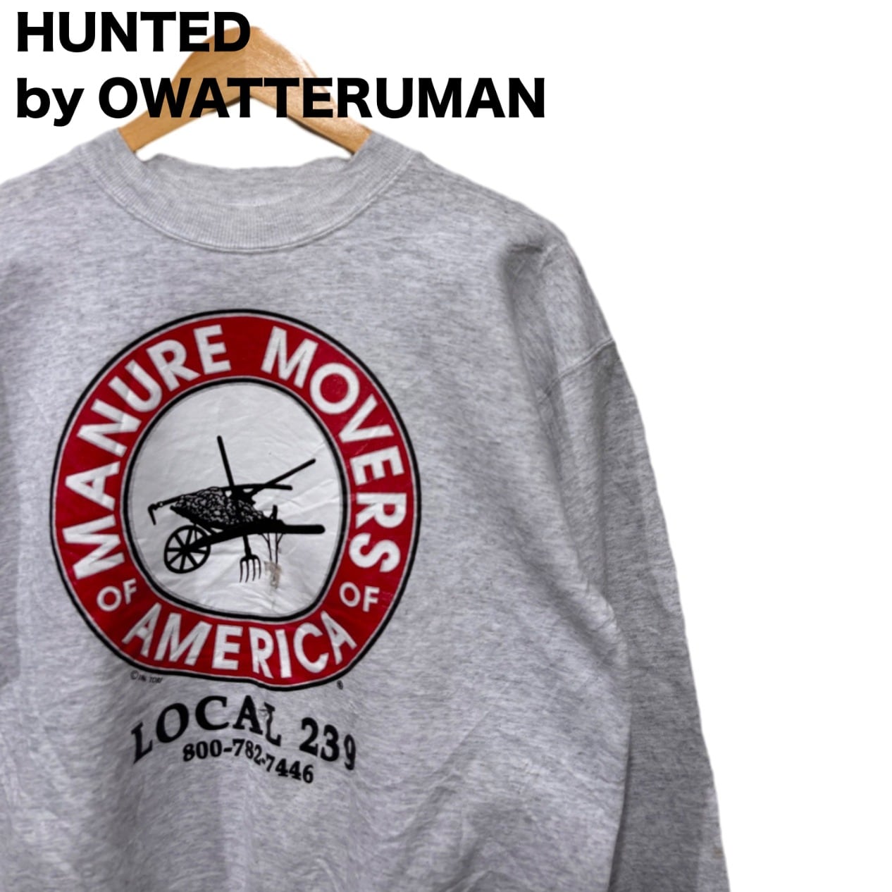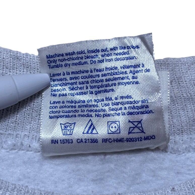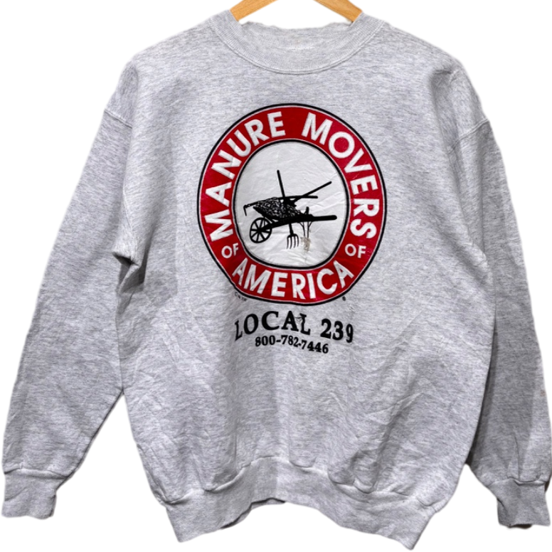 大きめの円形ロゴに「MANURE MOVERS OF AMERICA / LOCAL 239」と入るワーク寄りのグラフィックは、地域組合や業務系イベントのユニフォーム的なプリントで見られるタイプ。タグのHanes "COMFORTBLEND" サテンタグ、50% COTTON / 50% POLYESTER 表記、さらに "USA MADE COMPONENTS ASSEMBLED IN MEXICO" の記載があることから、量産スウェットでよく見られる仕様。タグのデザインと混紡比率から90s頃の生産と推定して扱ってます(推定のため断定表現は避けています)。