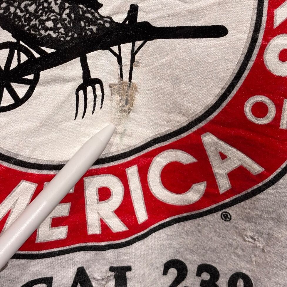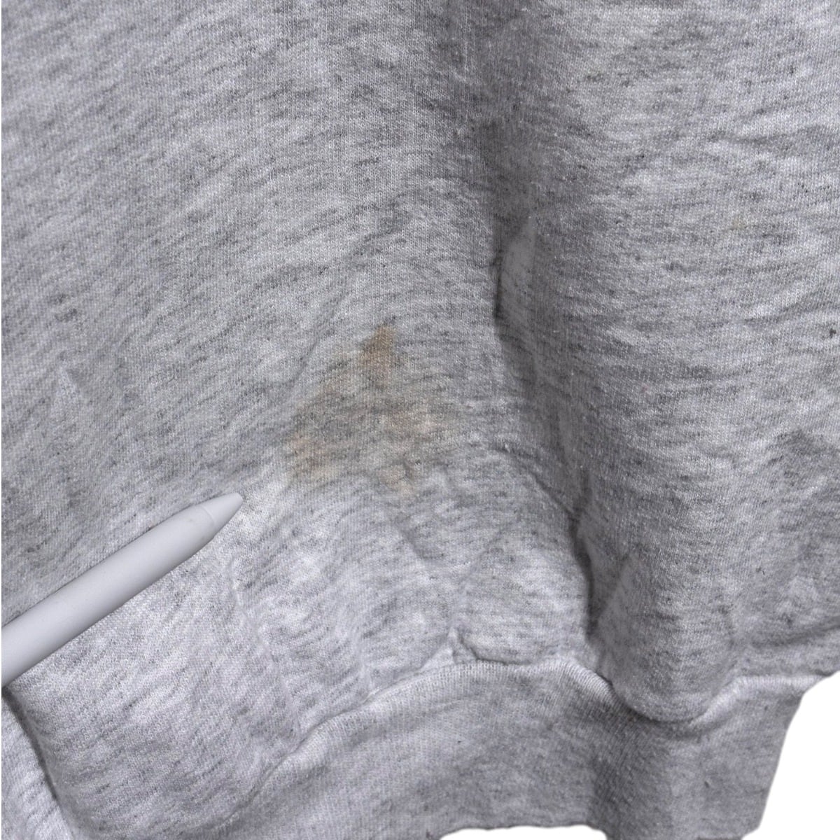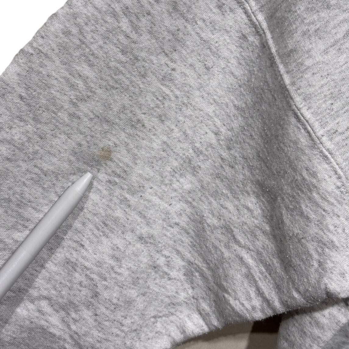 肩線がやや落ちるドロップショルダー気味のボックスシルエットで、着るとゆったりした印象になる一着。COMFORTBLENDの50/50混紡らしい程よい厚みとふんわりした裏起毛で、春秋のレイヤードや冬のインナー使いどちらでも使える汎用性。前身頃中央に大きな円形プリントが入り、ワーク/ローカルユニオンの空気感が強め。状態面ではプリントにヒビ・剥離・一部剥がれがあり(拡大写真参照)、プリント下部およびロゴ周辺に小さな穴(ピンホール)複数、前身頃と背面裾付近に薄い黄ばみのシミが見られるため、ビンテージライクなユーズド感を受け入れられる方向け。