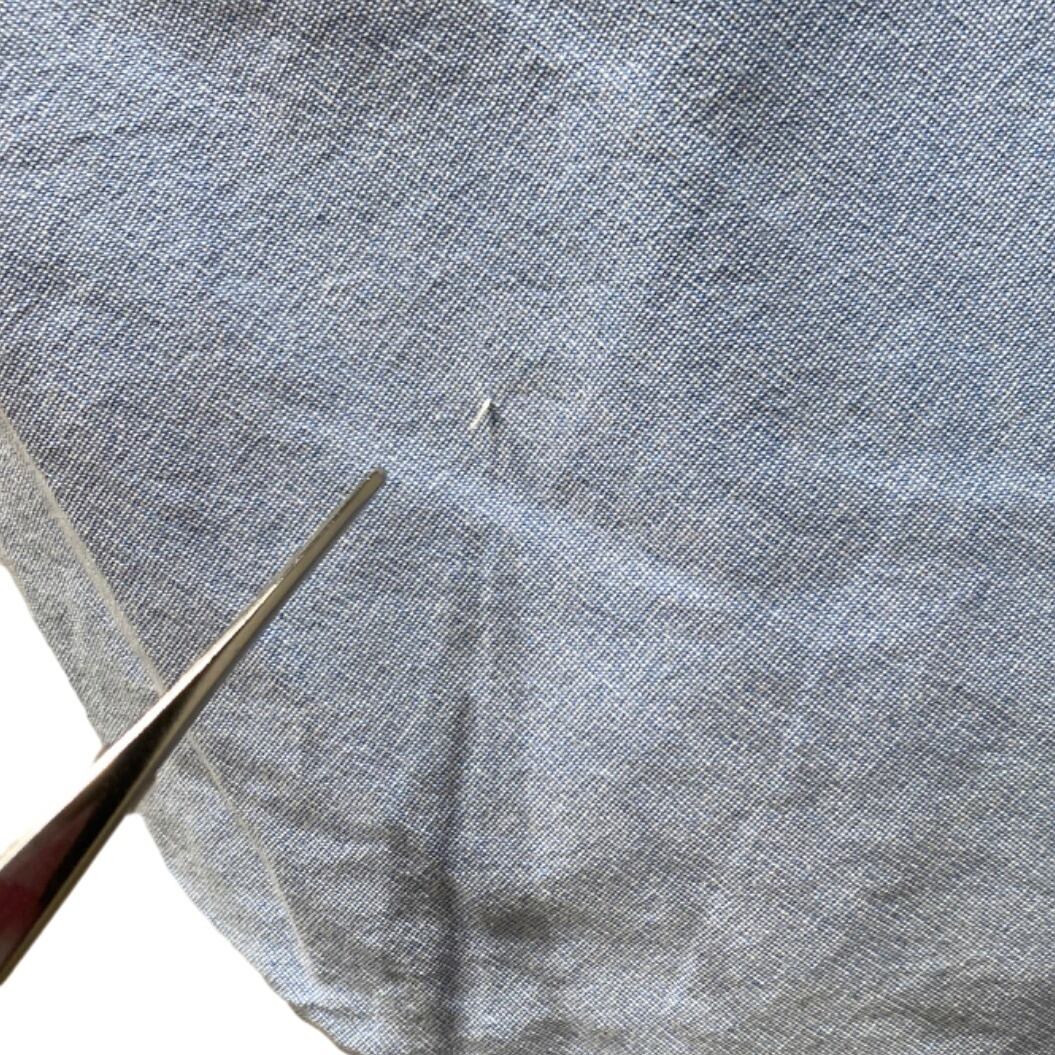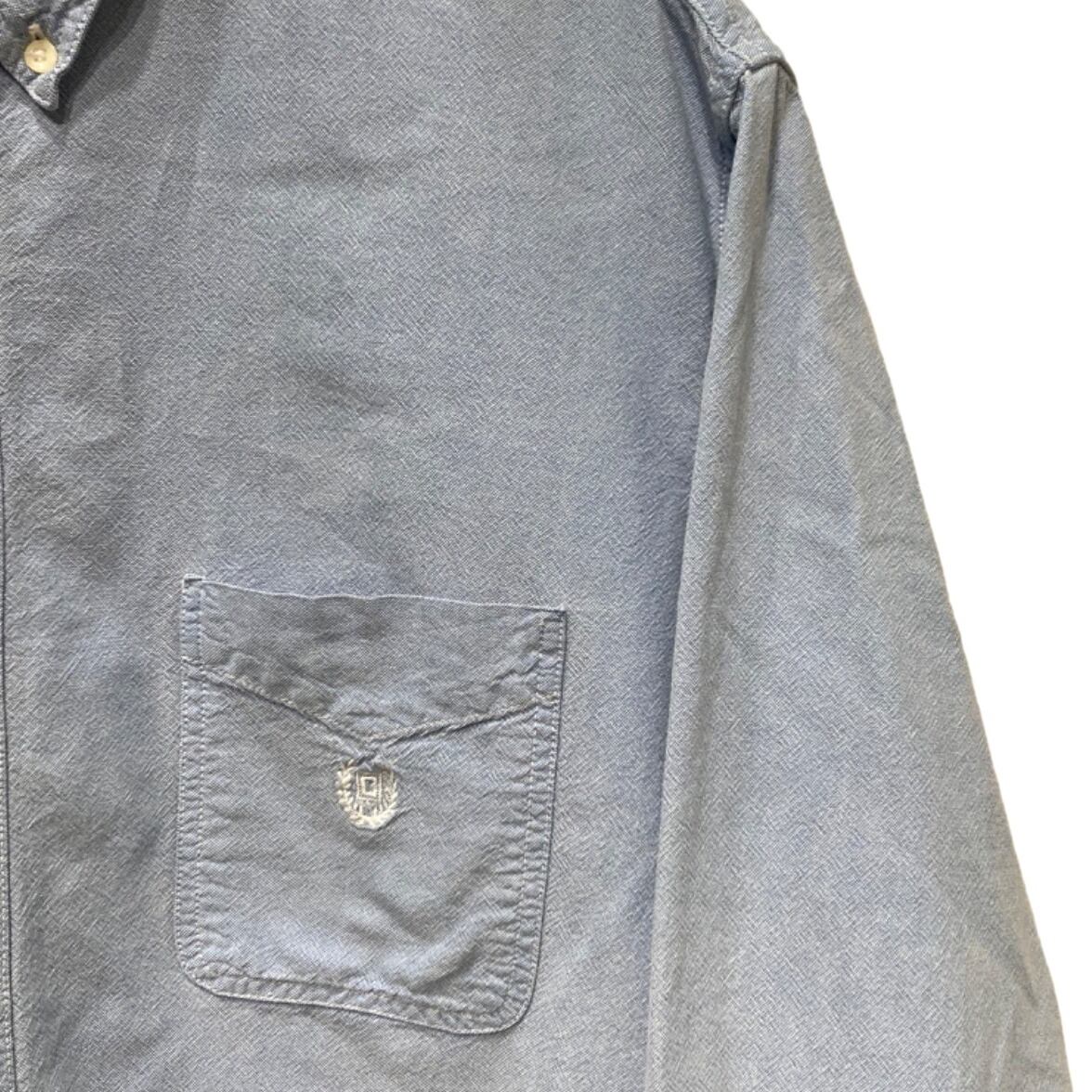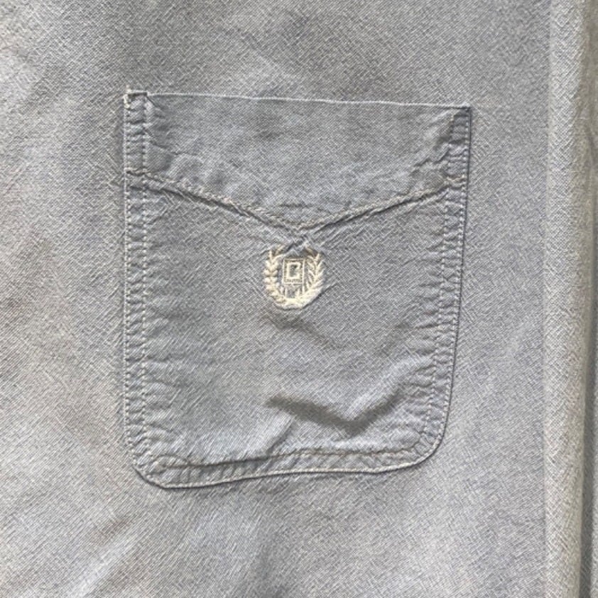 ボタンダウンカラー、左胸のパッチポケットに小さなリース状の刺繍入りというディテールがポイント。生地は近接写真で織り目が確認できるシャンブレー/オックスフォード調で、軽めのトップス感覚で使える素材感。背面はヨーク下にセンタープリーツらしき仕様が入っており、動きやすさを考慮した作り。サイズ表記はXXLのため全体的にゆったりしたシルエットが期待できる。コンディションは概ね使用感ありで、肩付近に小さな点状の汚れ、裾付近に糸の飛び出しや小さなほつれが数カ所確認できる(画像参照)。目立つ破れはないが、状態にシビアな方は画像をよくご確認ください。