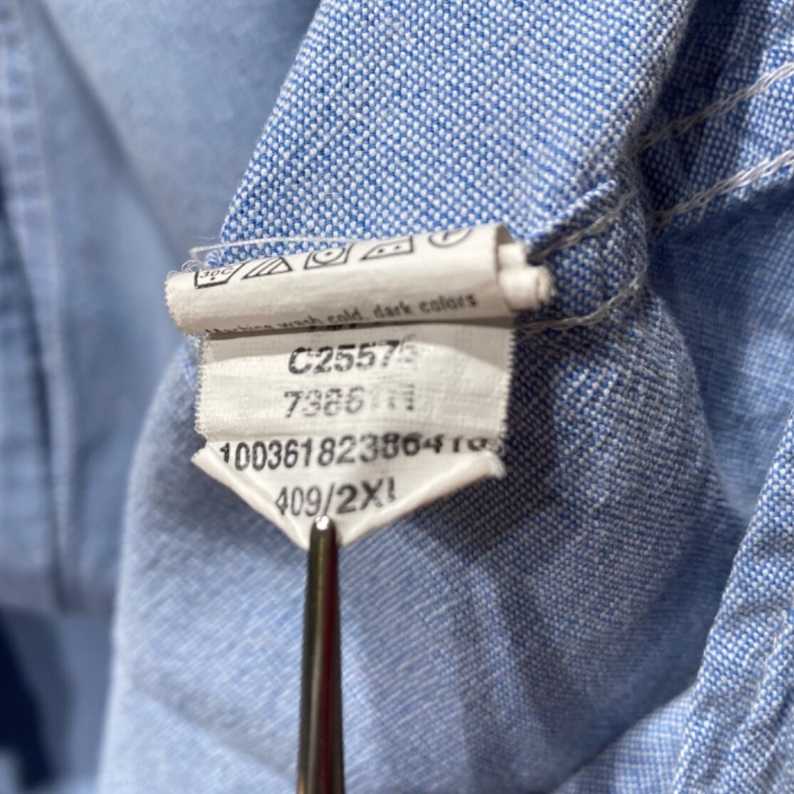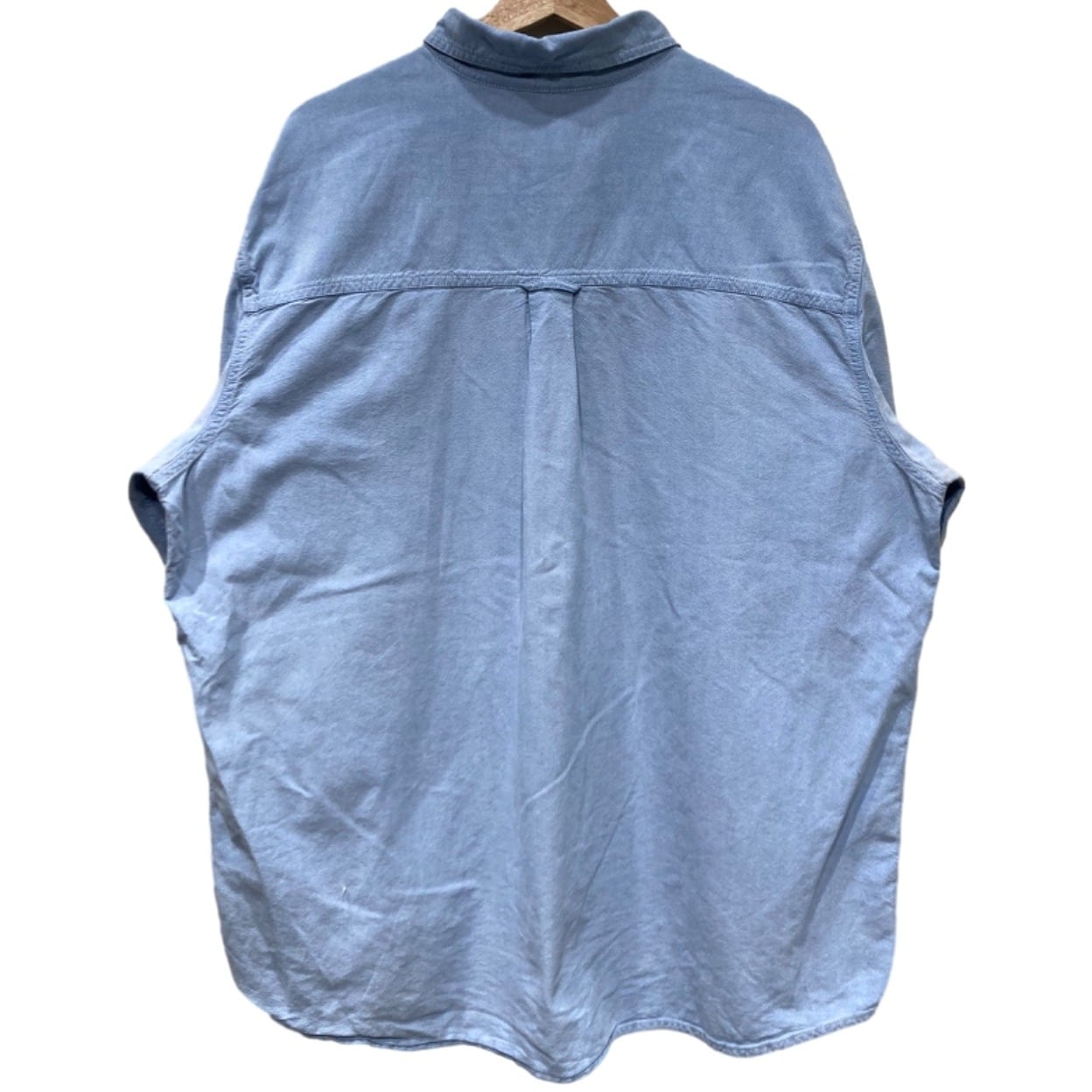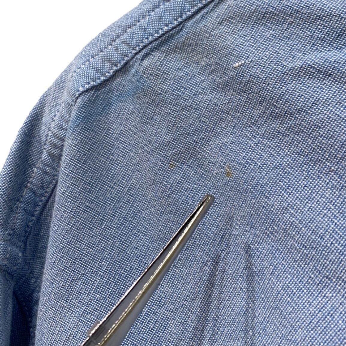 ボタンダウンカラー、左胸のパッチポケットに小さなリース状の刺繍入りというディテールがポイント。生地は近接写真で織り目が確認できるシャンブレー/オックスフォード調で、軽めのトップス感覚で使える素材感。背面はヨーク下にセンタープリーツらしき仕様が入っており、動きやすさを考慮した作り。サイズ表記はXXLのため全体的にゆったりしたシルエットが期待できる。コンディションは概ね使用感ありで、肩付近に小さな点状の汚れ、裾付近に糸の飛び出しや小さなほつれが数カ所確認できる(画像参照)。目立つ破れはないが、状態にシビアな方は画像をよくご確認ください。