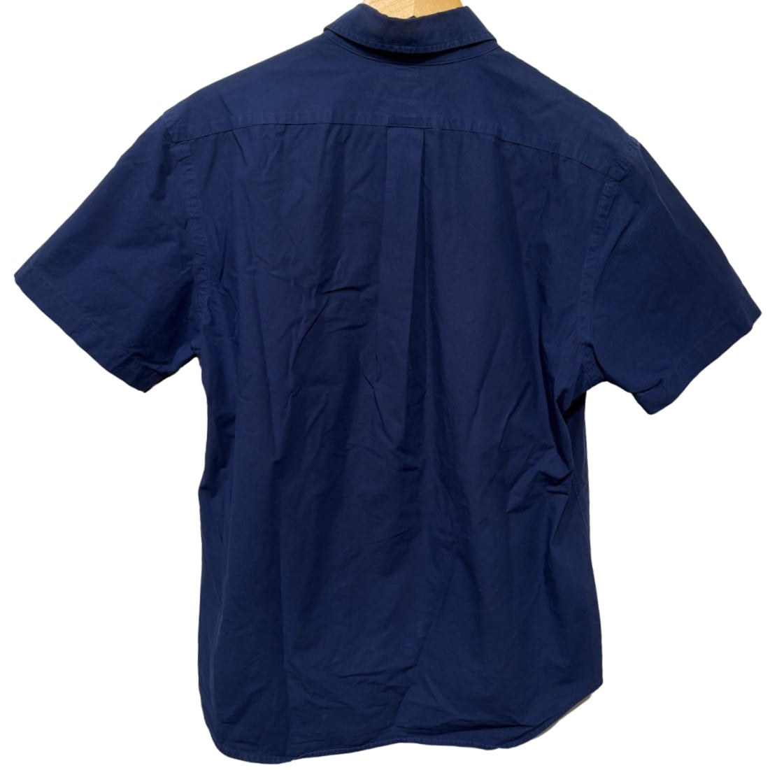 ボタンダウンの衿と程よく絞られたサイドラインが特徴で、背面にセンターボックスプリーツを備えるため動きやすさを確保している作り。綿多めの生地にポリウレタン混のため若干の伸縮性があり、着用中のストレスは少なめ。袖は短めで春夏の単体着用に向き、裾はカーブが付いているのでタックイン・アウトどちらでも使える。胸元のワンポイント刺繍は主張控えめで合わせやすい。