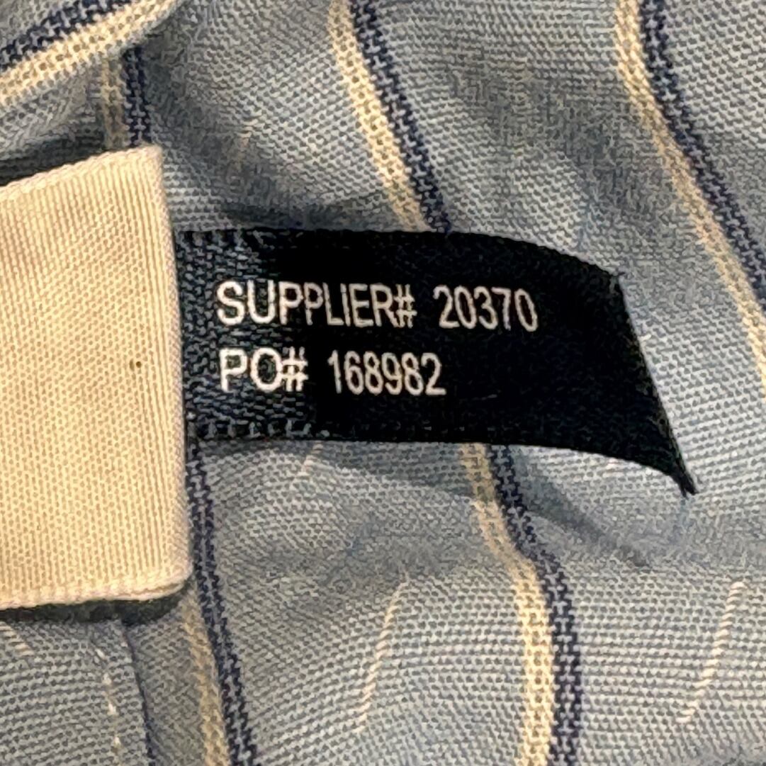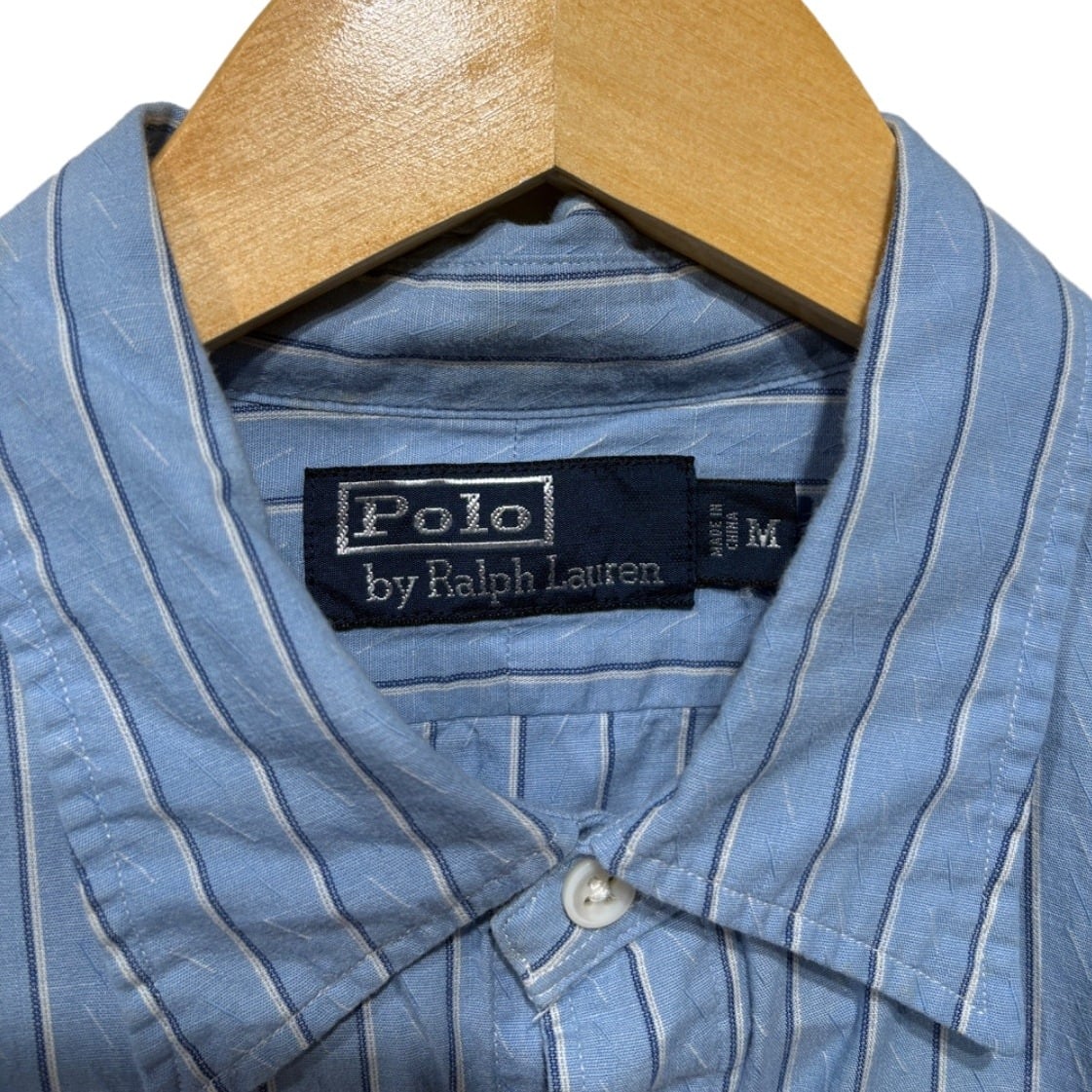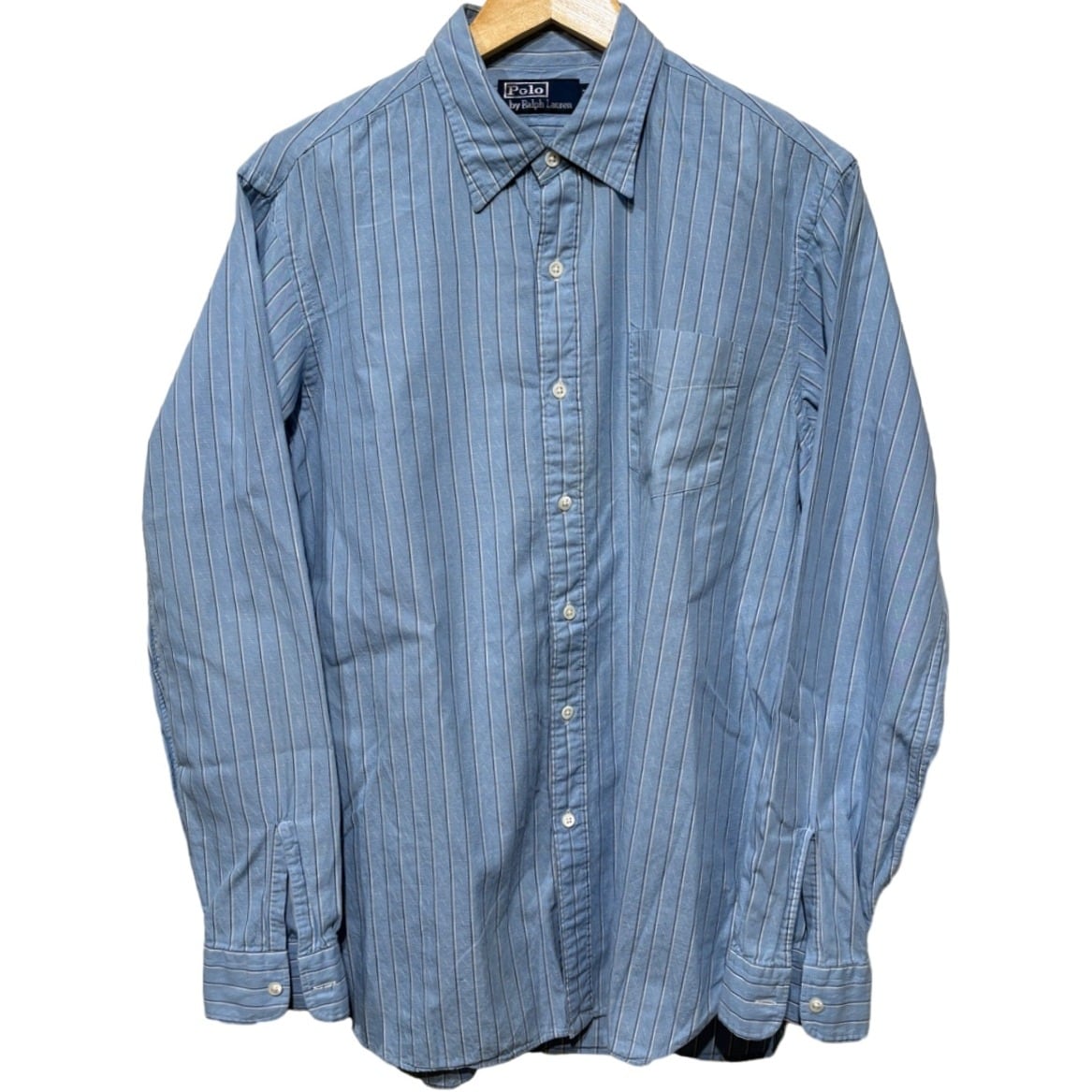Polo by Ralph Laurenのレギュラーなシャツは、プレッピーな着こなしからワークライクなカジュアルまで幅広く使われてきたアイテムです。本品はネイビーの織りネームに銀刺繍のロゴが入るタイプで、サプライヤー#やPO#の小タグ、ケア表記のフォントなど量産期の仕様が見られることから90s頃の製造と推定できます。ライトブルーのストライプと生地のネップ感は、デイリーにラフに使えるシャツとして浸透していた時代の空気感を残しています。