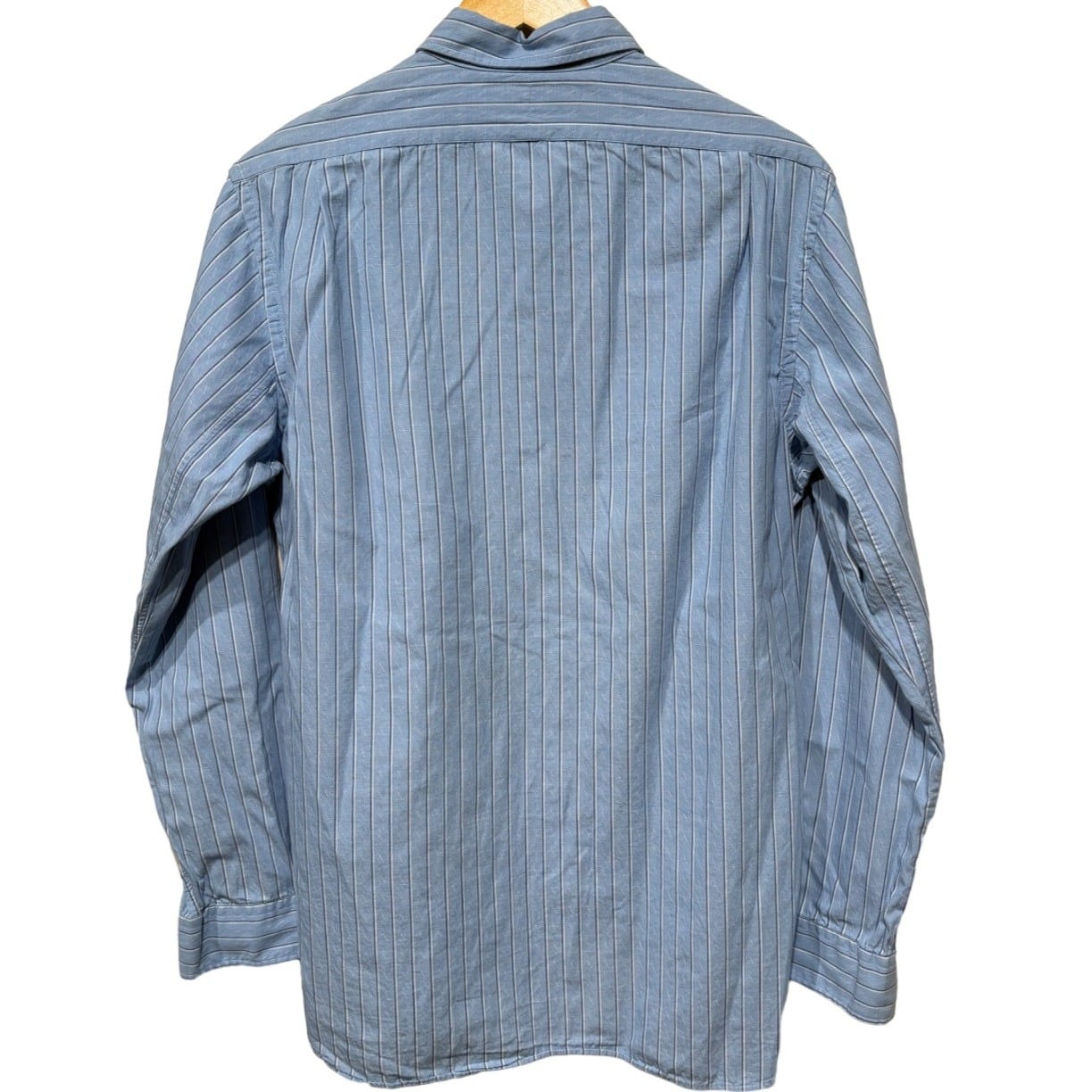 薄手〜中肉のコットンライクな生地で、細めのホワイトピンストライプが縦方向に入るすっきりしたルックス。襟はポイントカラー(ボタンダウンではない)、左胸にパッチポケットが付く基本形。カフはシングルボタンで、裾はラウンドヘム。着丈が80cmと長めで、身幅にゆとりがあるリラックスシルエットなので、1枚で着てもインしてもバランスを取りやすい作りです。画像で確認できる範囲では全体に使用によるシワ感や生地の寝が見られるものの、目立つダメージや大きな汚れは確認できません。